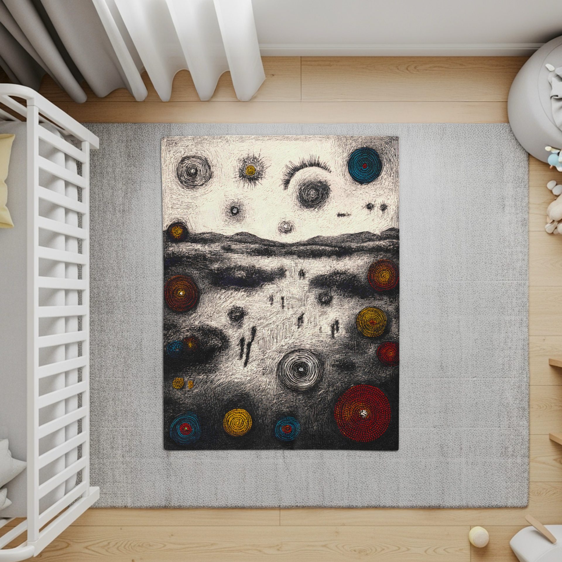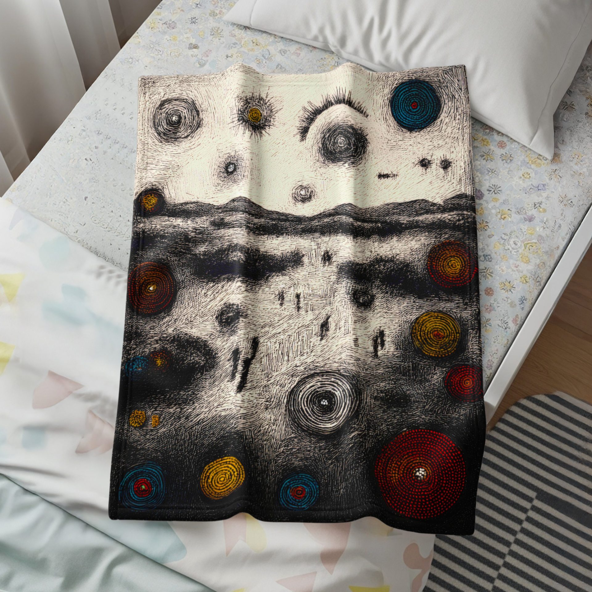 Experience artful comfort with this abstract landscape Blankets. Featuring unique figures and colorful circles this piece will add touch to any home decor. Shop today!