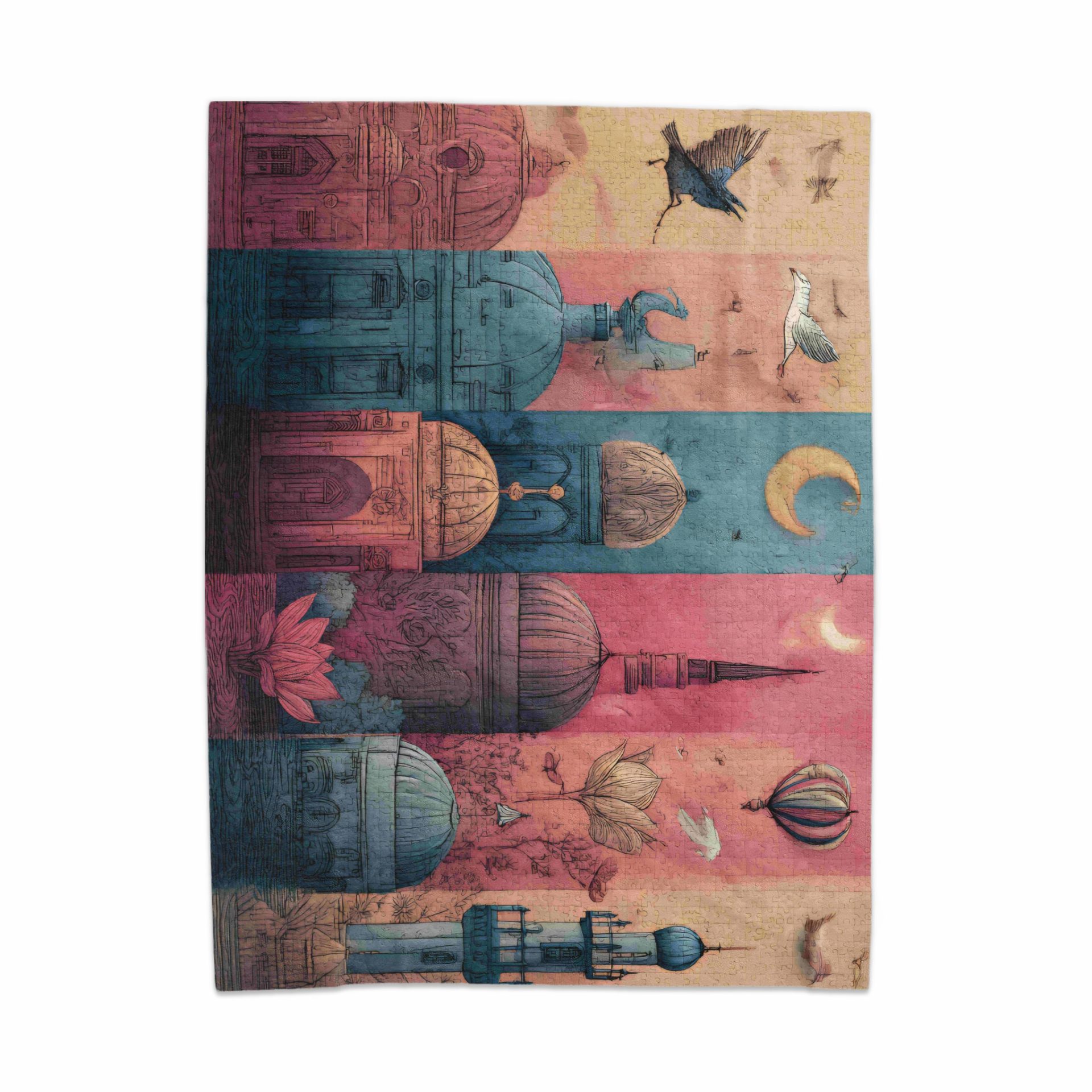 Explore this captivating blanket featuring an abstract skyline filled with celestial bodies and architectural wonders. It's a unique artwork that brings a touch of artistic flair to your space.