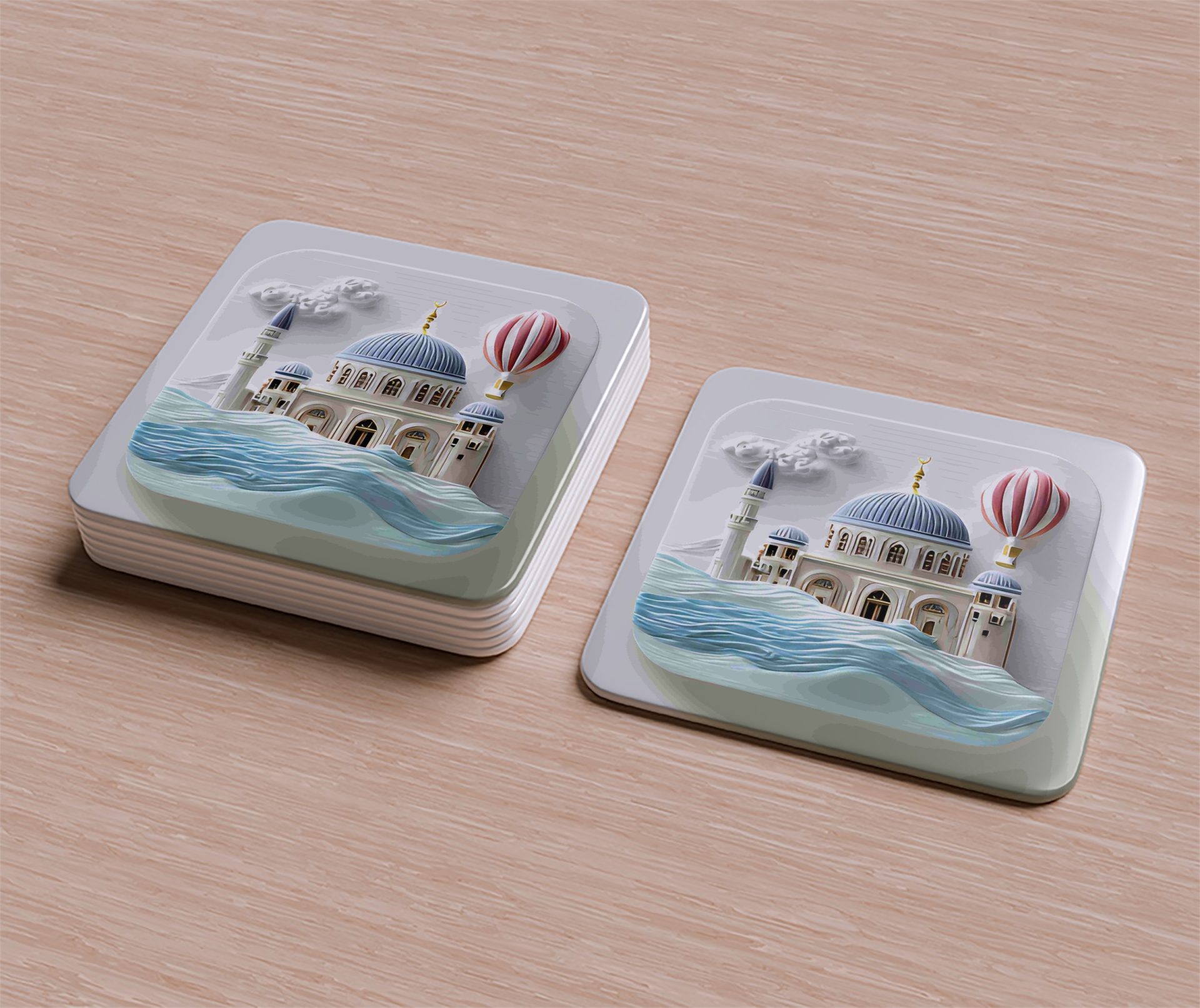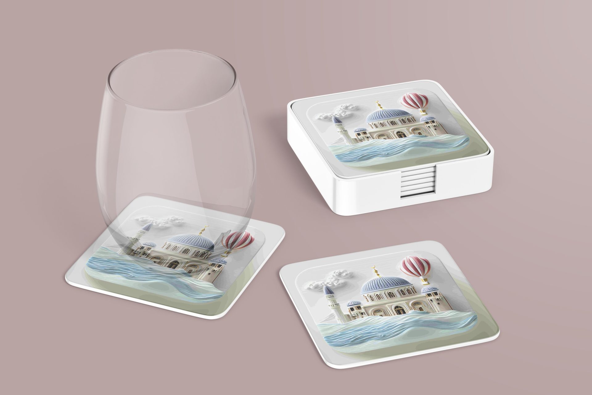 Elevate your home decor with unique architectural design coasters. This decorative coaster features a stunning building along with a hot air balloon and artistic wave pattern.