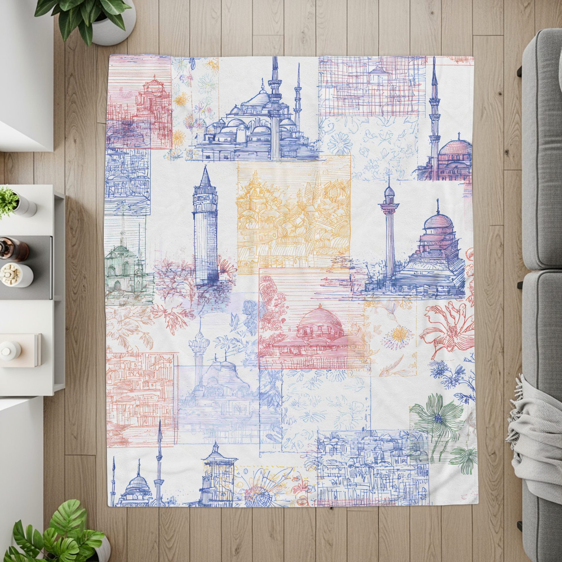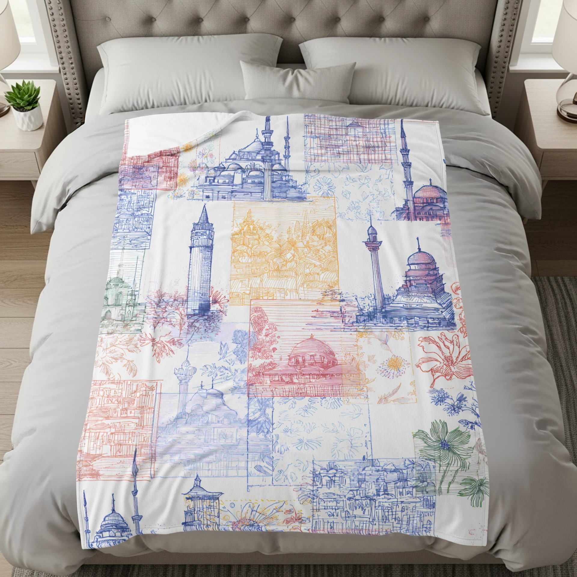 Discover the artistic charm of our graphic art style Blankets. Features a mosaic pattern showcasing architectural sketches and botanical elements adding an artistic touch to any space.