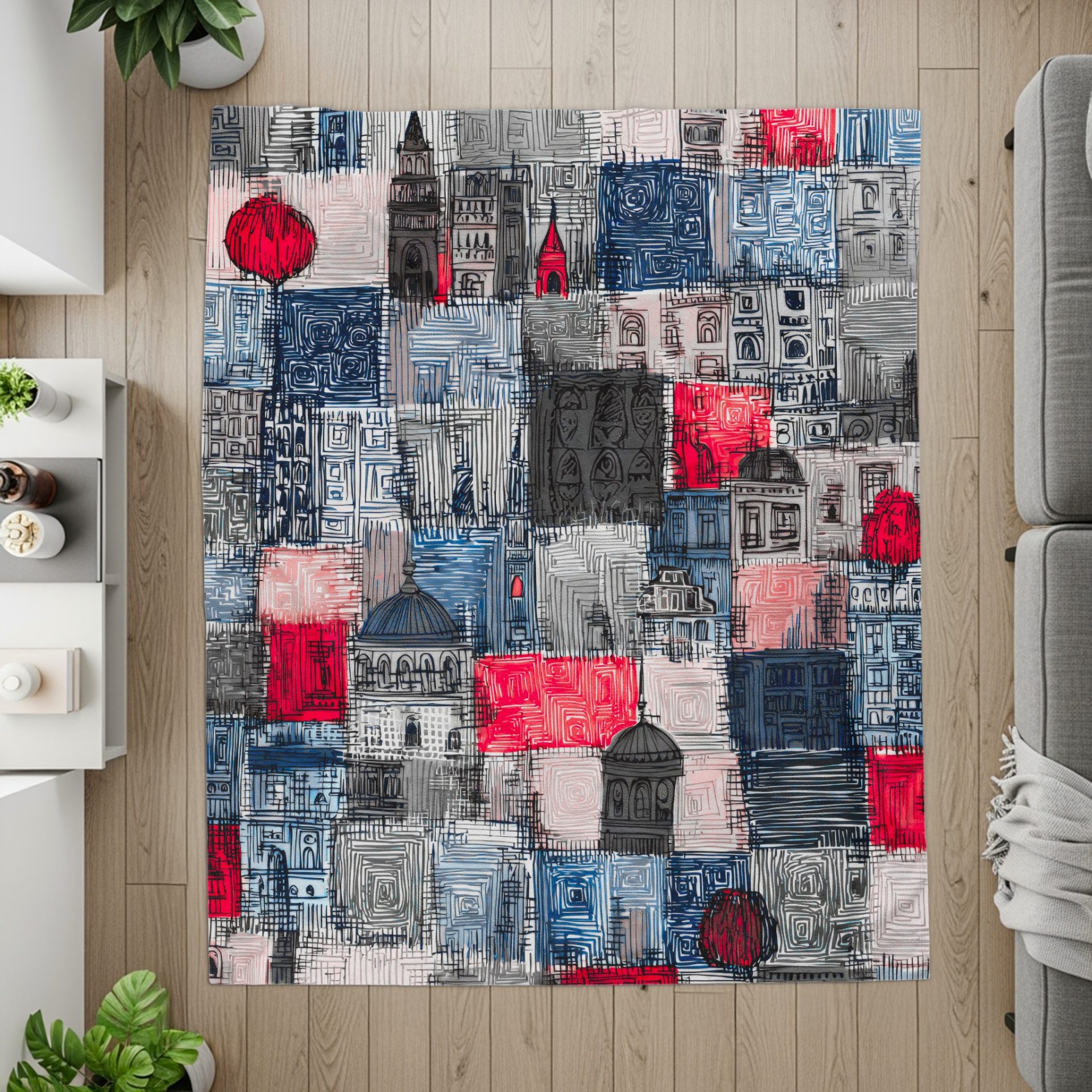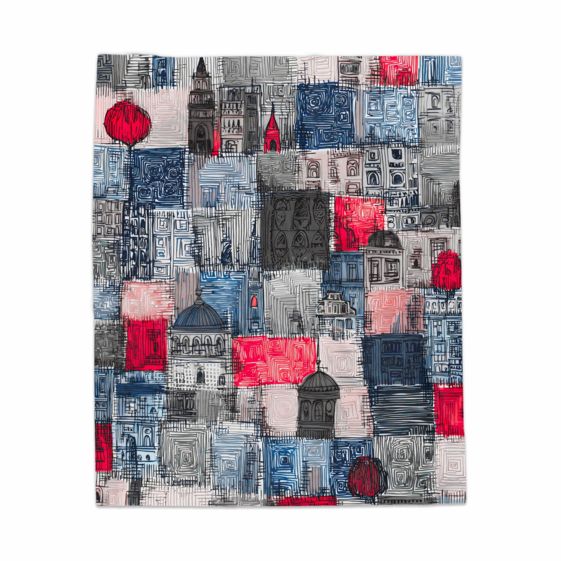 Adorn your space with this unique cityscape pattern. Featuring architectural designs and vibrant red accents it offers a modern and artistic vibe. Shop for Blankets!