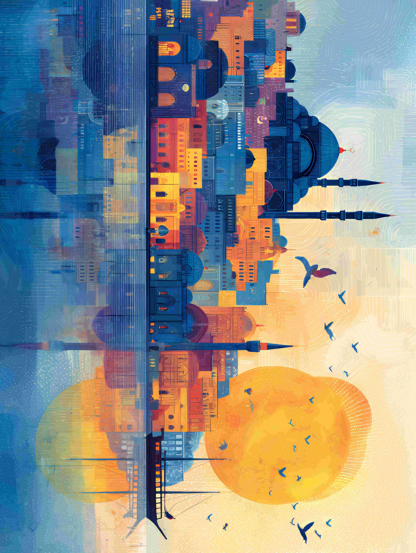 Artistic Istanbul Skyline with Birds Illustration Blankets