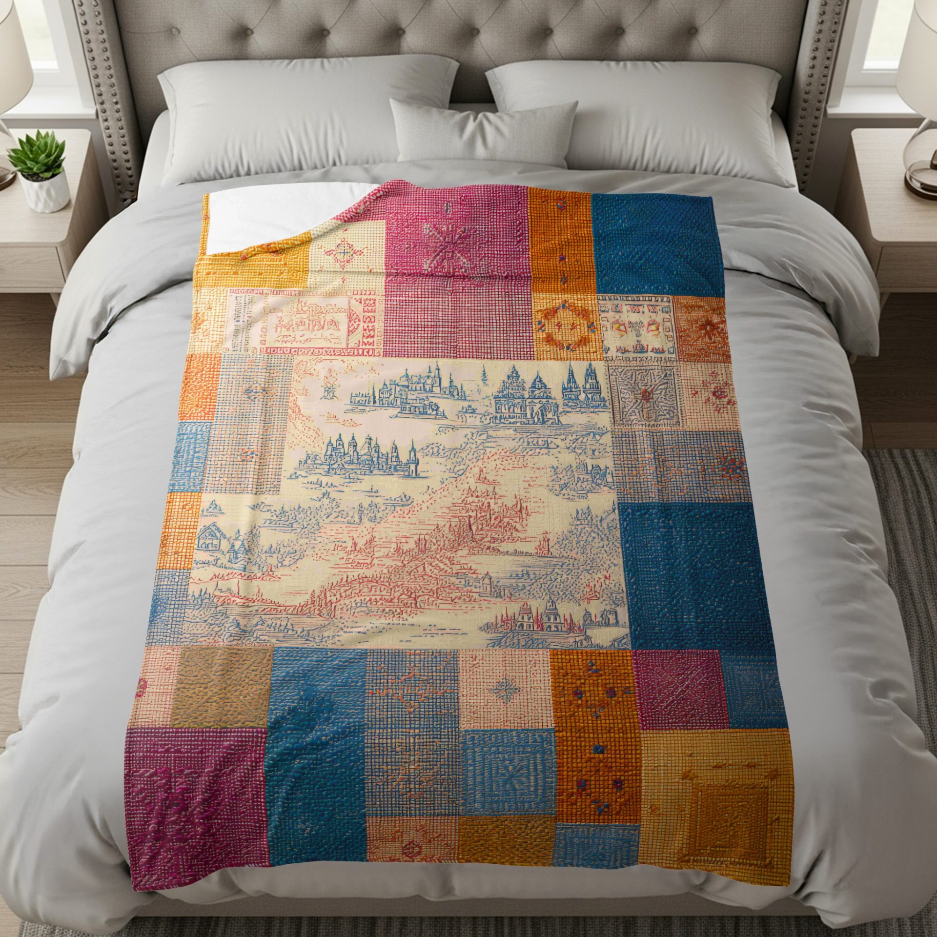 Adorn your space with our luxury blankets featuring an artistic patchwork pattern and detailed illustrations. Experience comfort and style with this unique design! Perfect as gifts.
