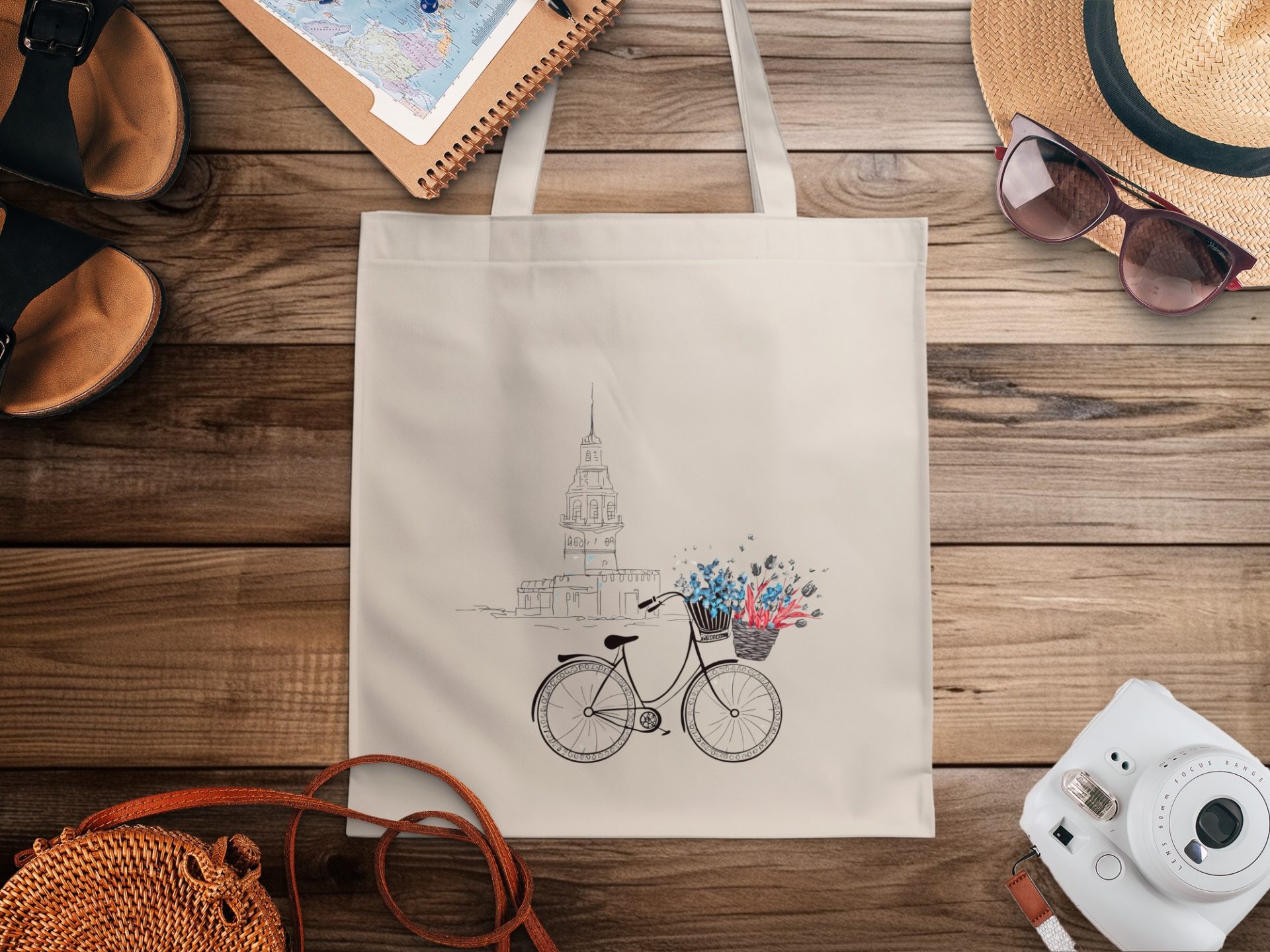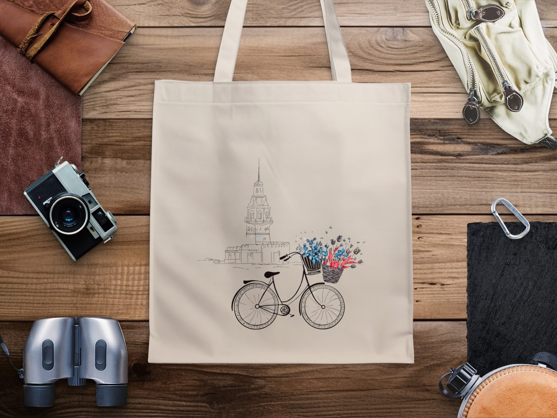 Get your hands on this unique tote bag featuring a bicycle with flower baskets and the iconic Maiden's Tower in Istanbul. This artful design is sure to add charm to everyday use.