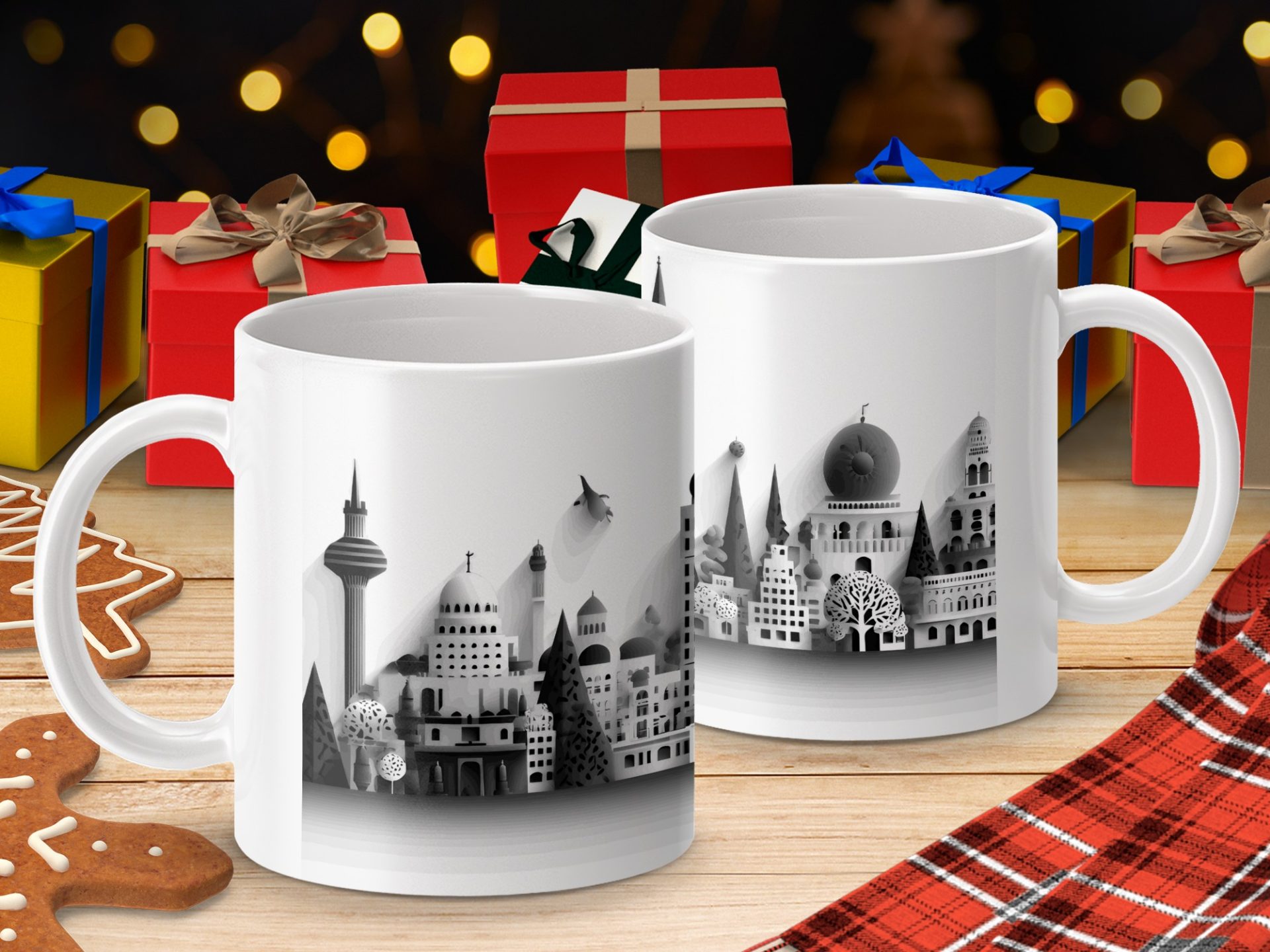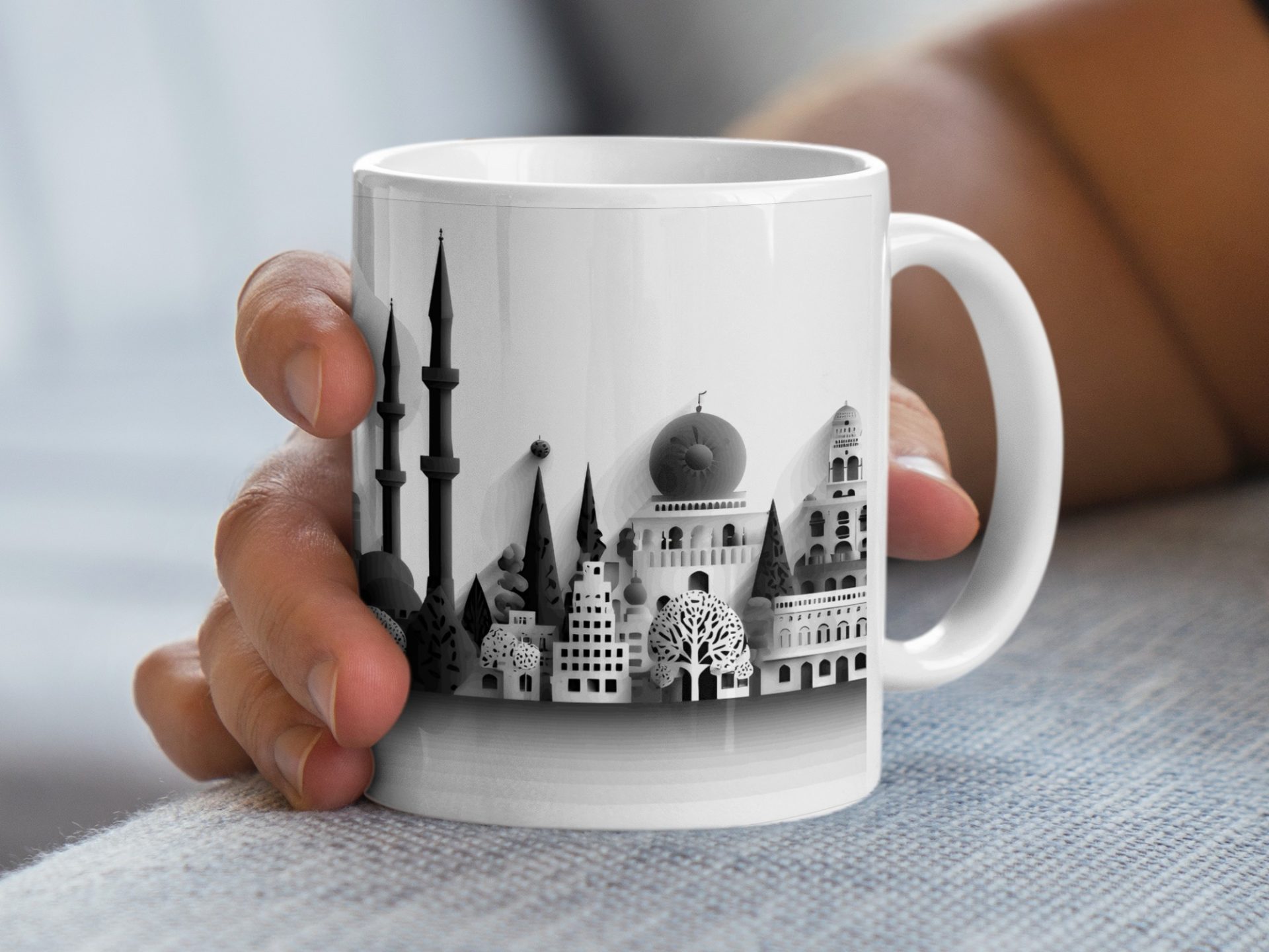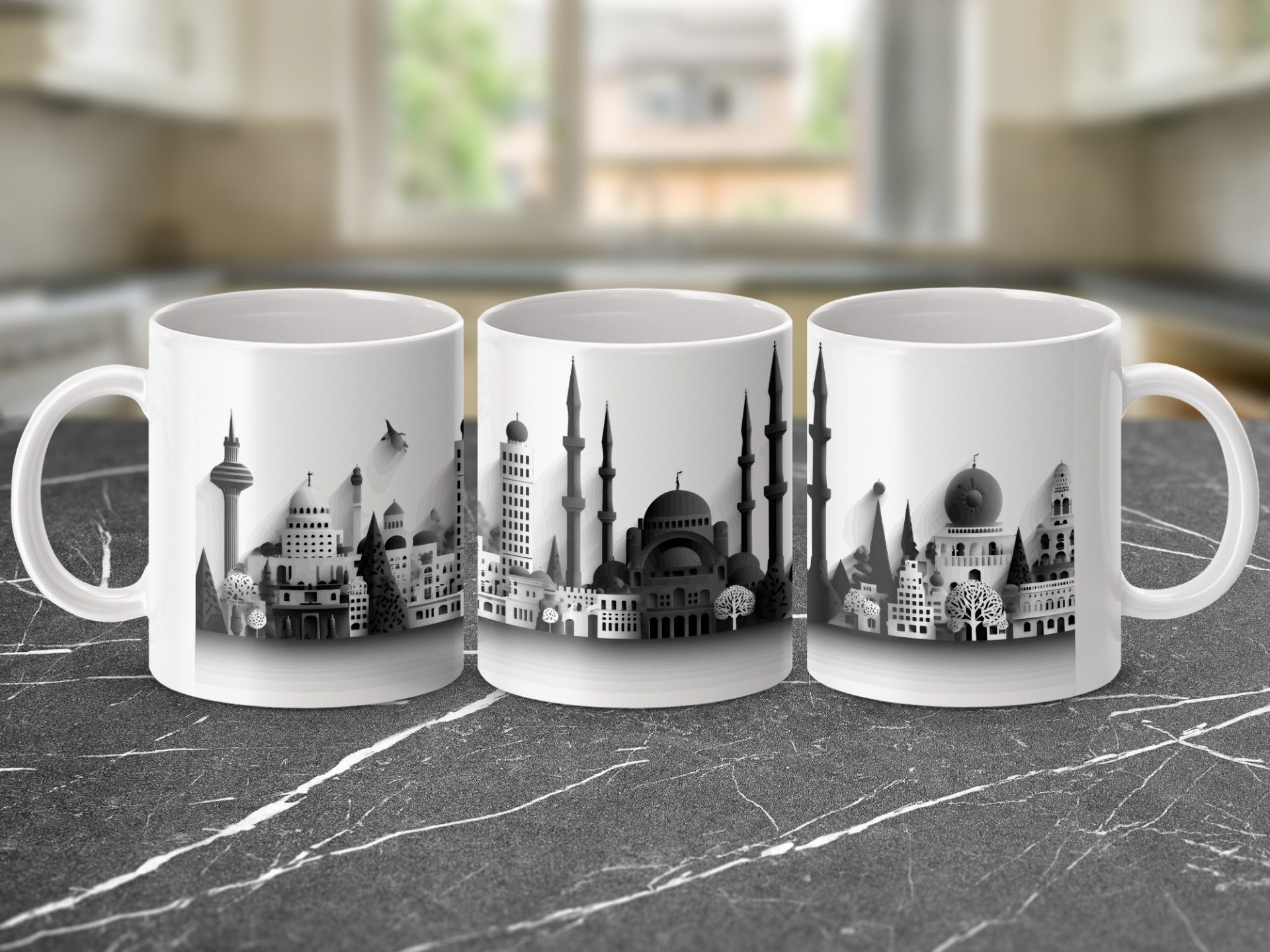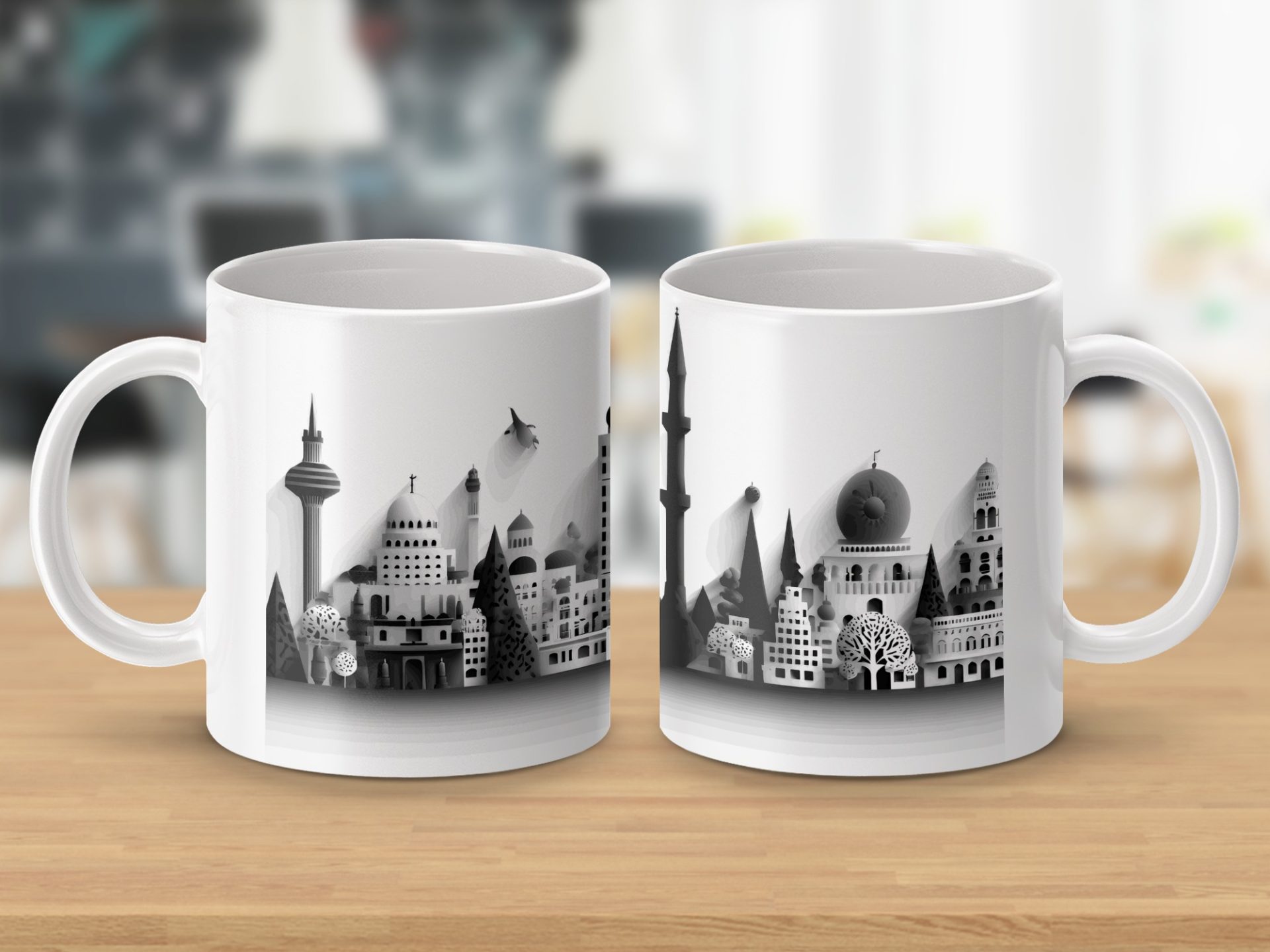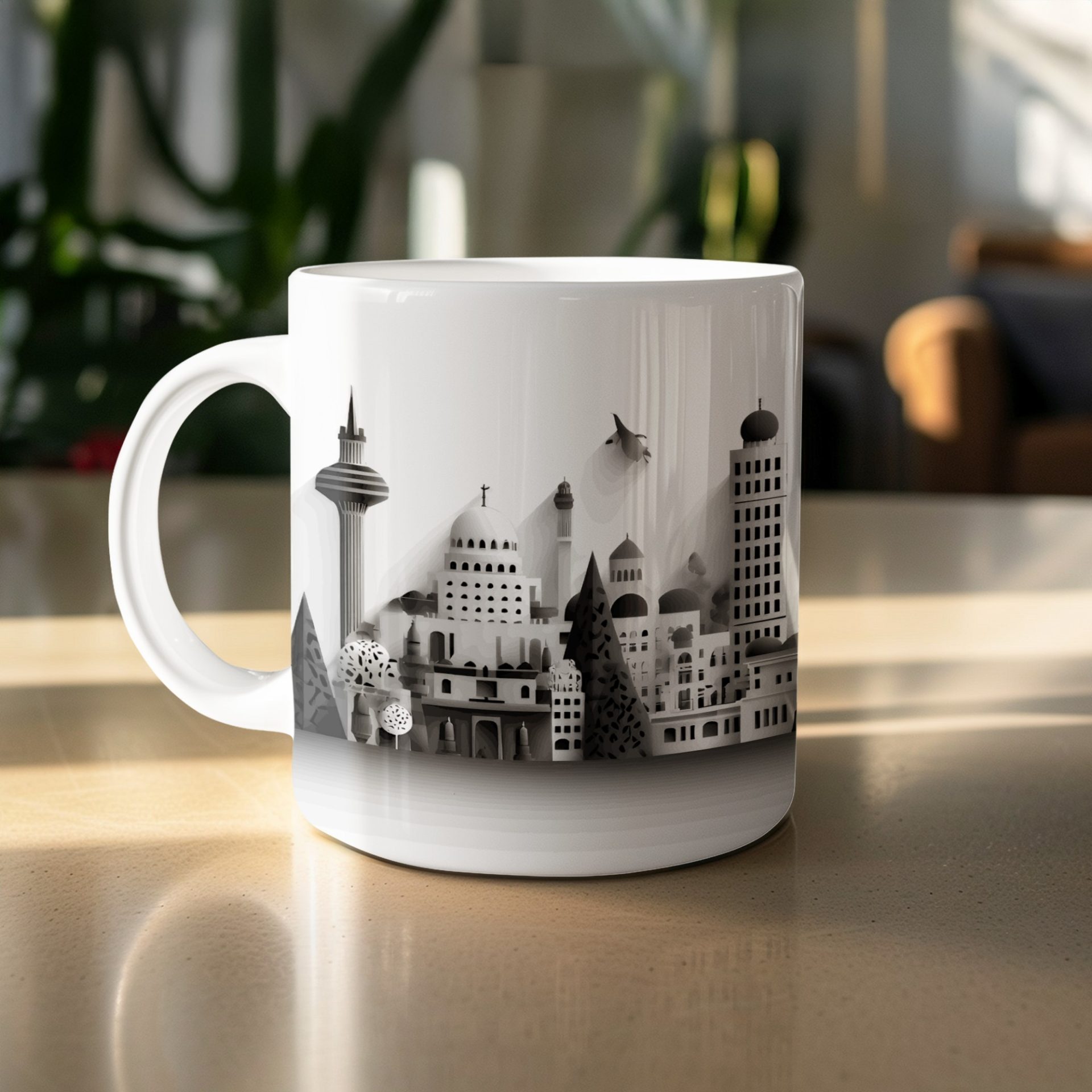 Elevate your coffee moments with our unique panorama cityscape mugs. Showcasing a detailed black and white skyline this artful design brings an urban sophistication to your mug collection.