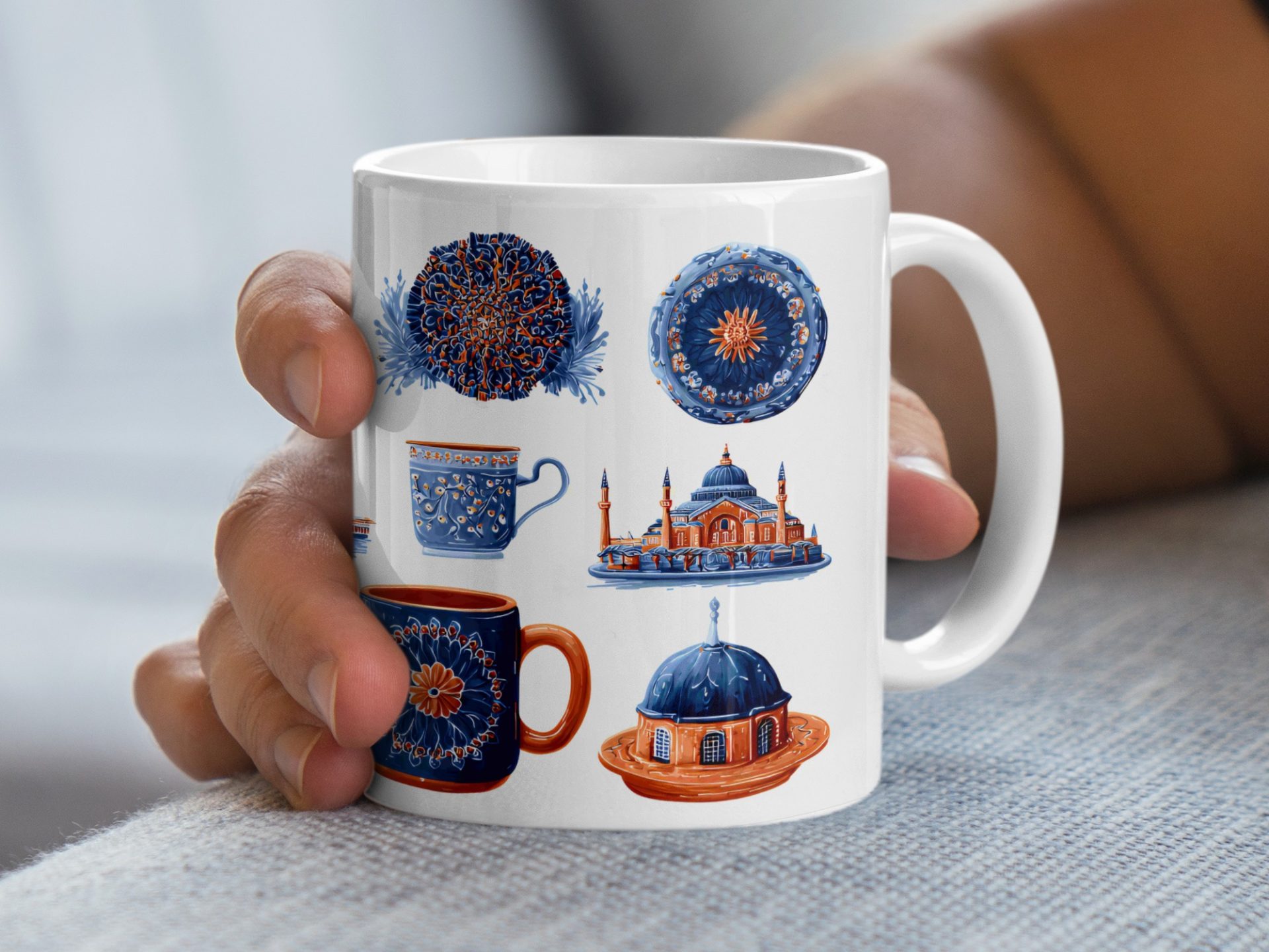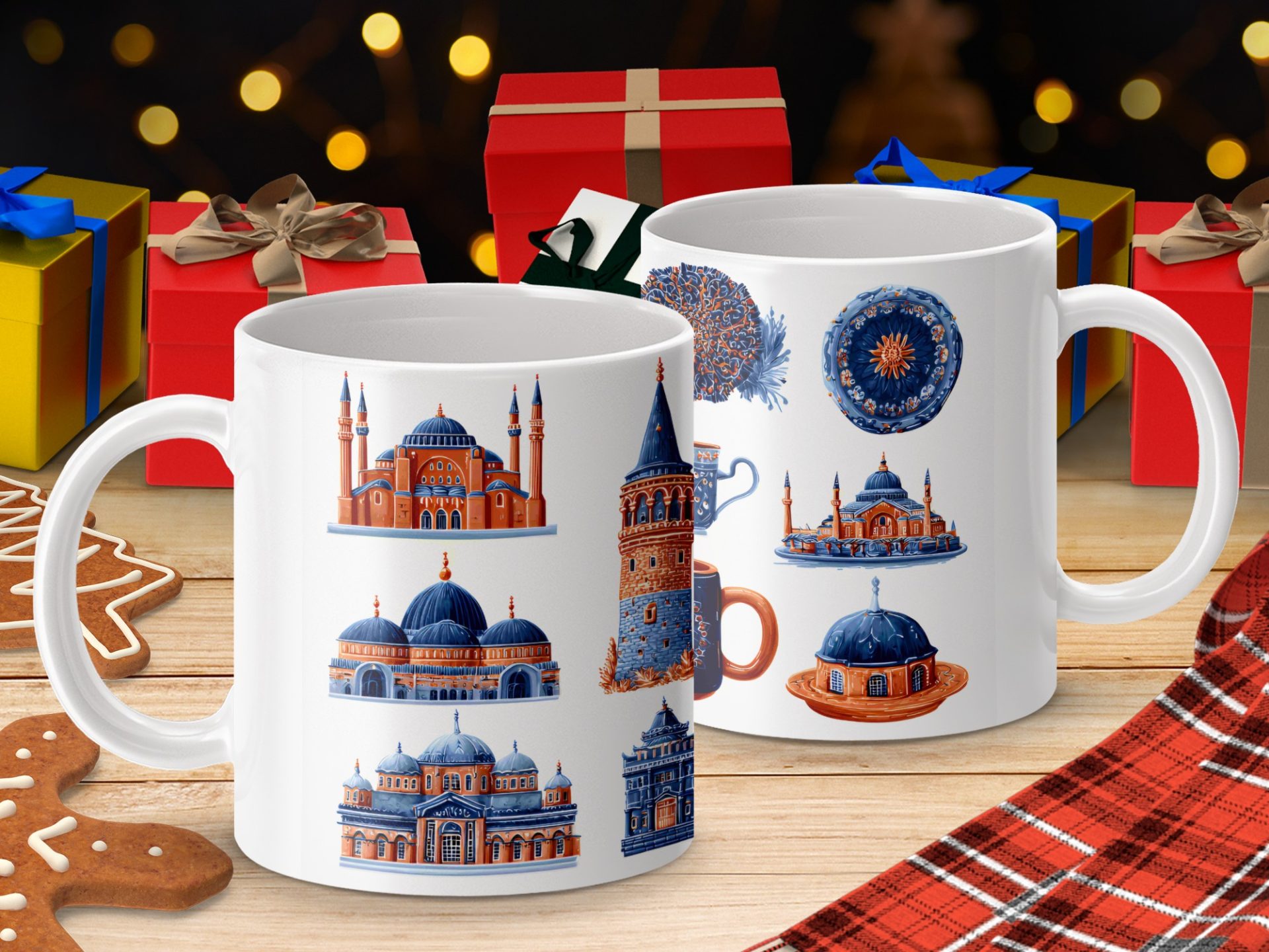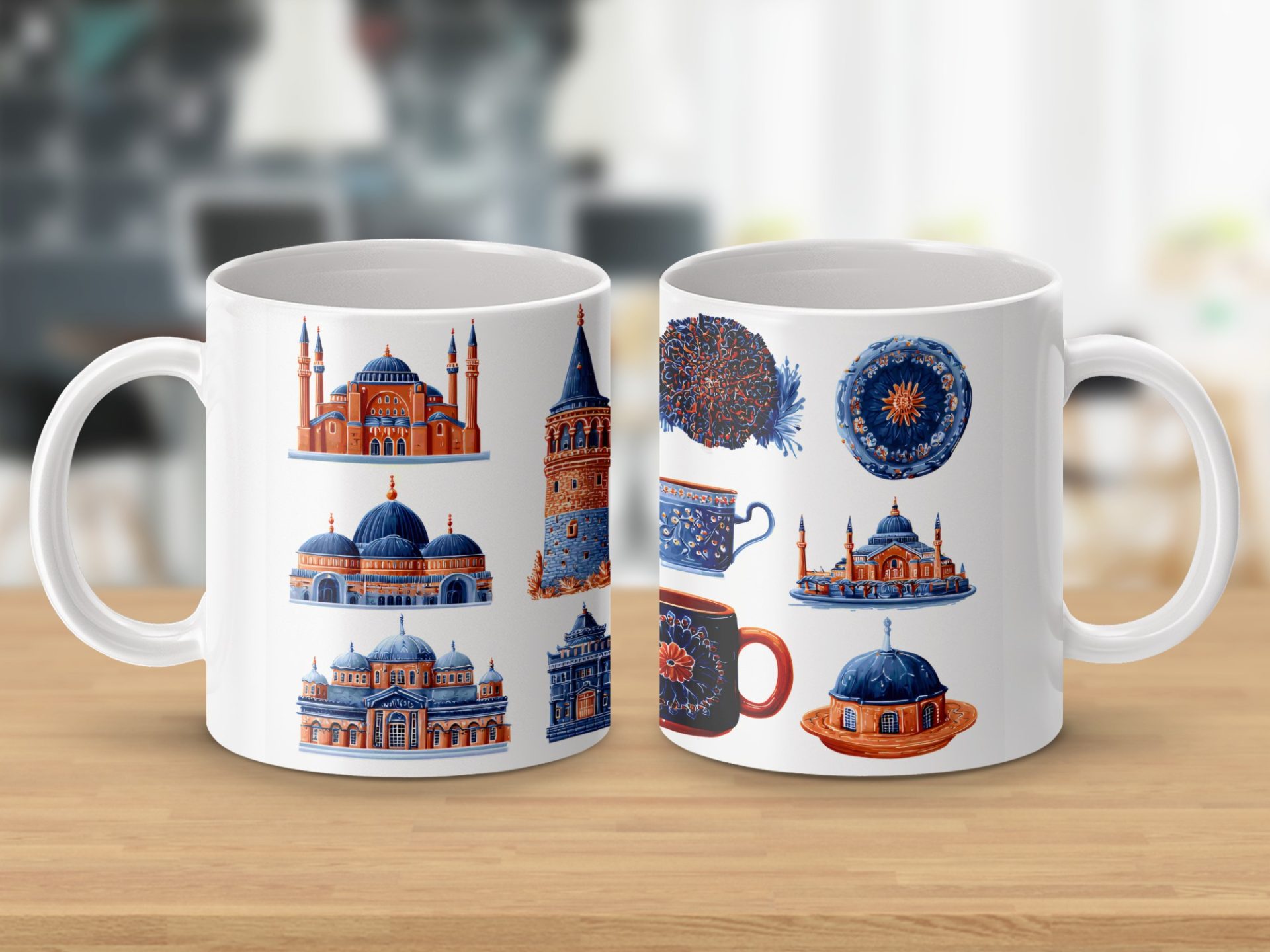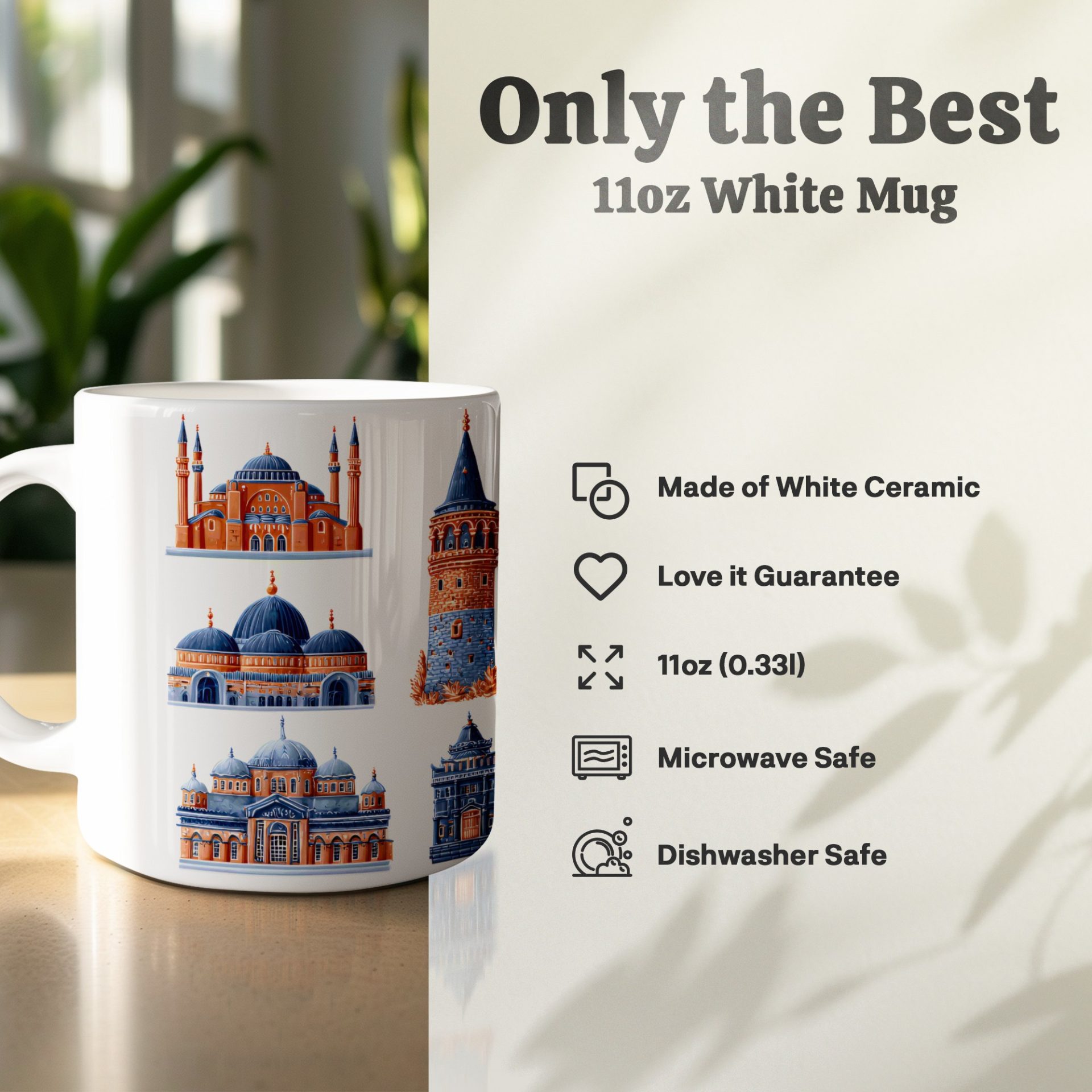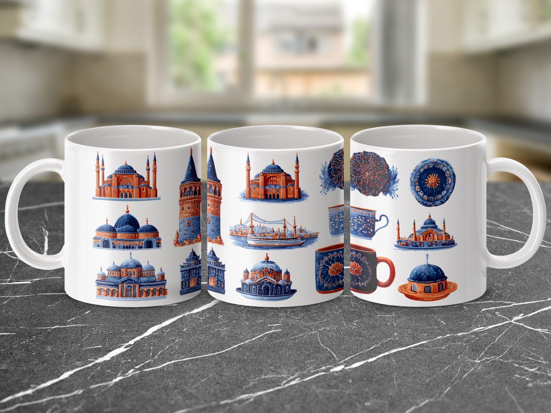 Embrace the charm of Istanbul with this architectural theme design. Featuring iconic landmarks in blue and orange colors this mug is a perfect blend of art and utility. A great gift idea!