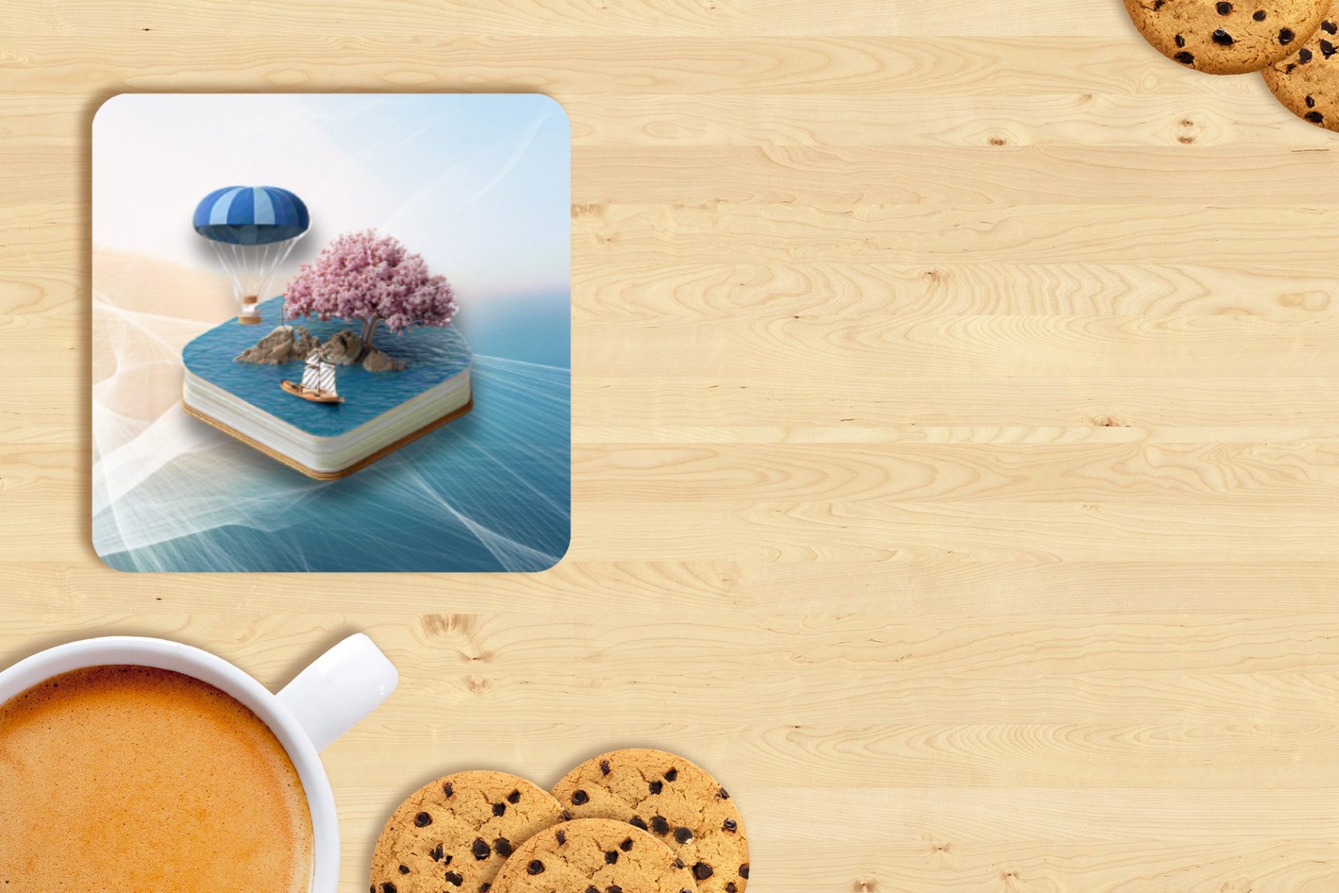 Book With Island Tree and Hot Air Balloon Design Coasters