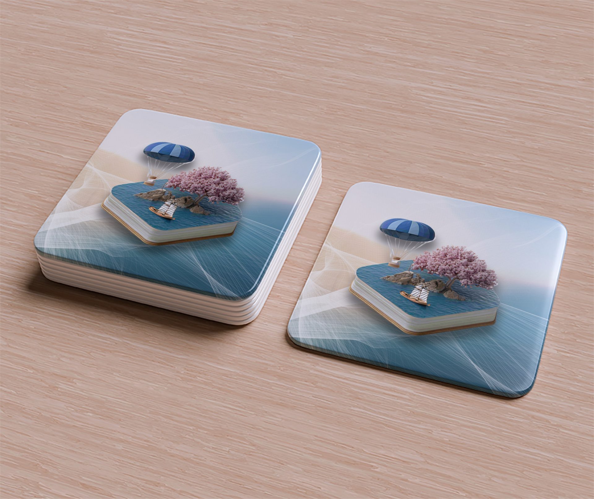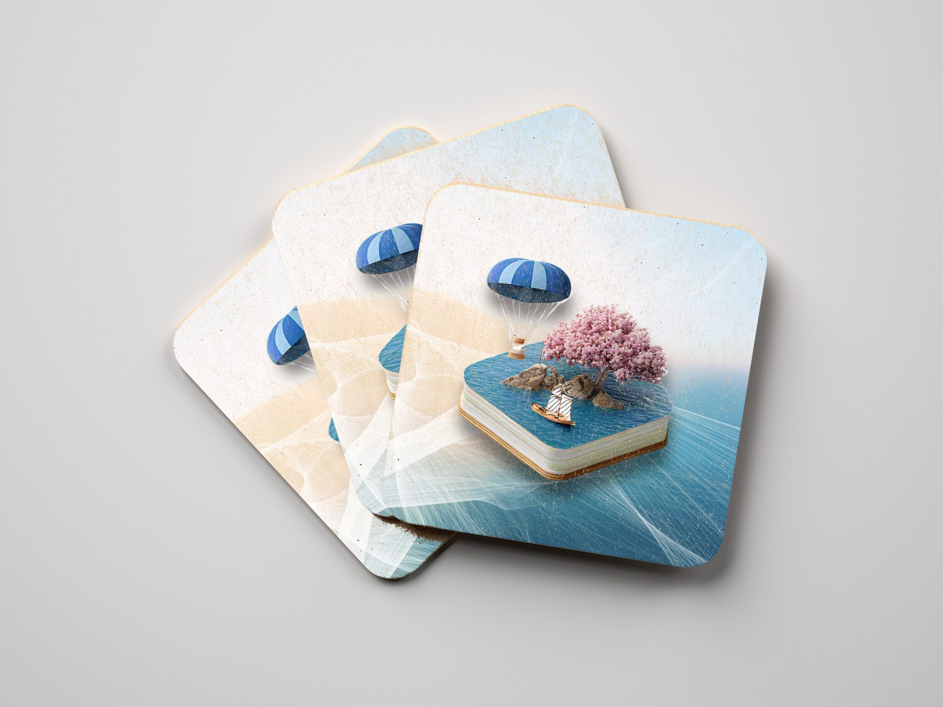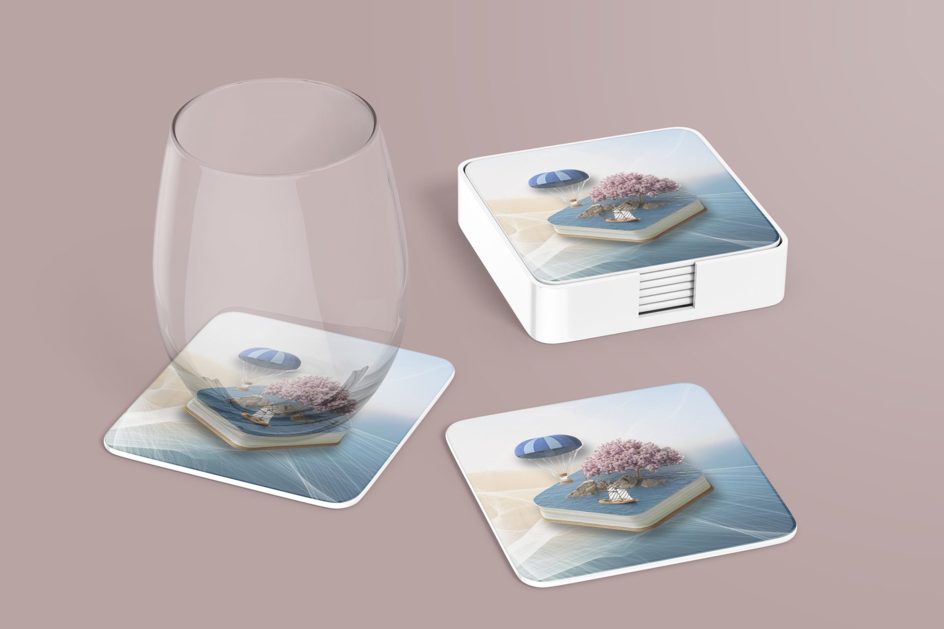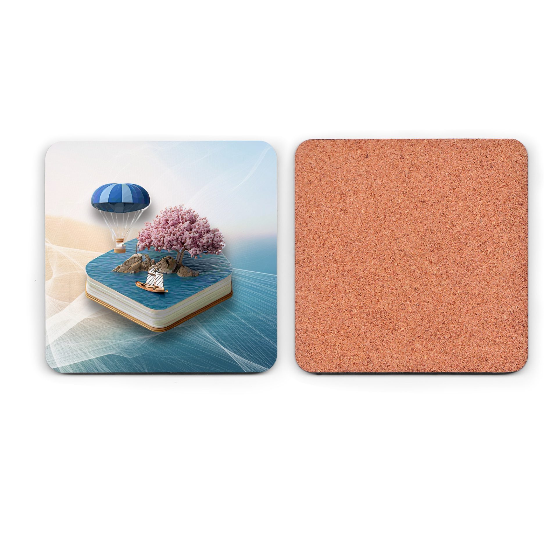 Elevate your table setting with our Book Island design coasters. Featuring an island with tree balloon and boat scene these beautiful coasters will protect your surfaces.