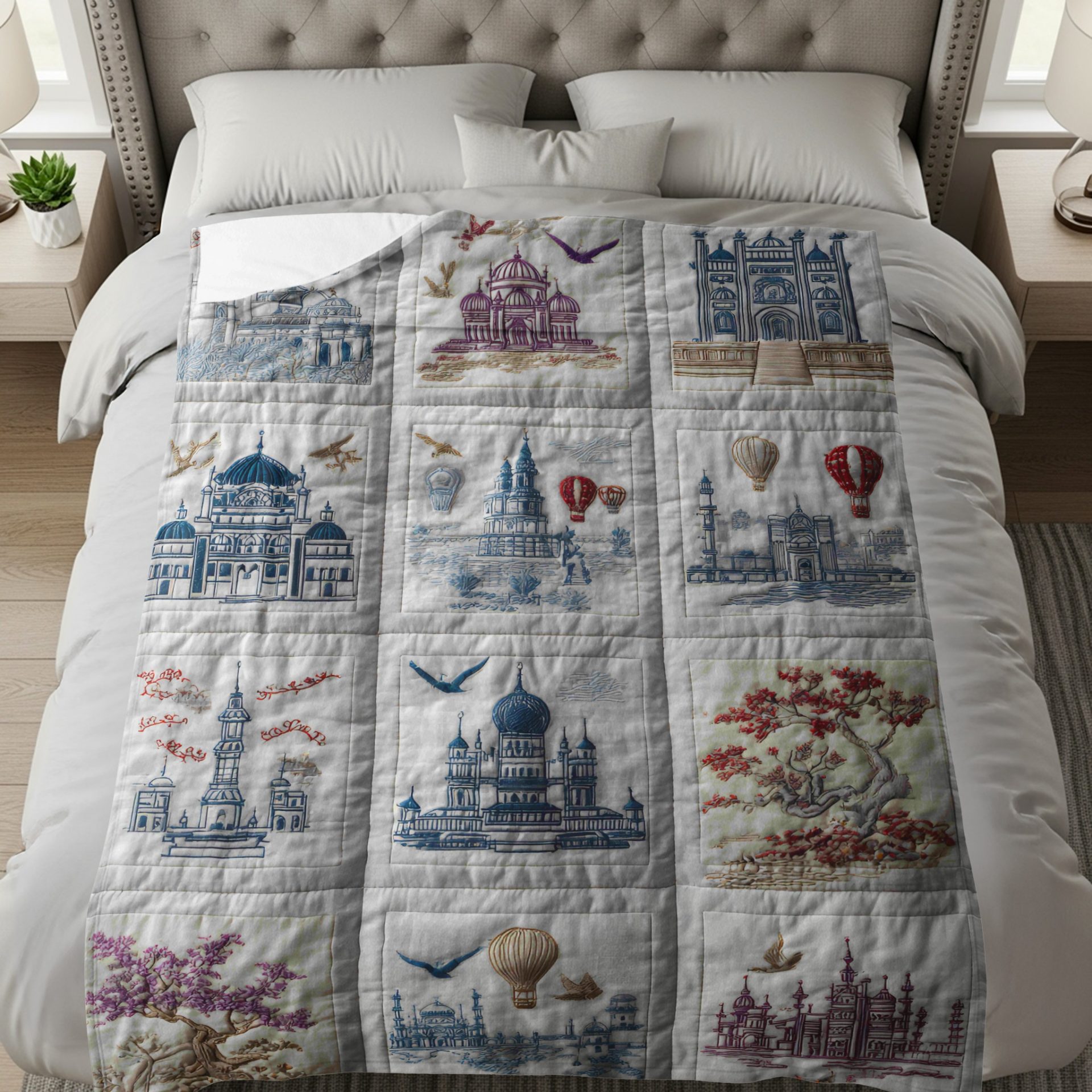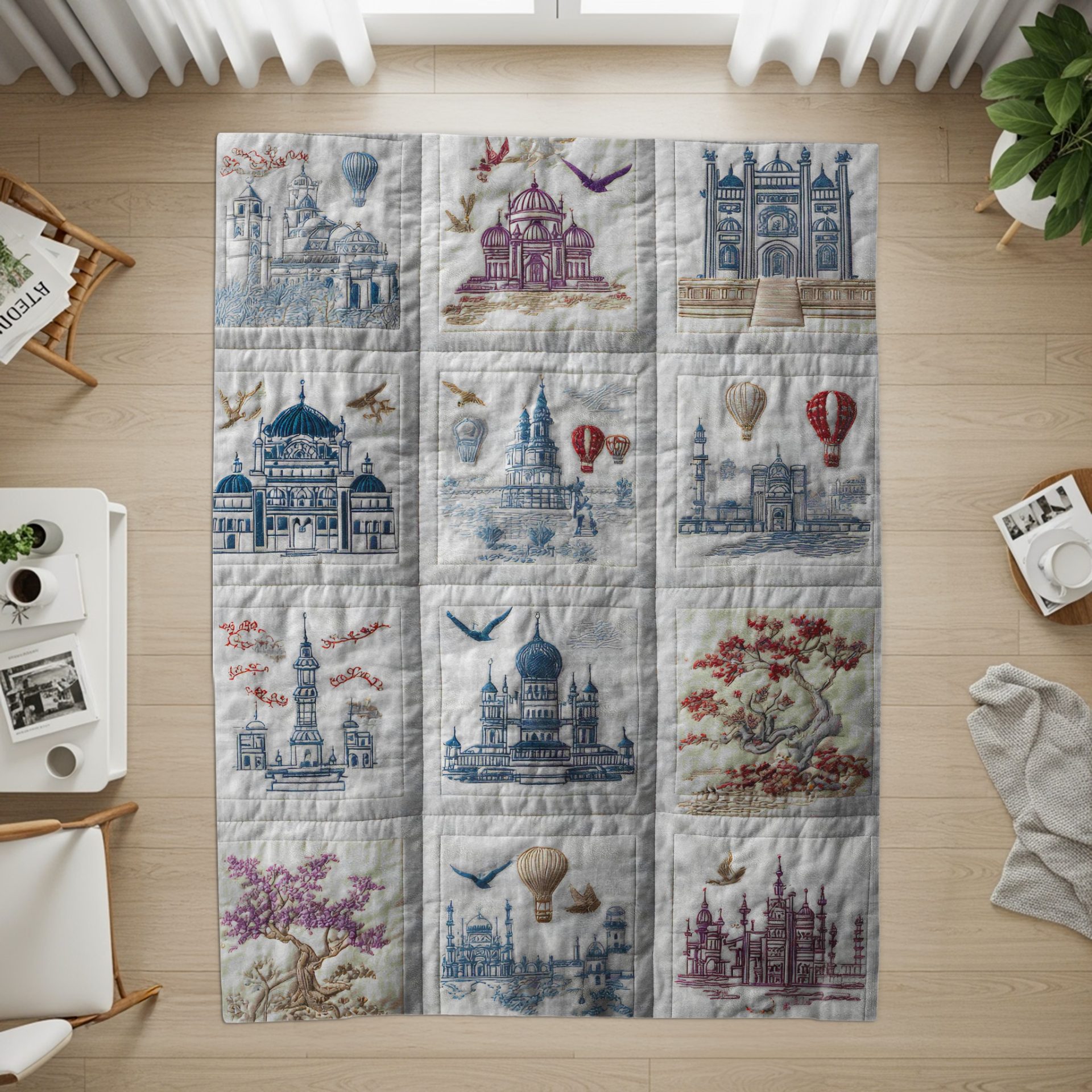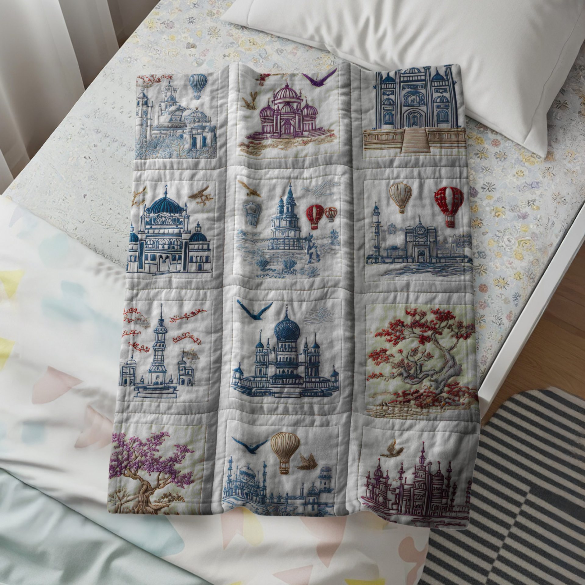 Indulge in the whimsical charm with our decorative blankets featuring a quilted pattern with intricate designs of buildings balloons and birds. Drape yourself in this enchanting world. Explore this today!