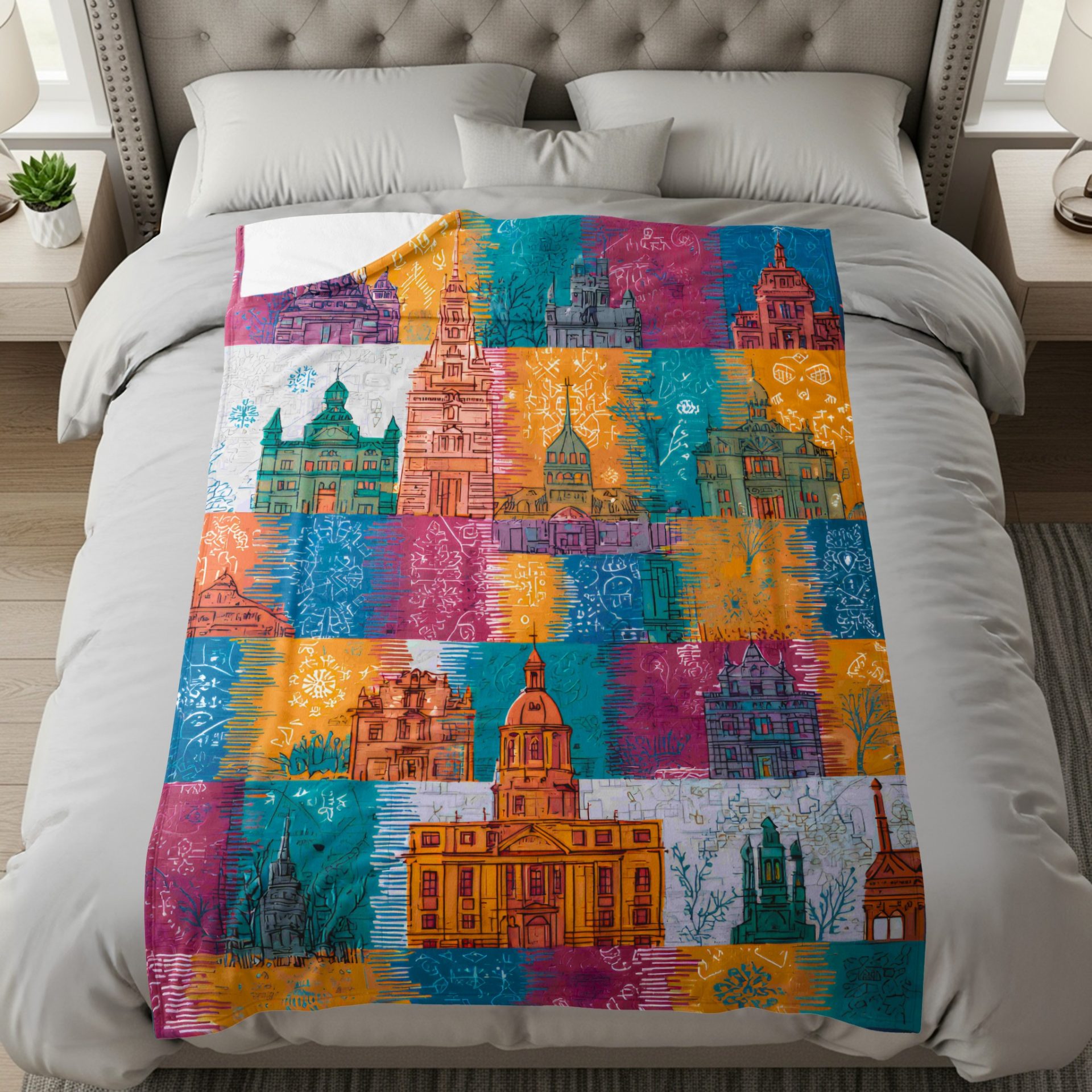 This blanket showcases a colorful illustration of buildings in a row and column design. The unique design features many architectural styles and vibrant color. Perfect for adding a unique decorative touch.
