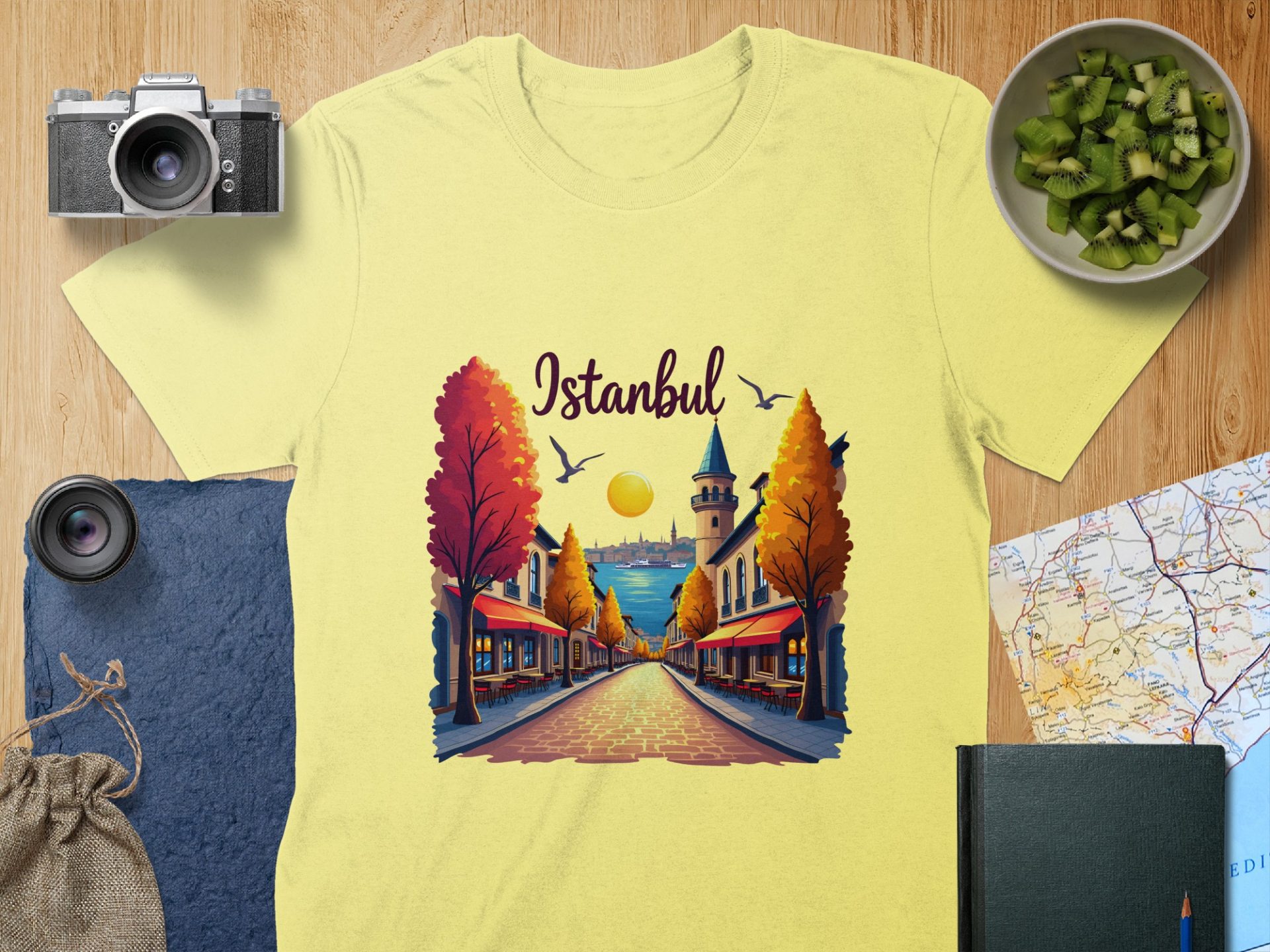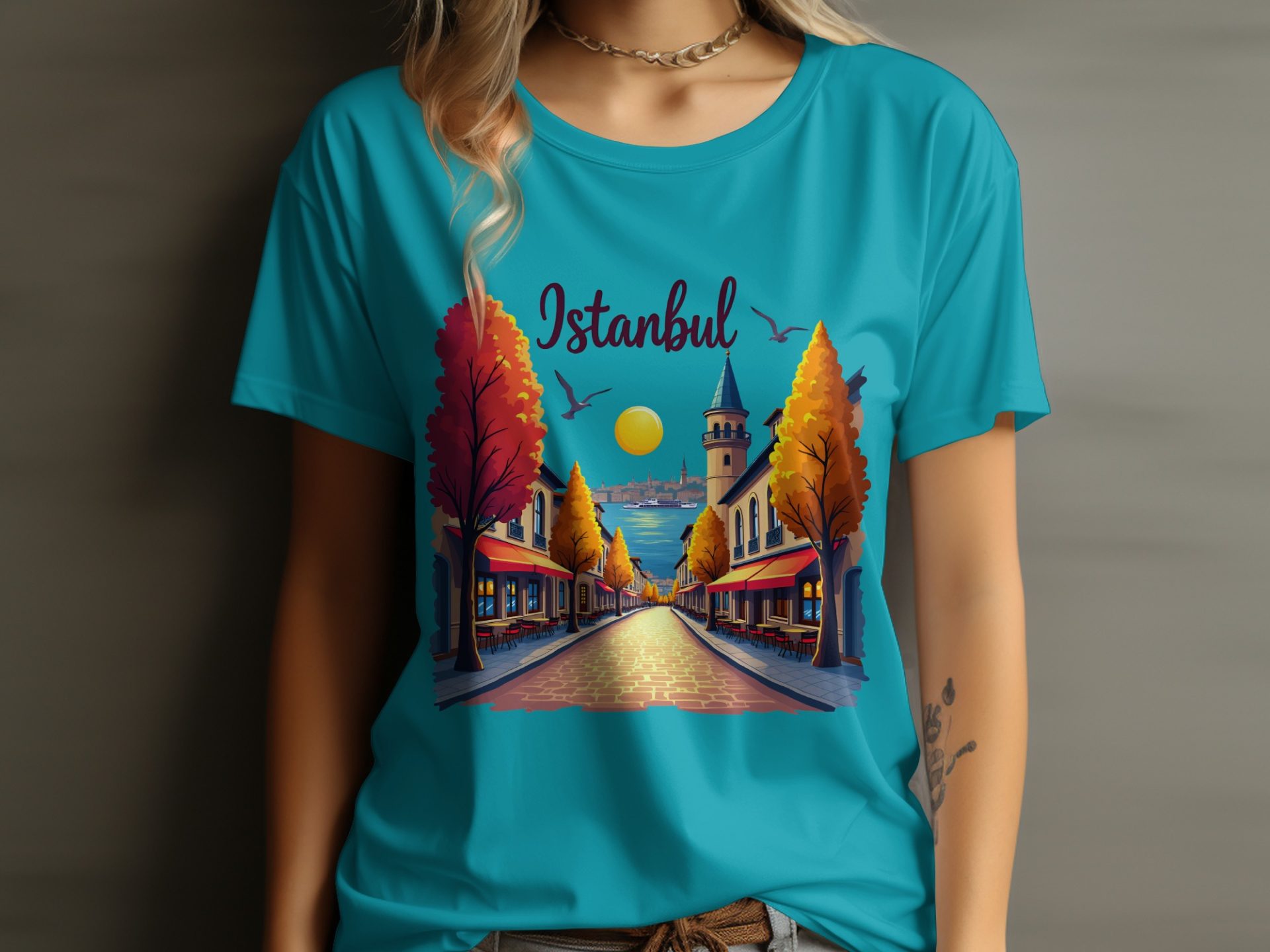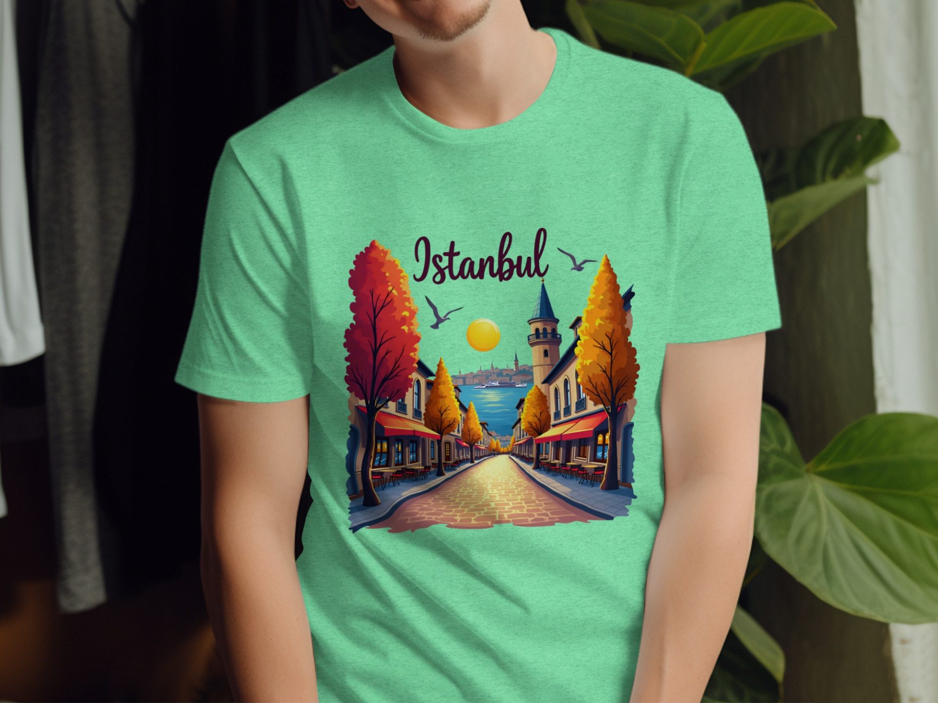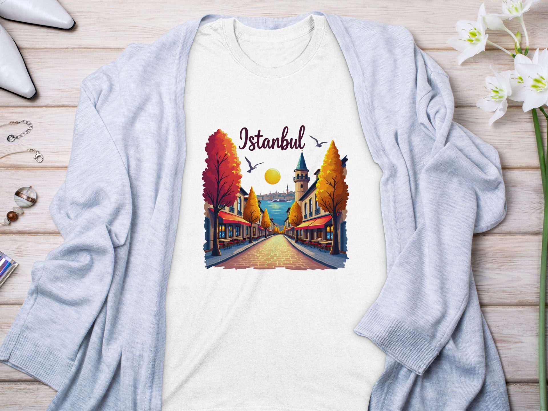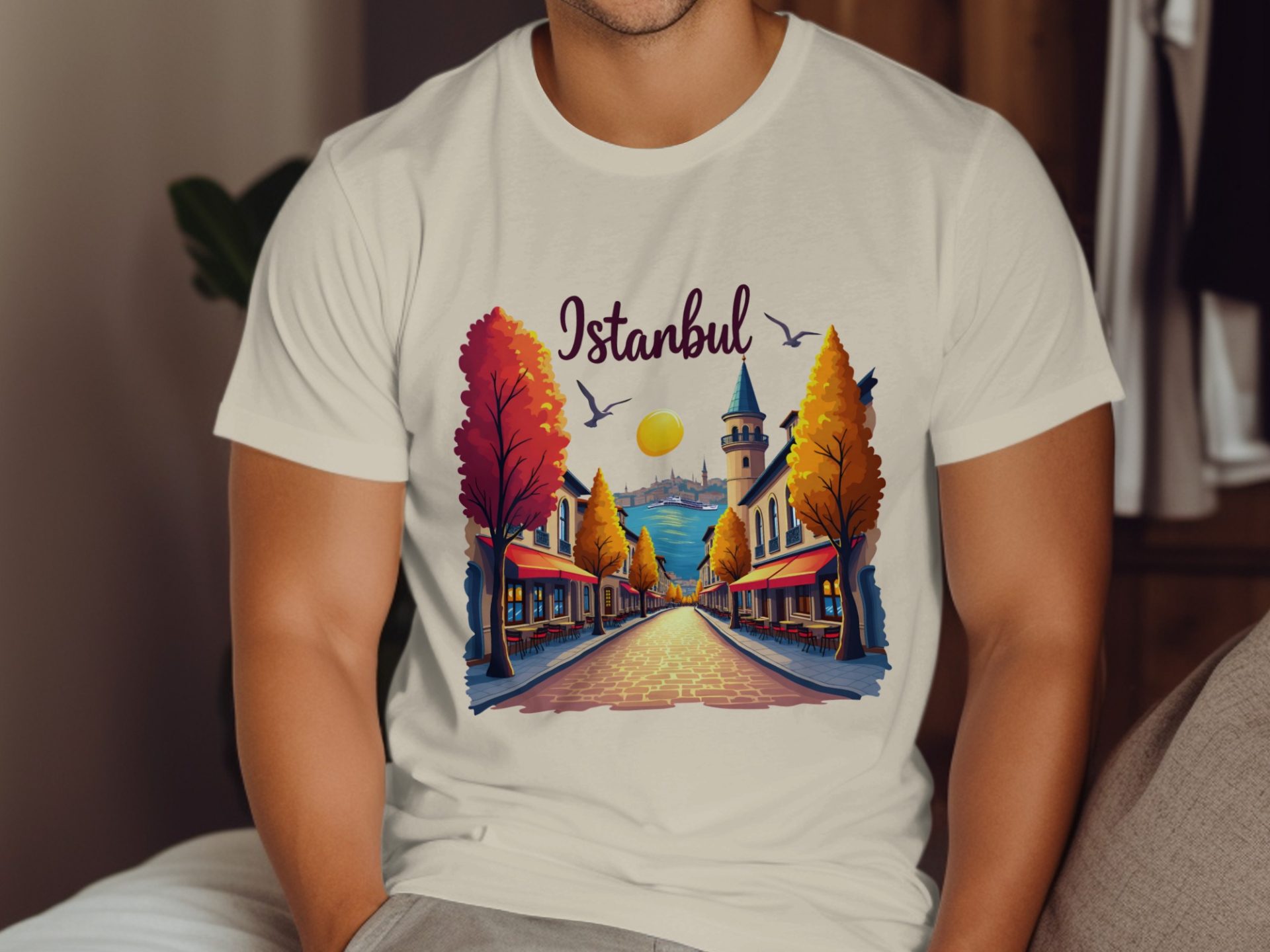 Bring the charm of Istanbul to your wardrobe! Featuring a serene street view this design captures the essence of city life with its architecture water and birds. Get yours now!