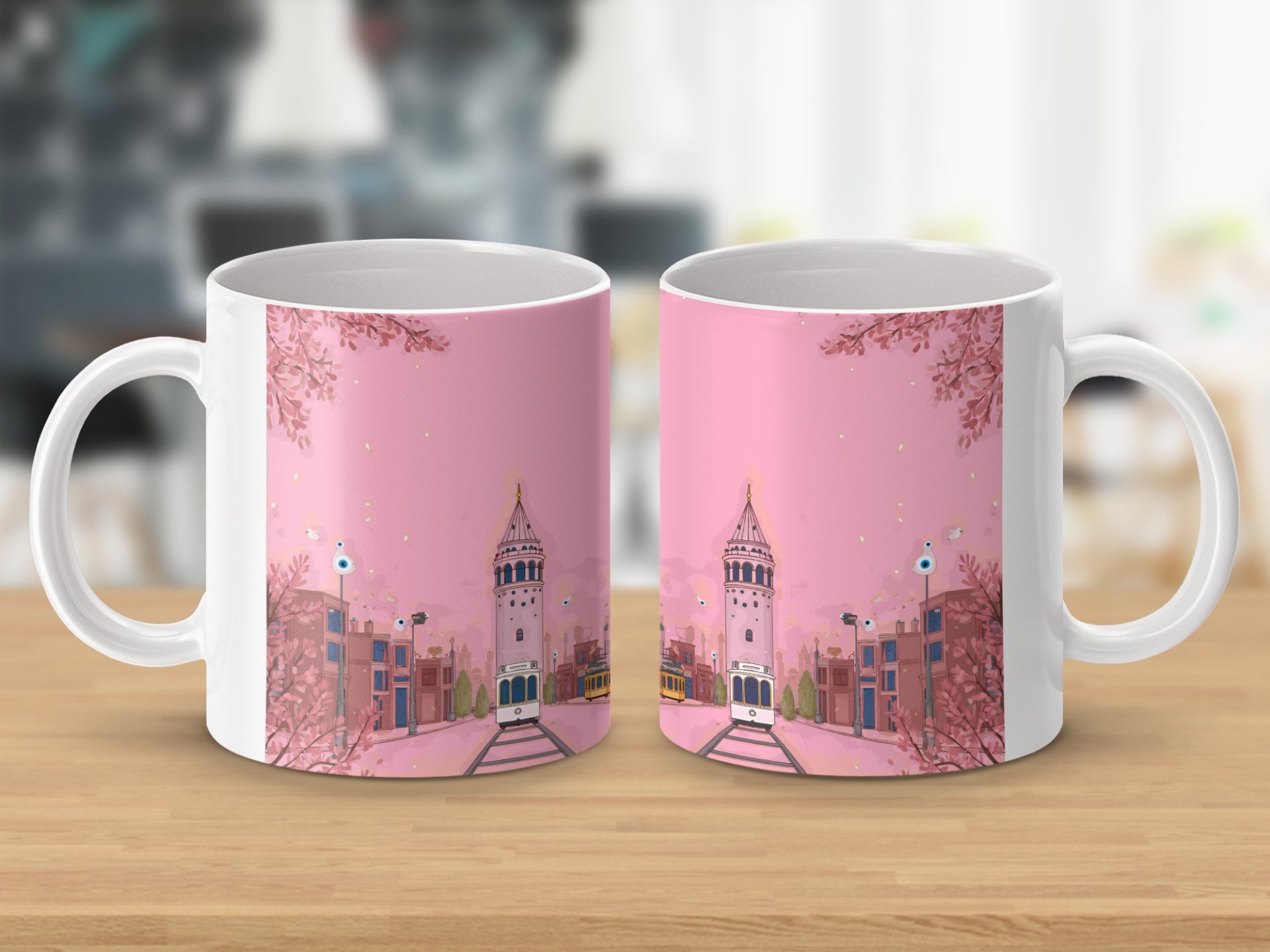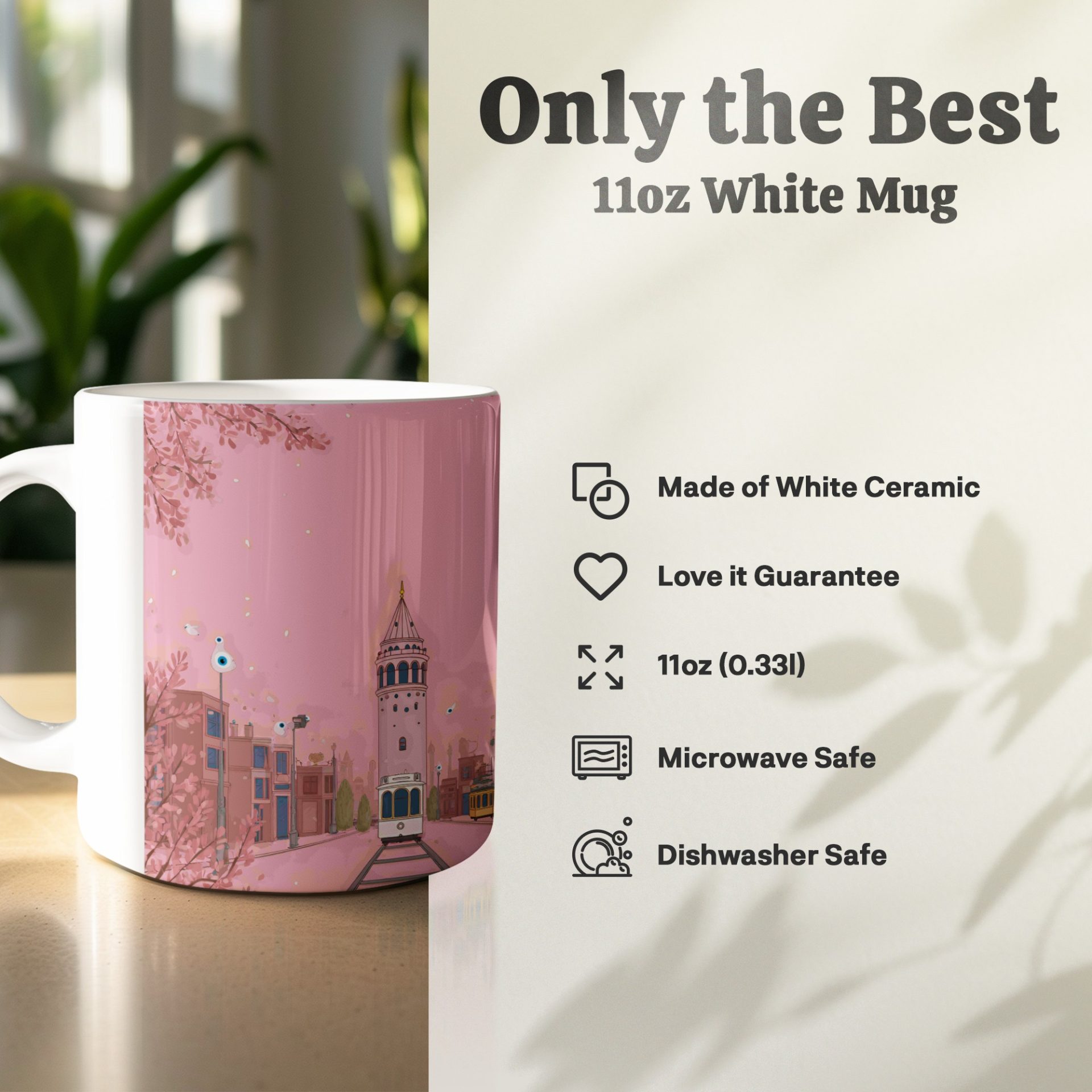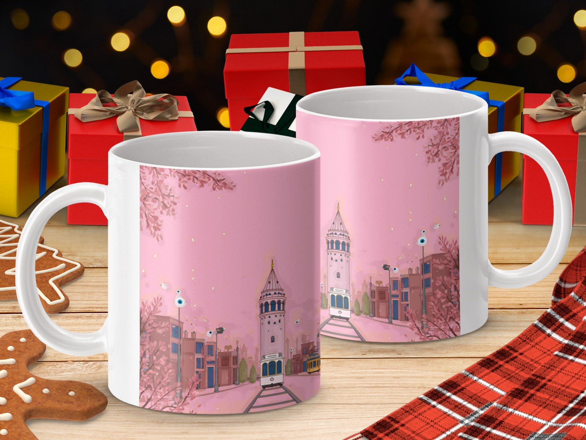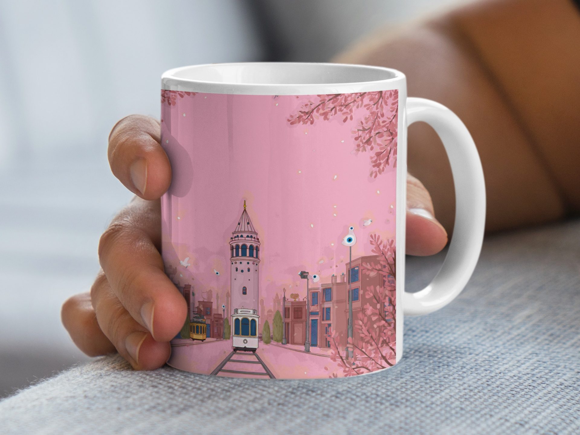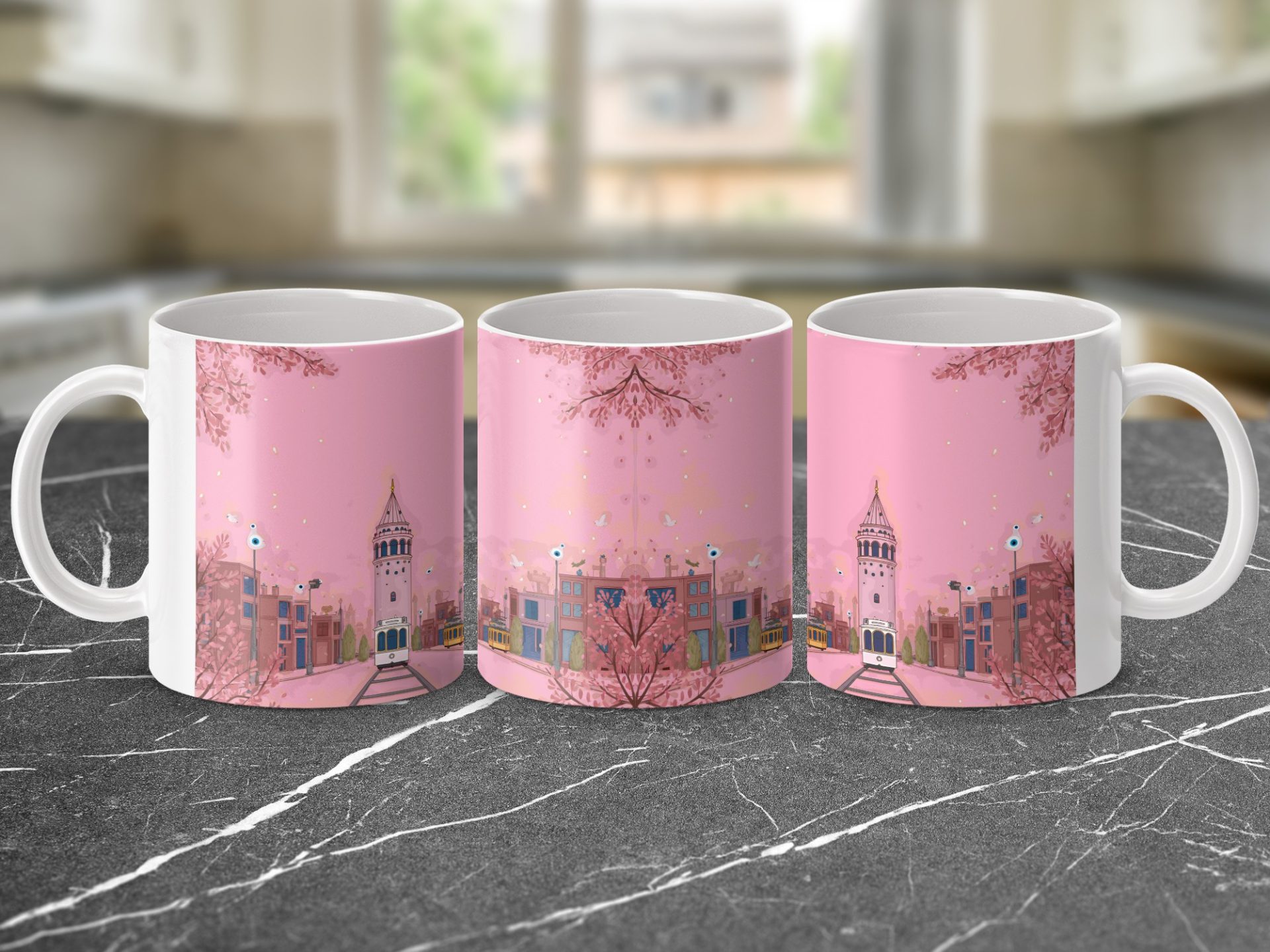 This mug features a captivating cityscape with a tower surrounded by pink flowers. Enjoy a delightful coffee or tea break with this uniquely designed mug. Perfect for adding a touch to your day.