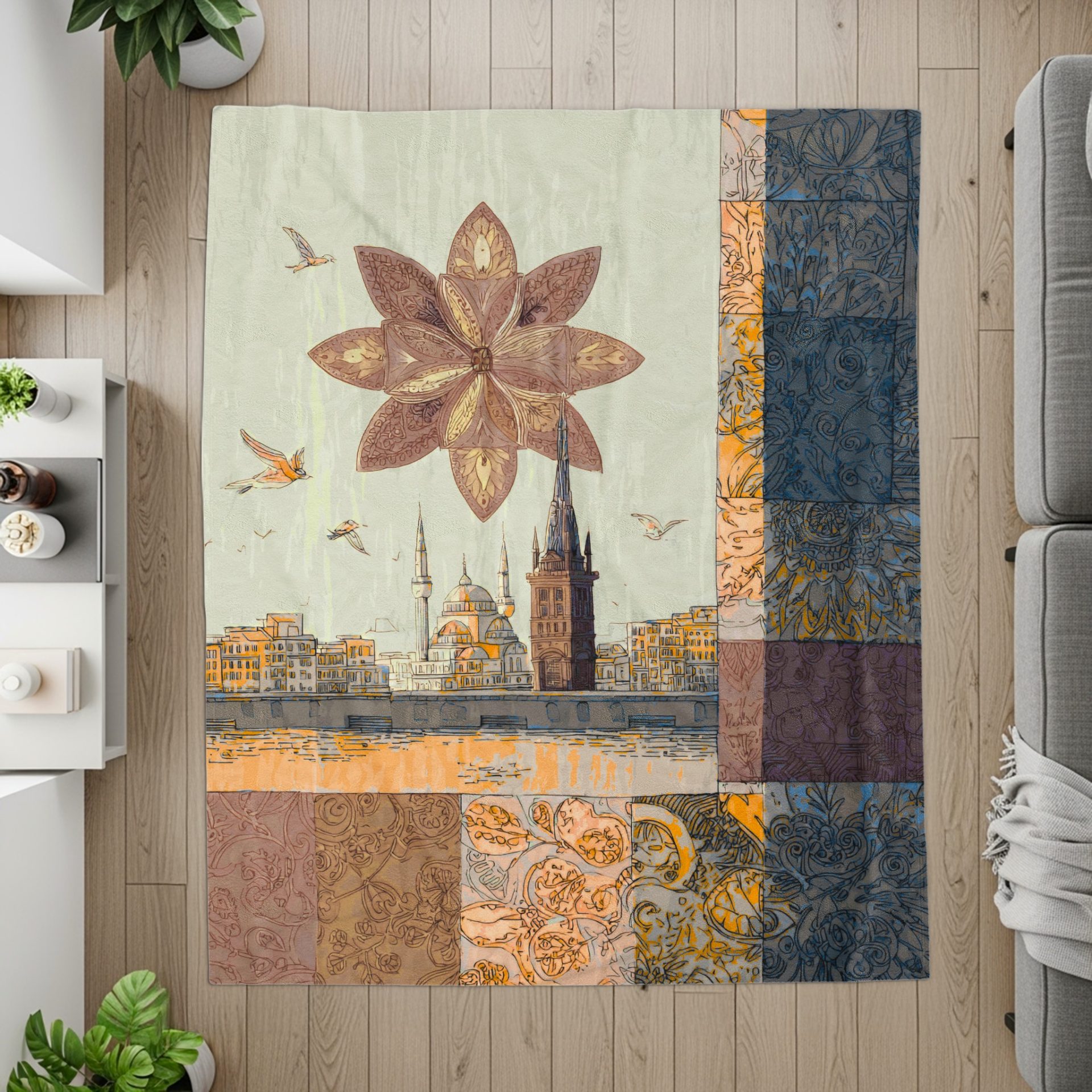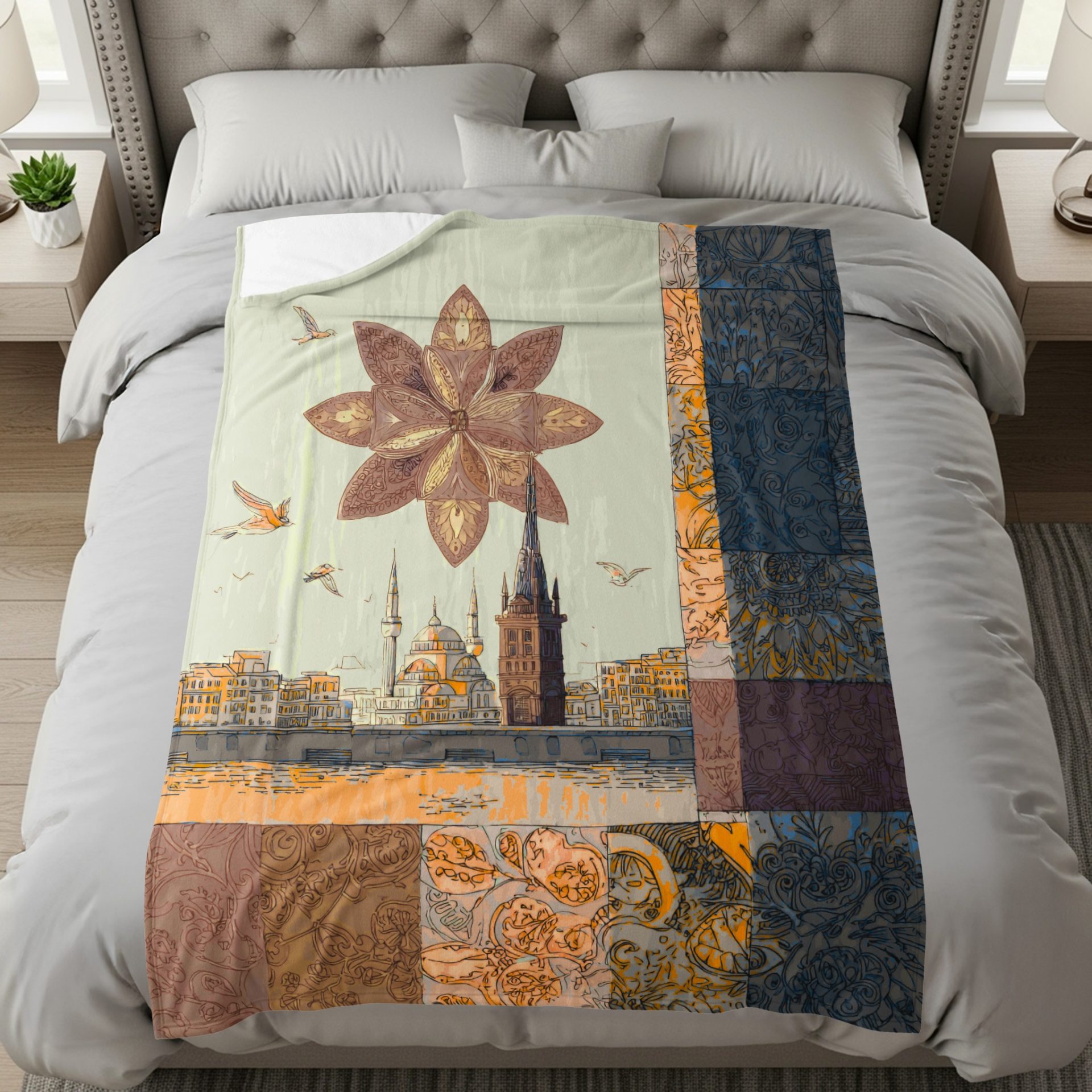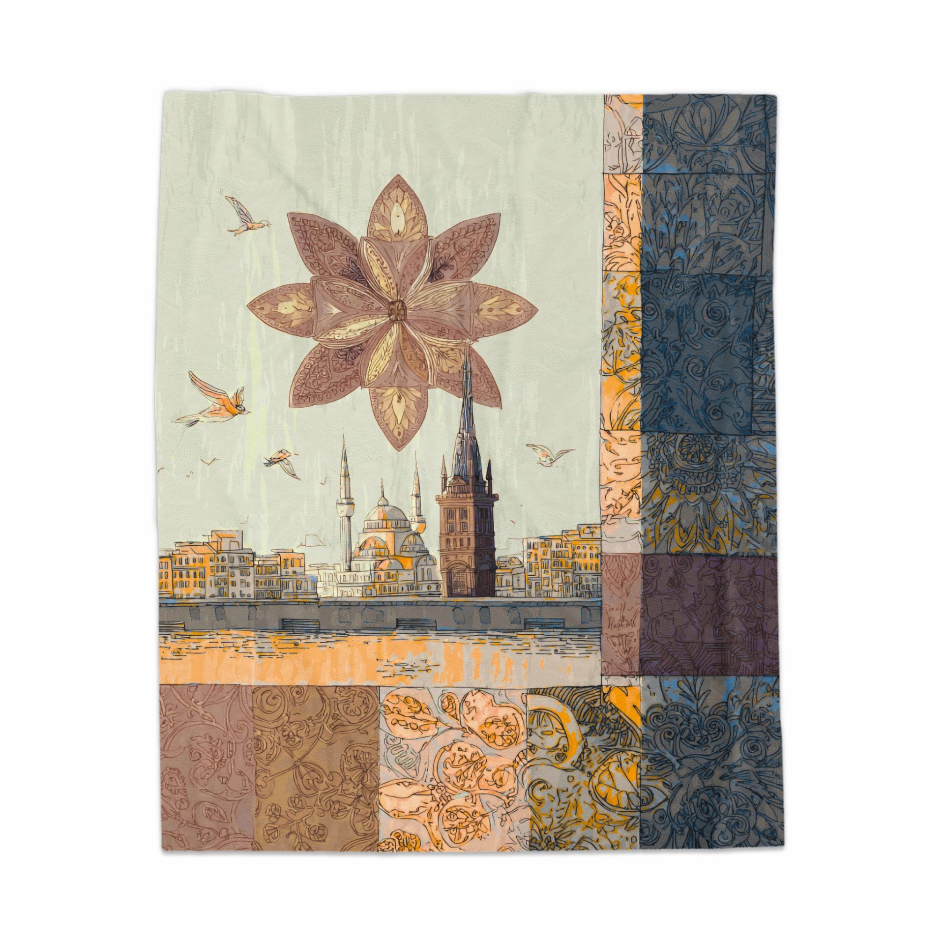 City View With Floral and Pattern Squares Decorative Blankets