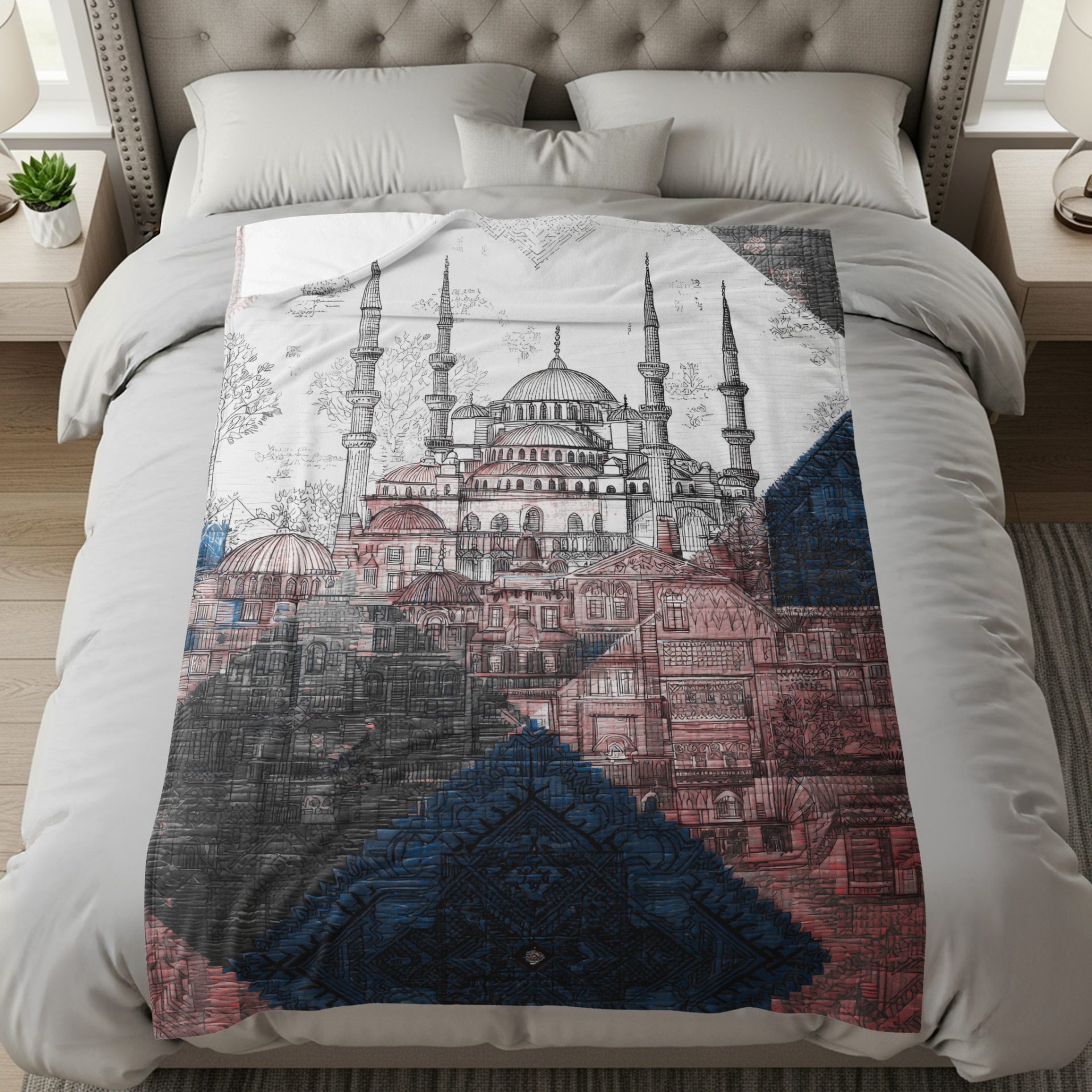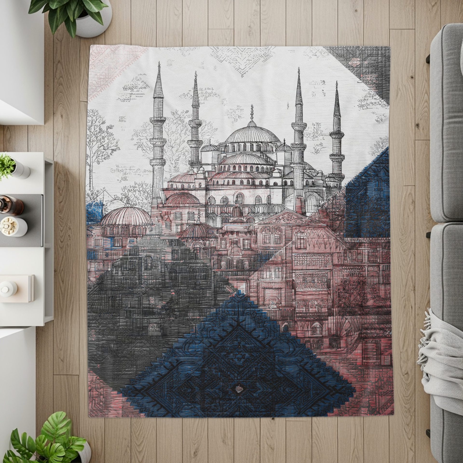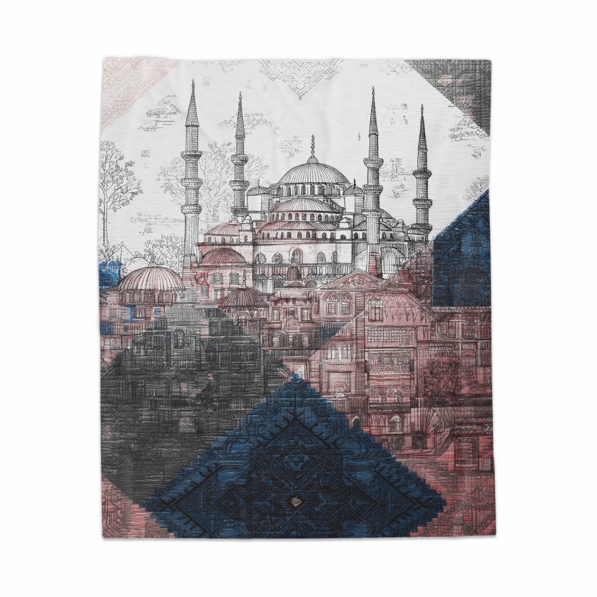 Experience the beauty of a hand drawn Blue Mosque cityscape with our distinctive Abstract Blankets. These blankets feature a colorful intricate design for your enjoyment.