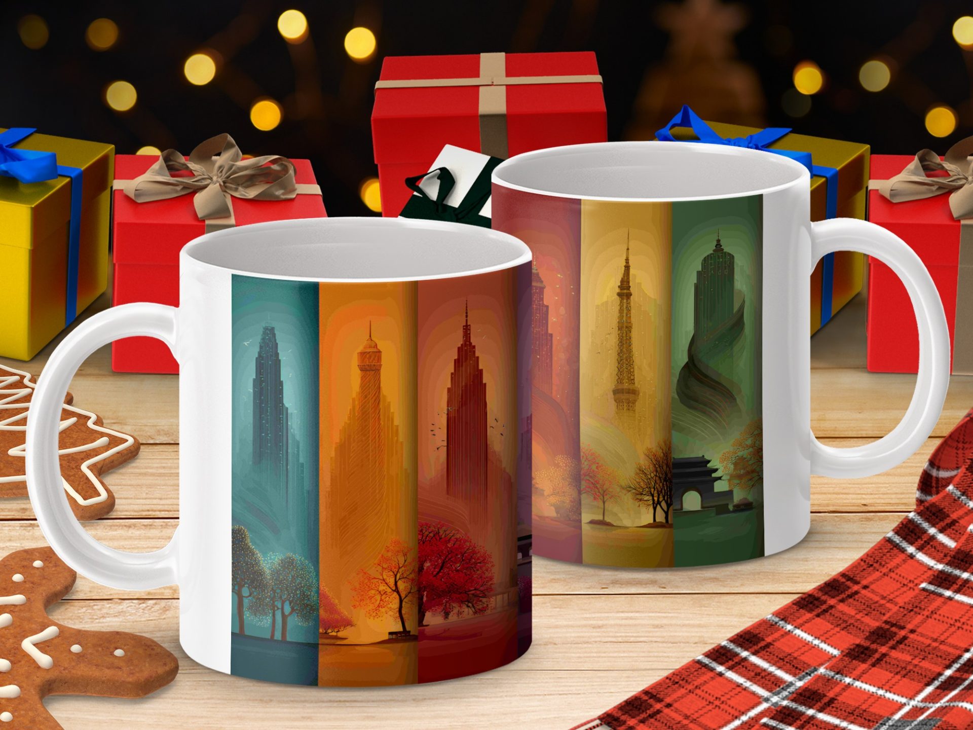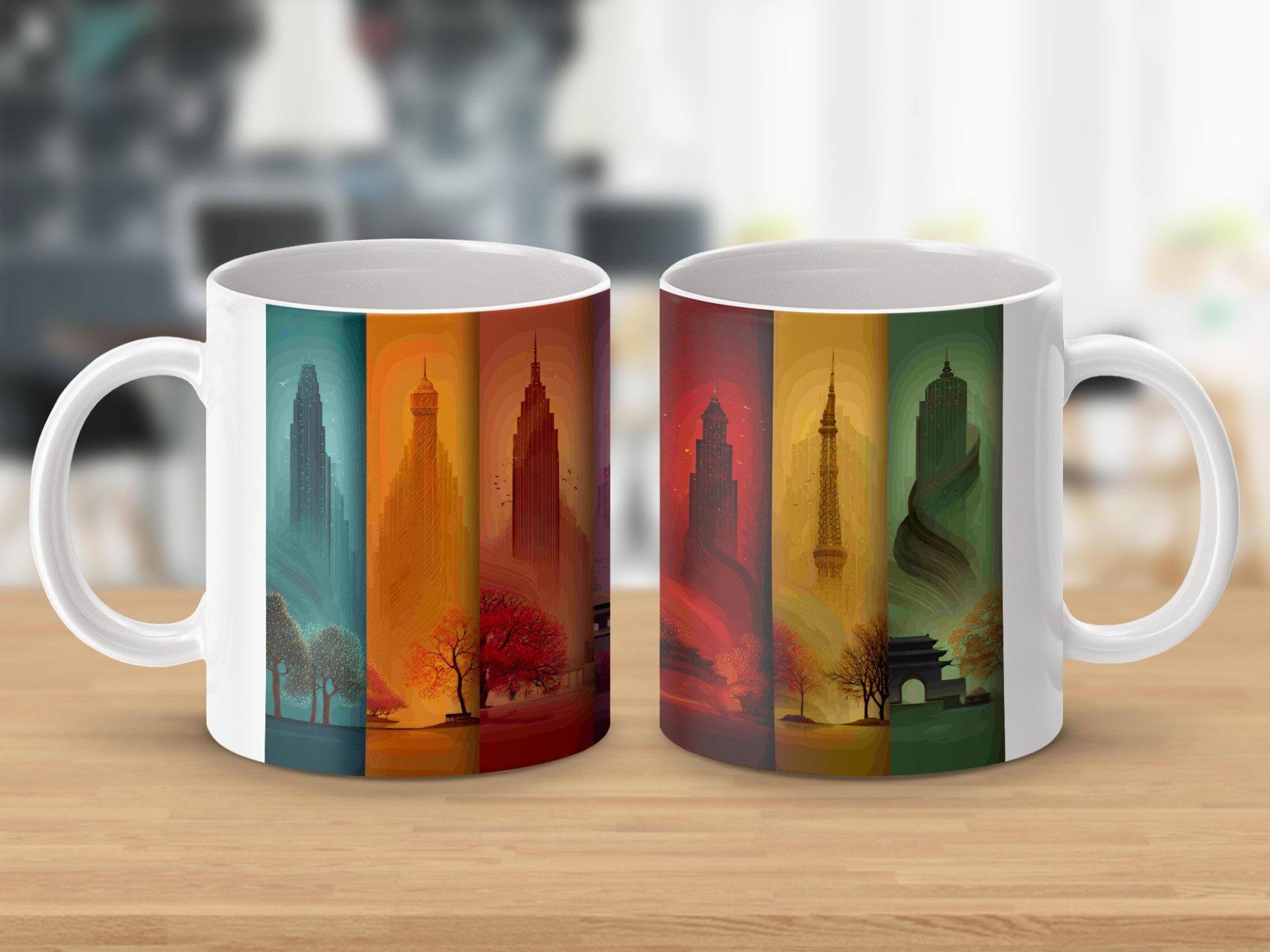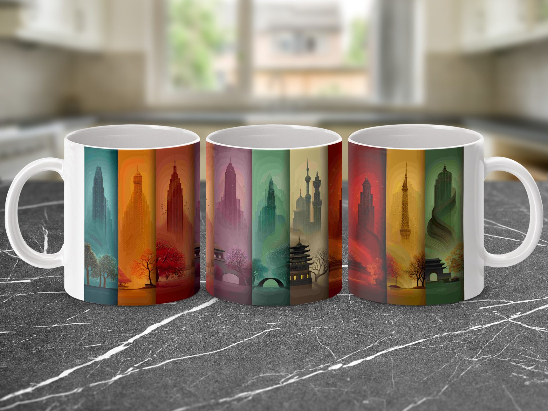 Immerse yourself with skyline artistry. Features stunning depictions of iconic towers and landmarks across colorful landscapes. Enhance your drink experience with a visual treat.