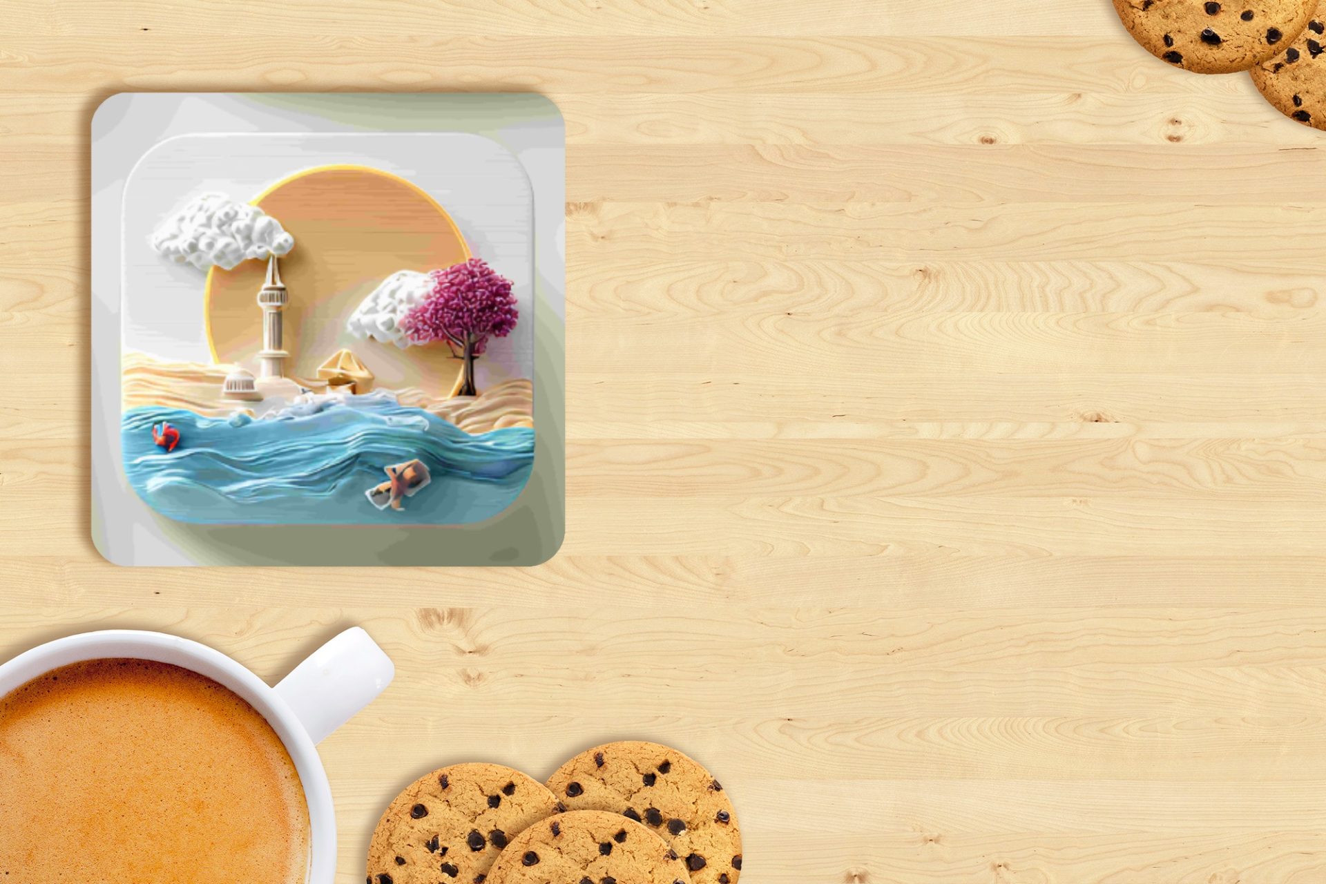 Coastal Town With Trees and Clouds Artistic Design Coasters