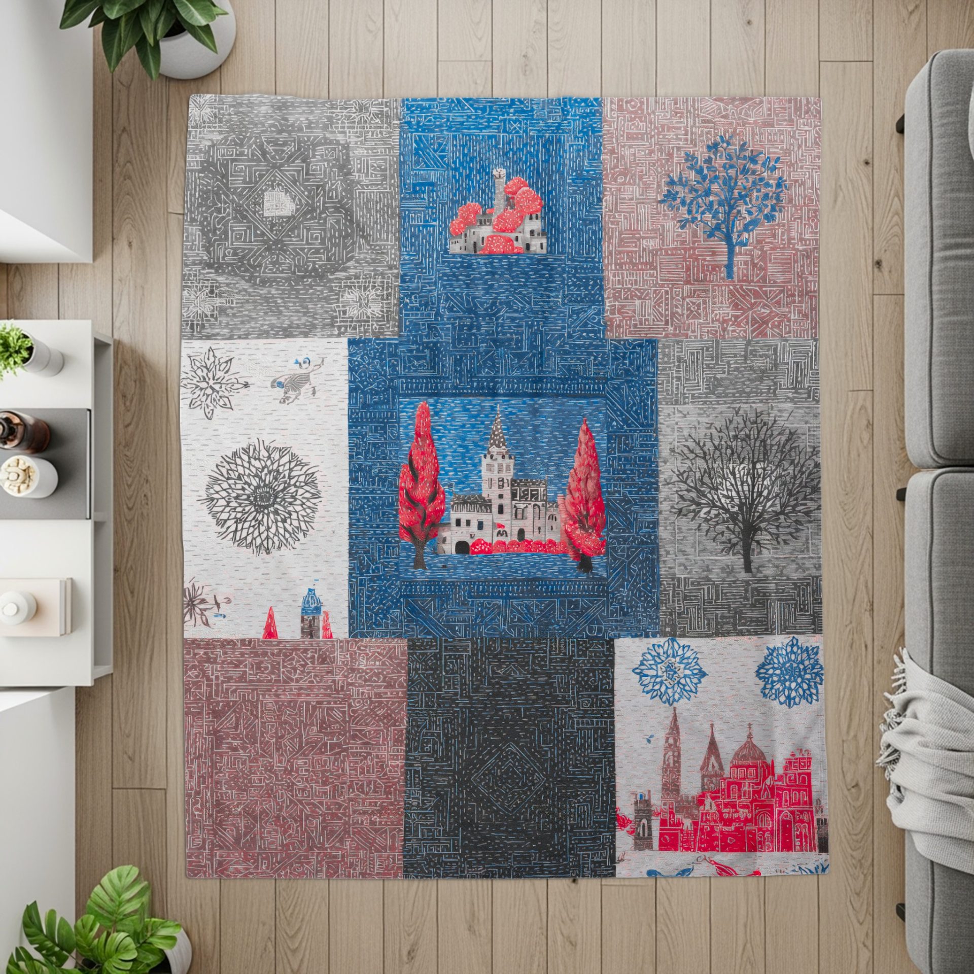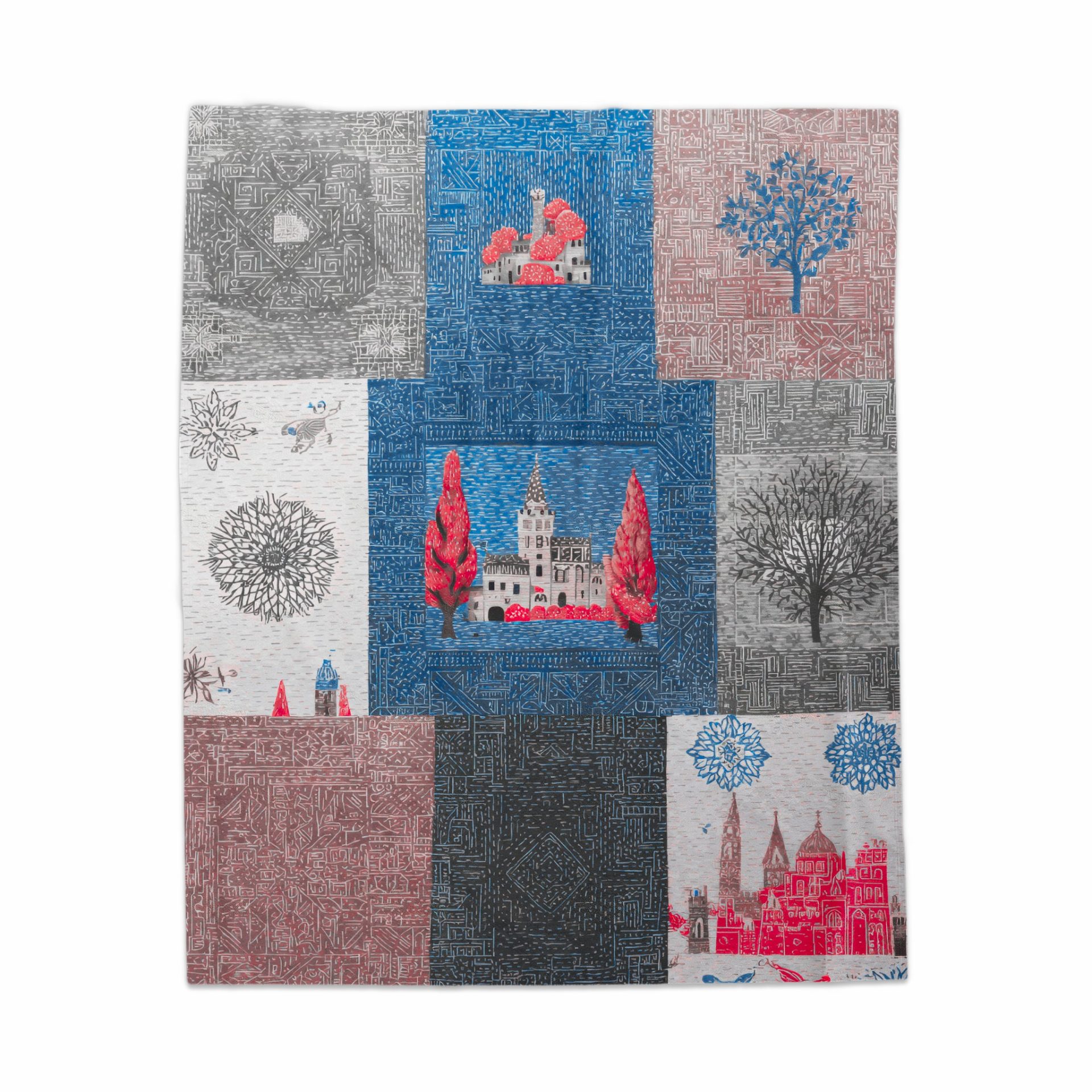 Indulge in the charm of architectural artistry with our unique design pattern blankets. Showcasing colorful buildings and tree graphics this blanket makes spaces inviting with warmth and style.