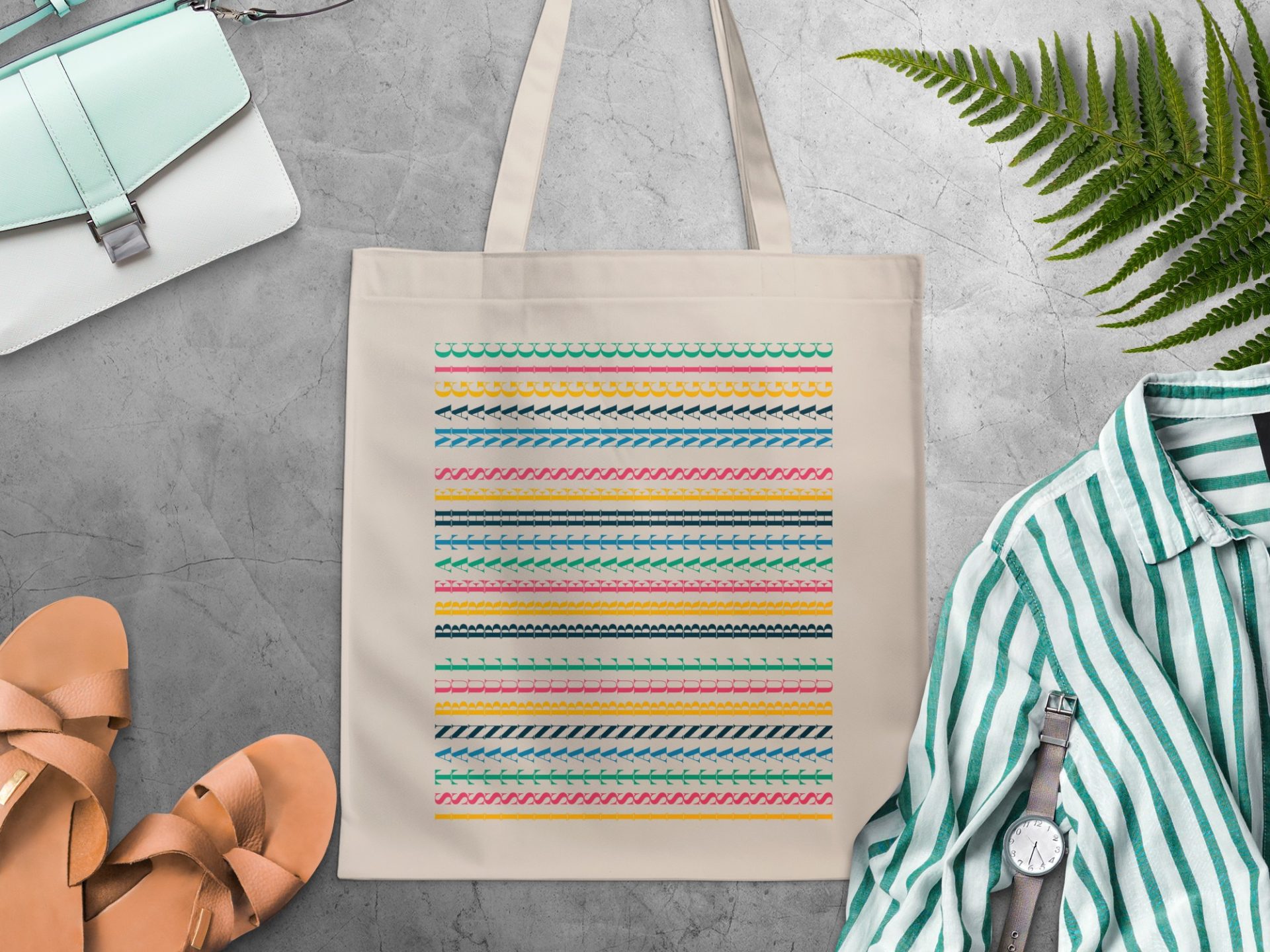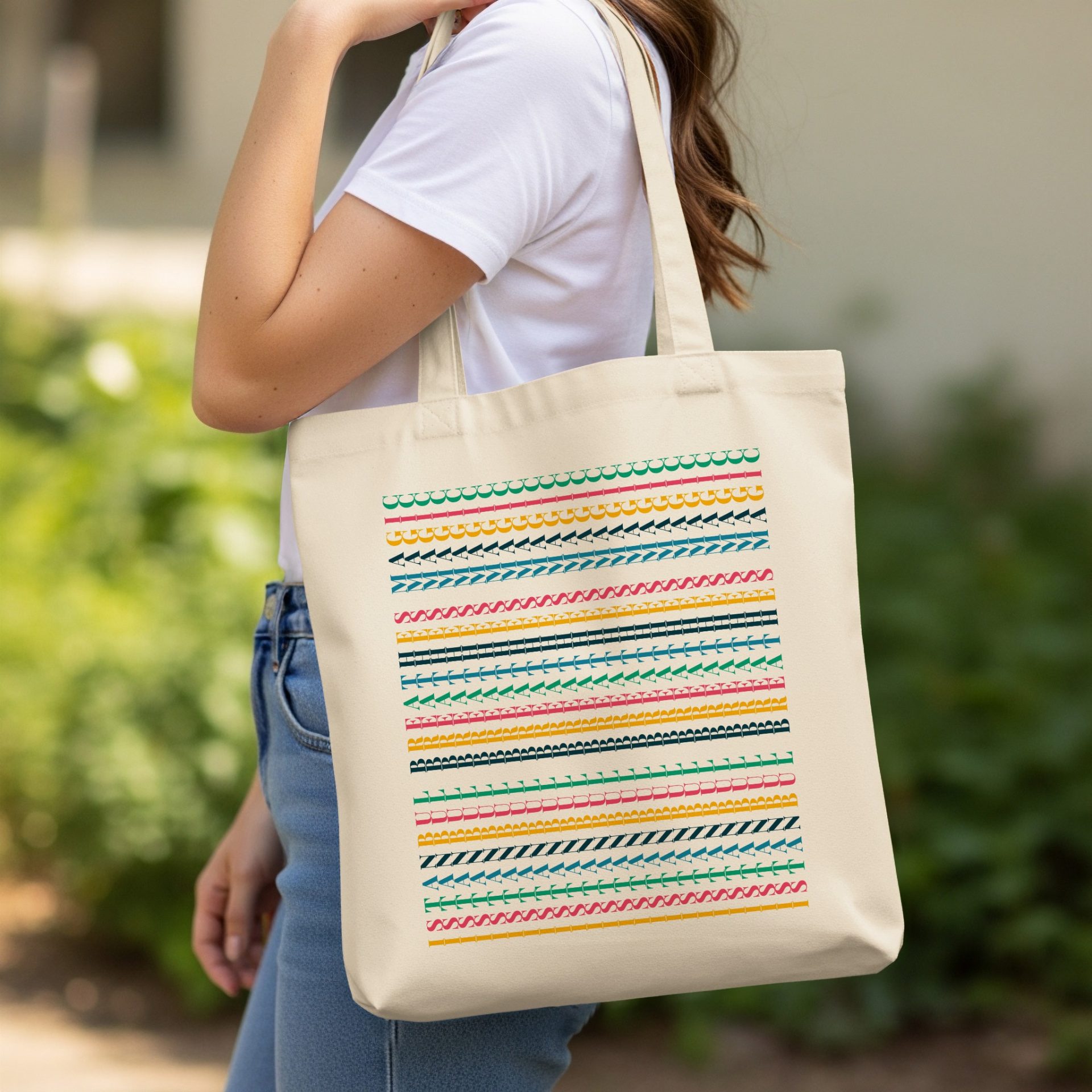 Add flair to your everyday life with this patterned tote bag. It features vibrant repeating letters and geometric shapes. Perfect for shopping or travel. Get yours today!