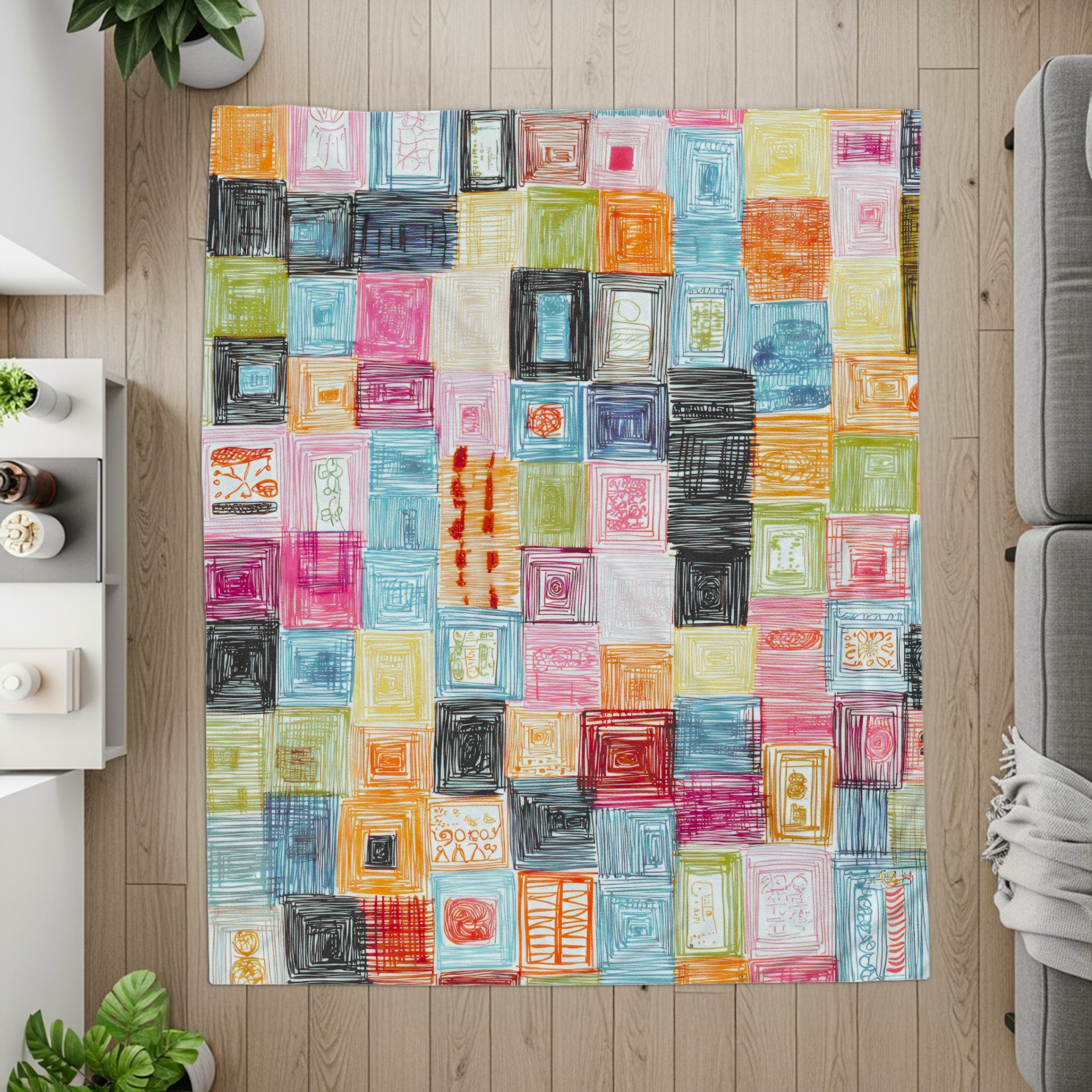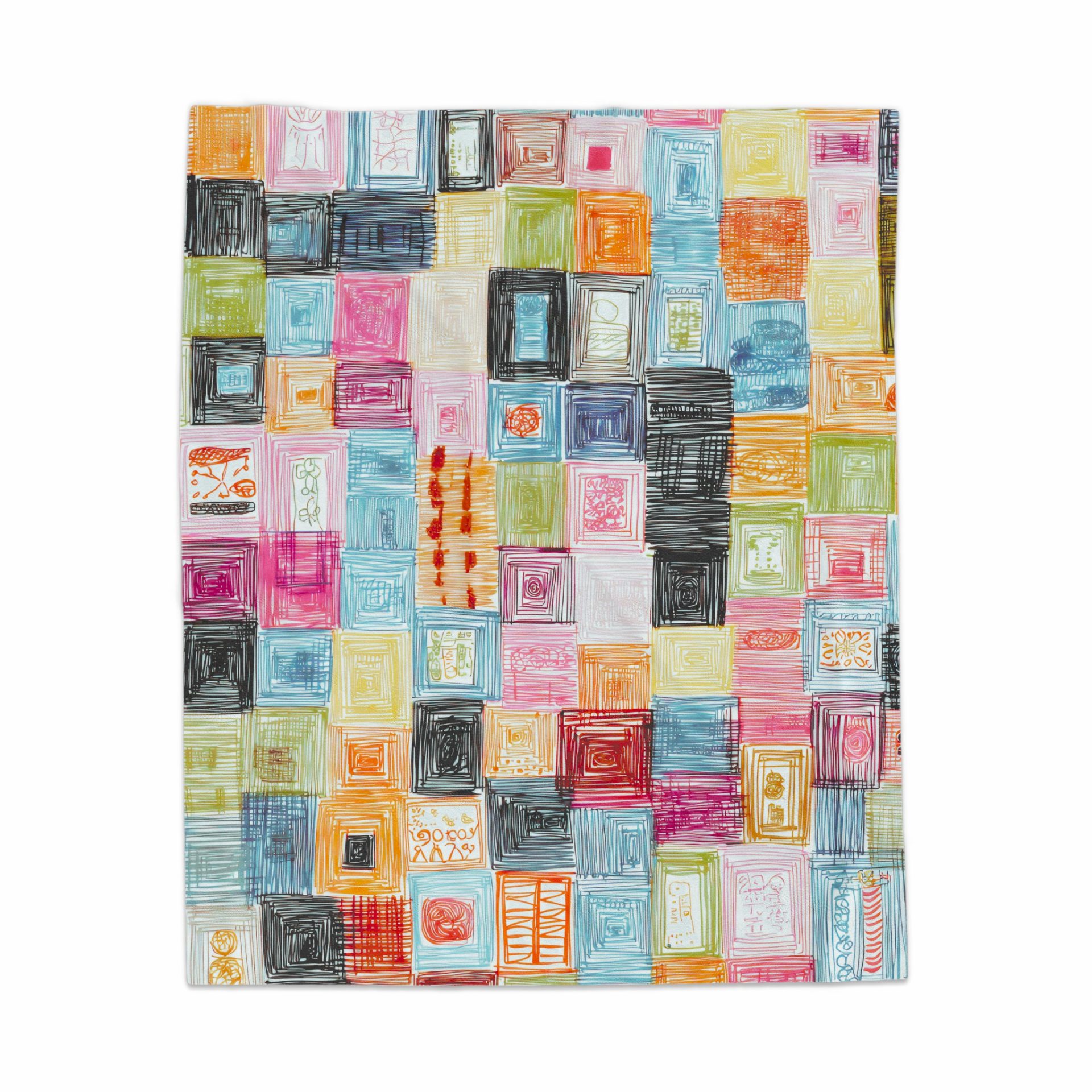 Colorful Sketch Art in Squared Frames Pattern Blankets