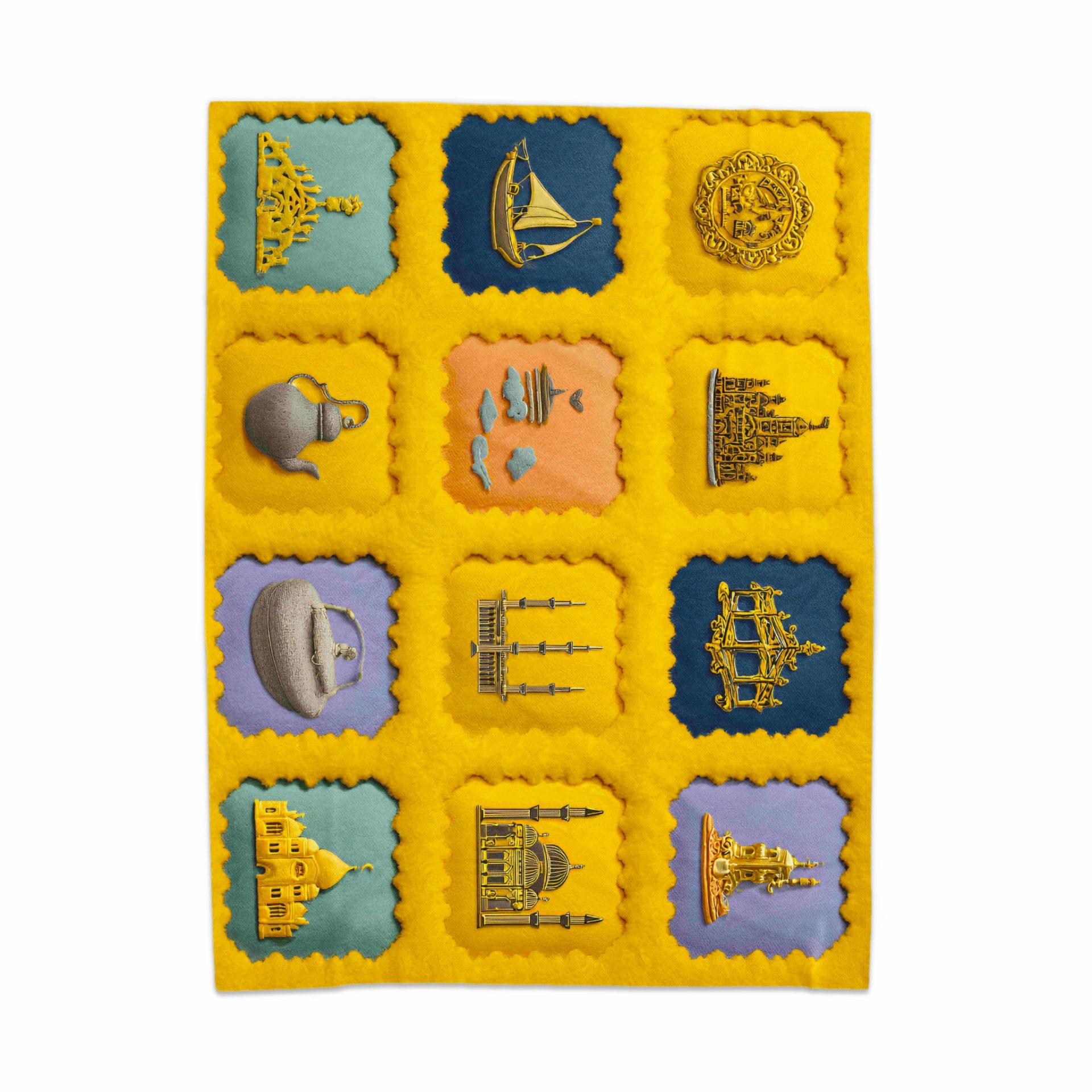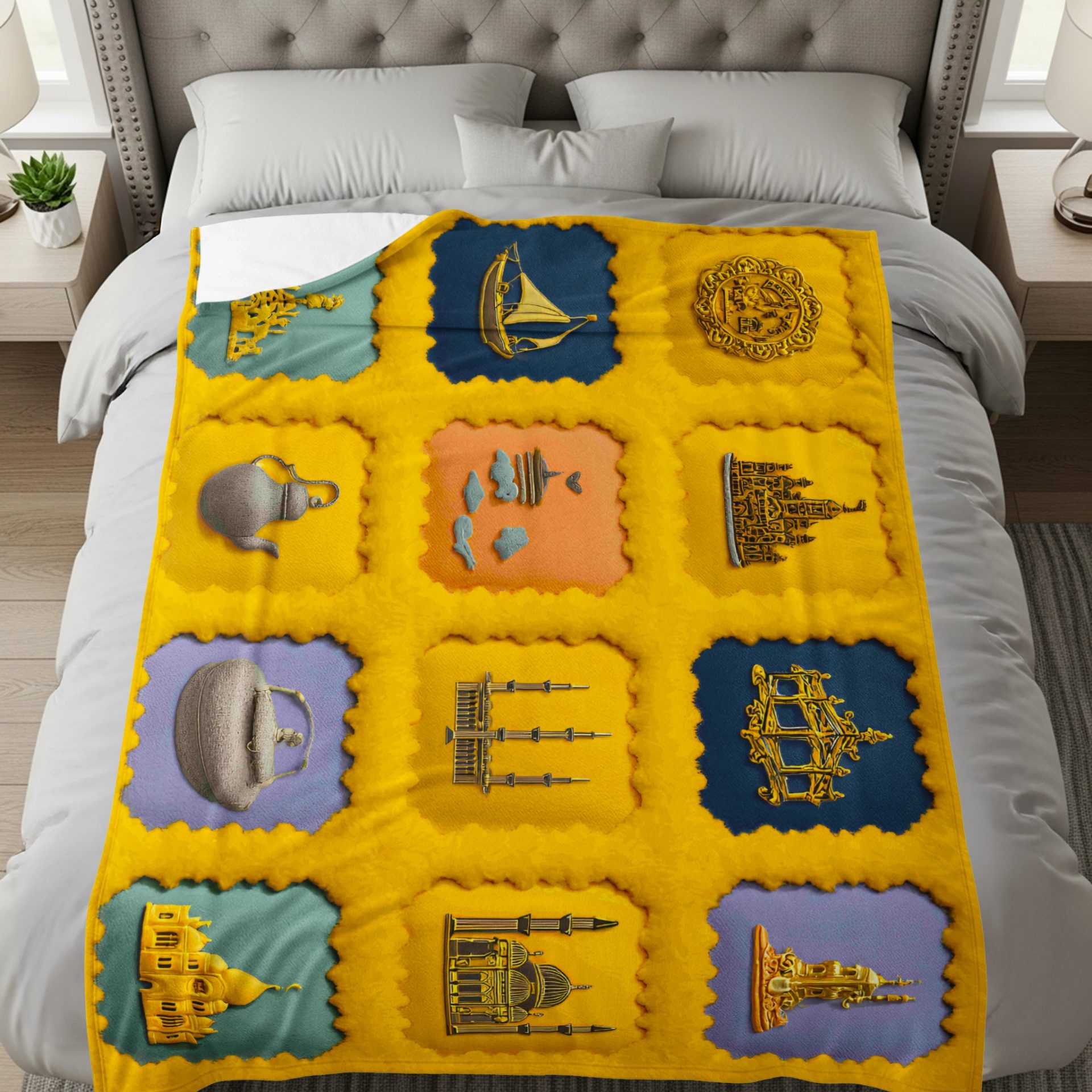 Discover distinctive blankets showcasing cultural icons and golden architectural structures. Infuse your living space with unique designs that blend comfort and artistic expression today!