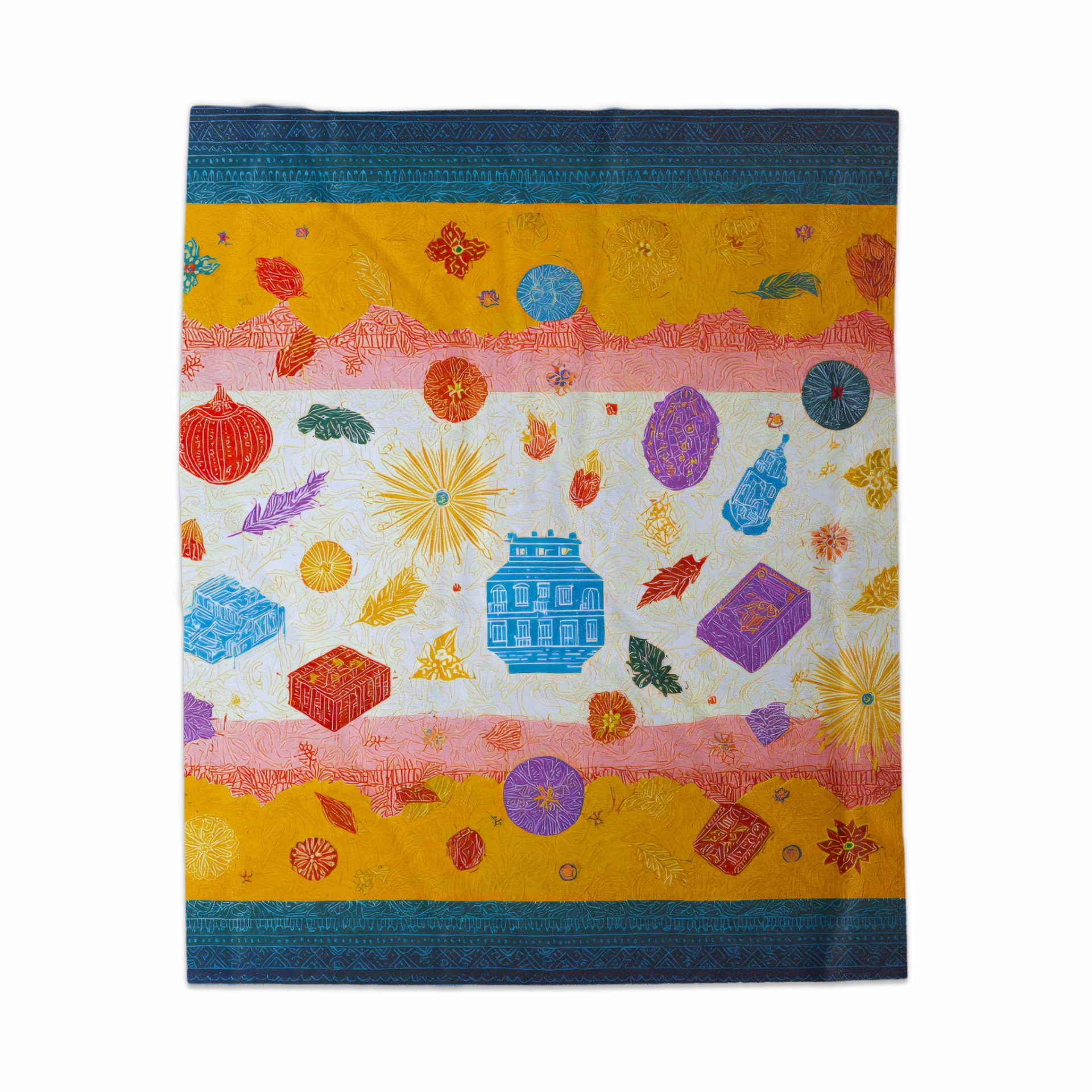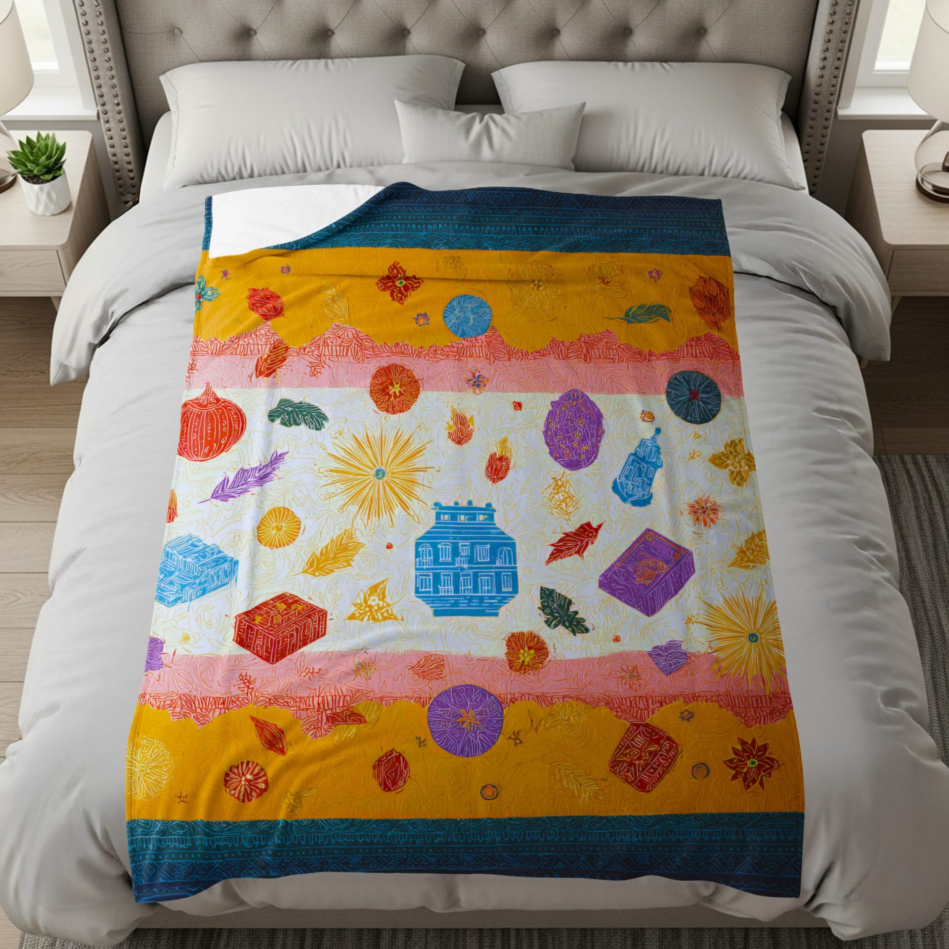 Add an artistic splash to your space with this eclectic blanket featuring an array of colorful motifs. Perfect for adding a touch of personality to any room with unique designs.
