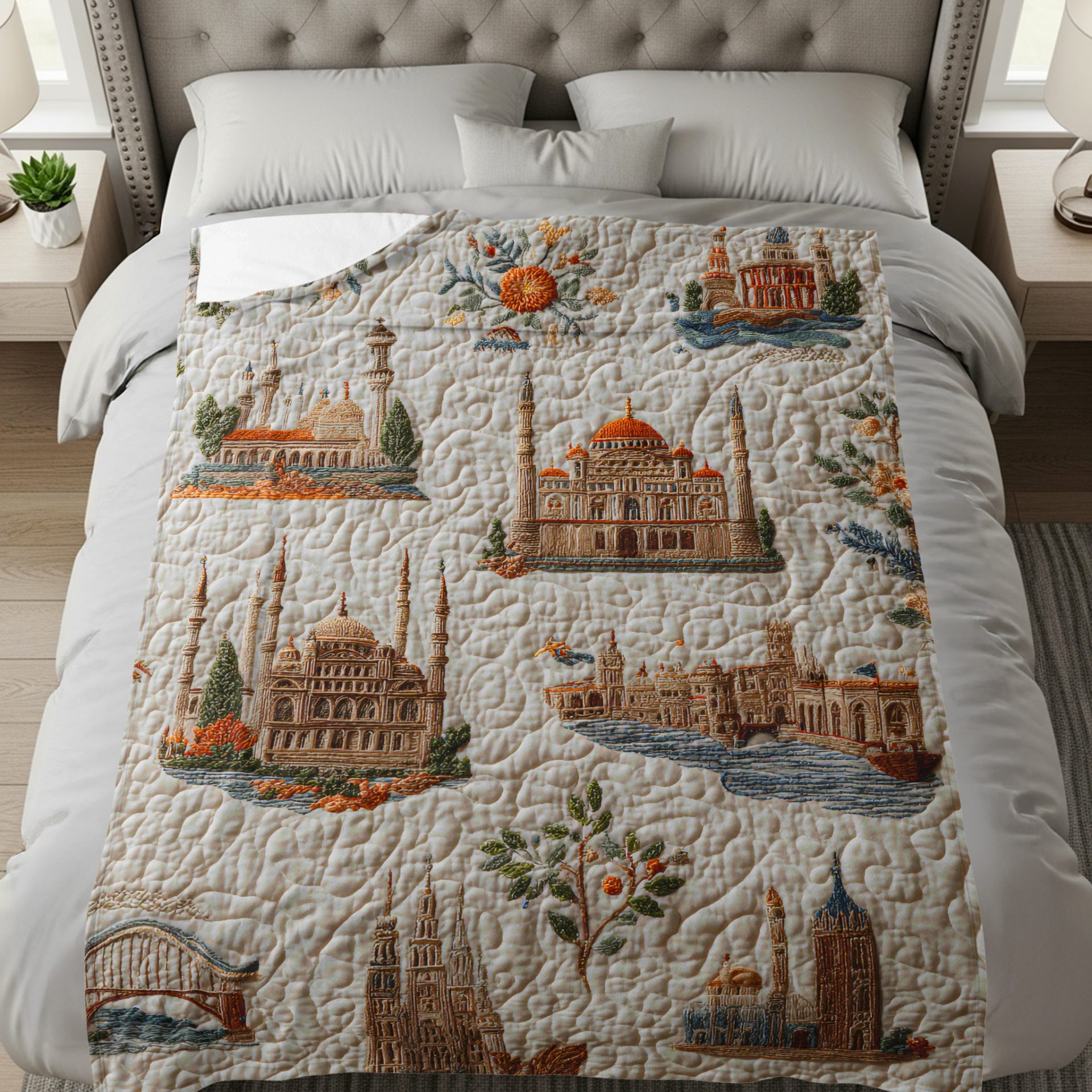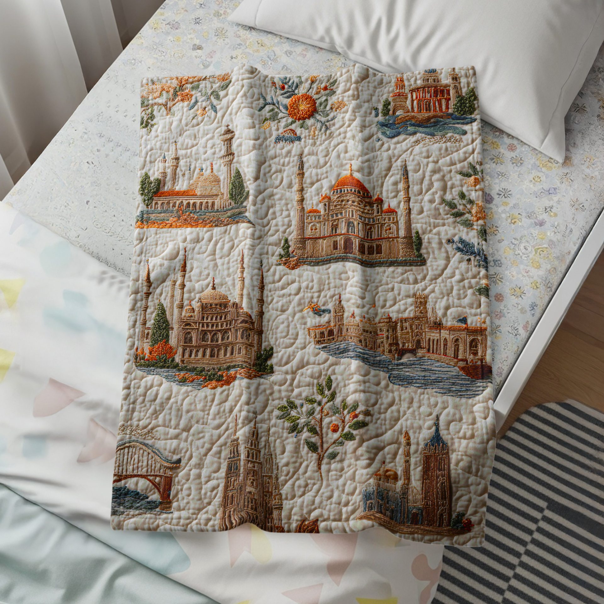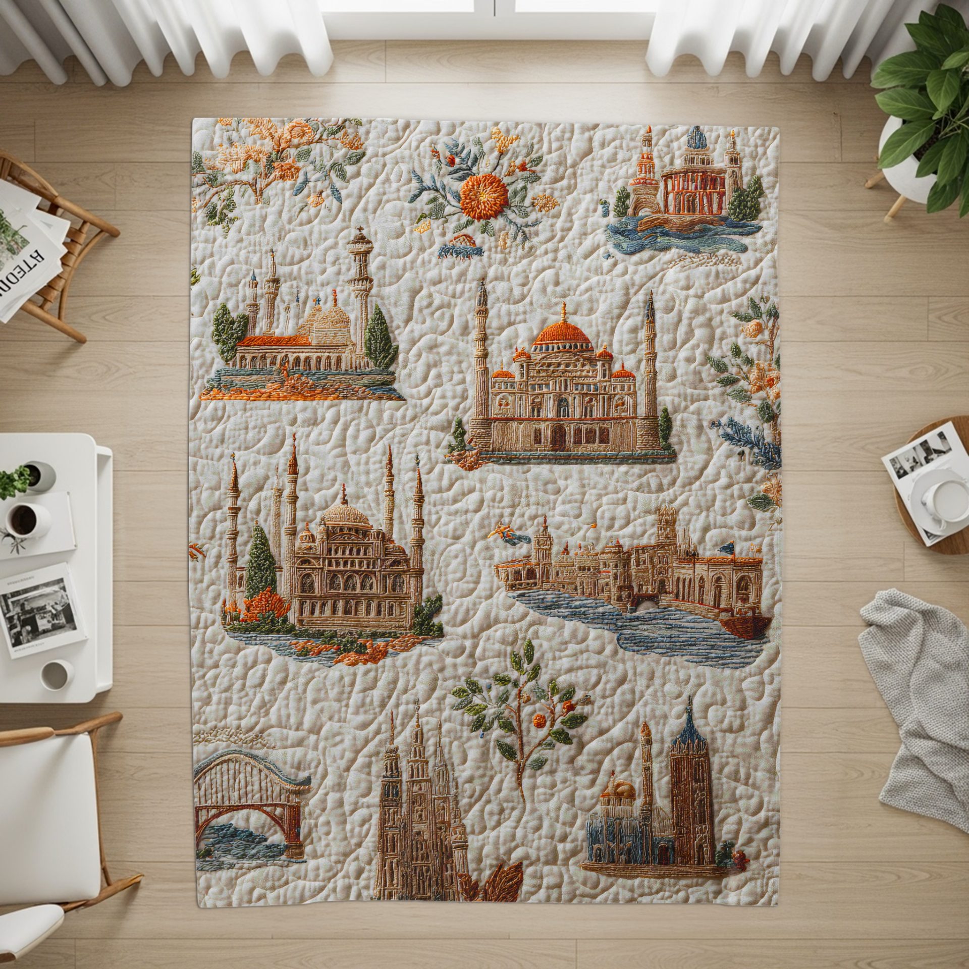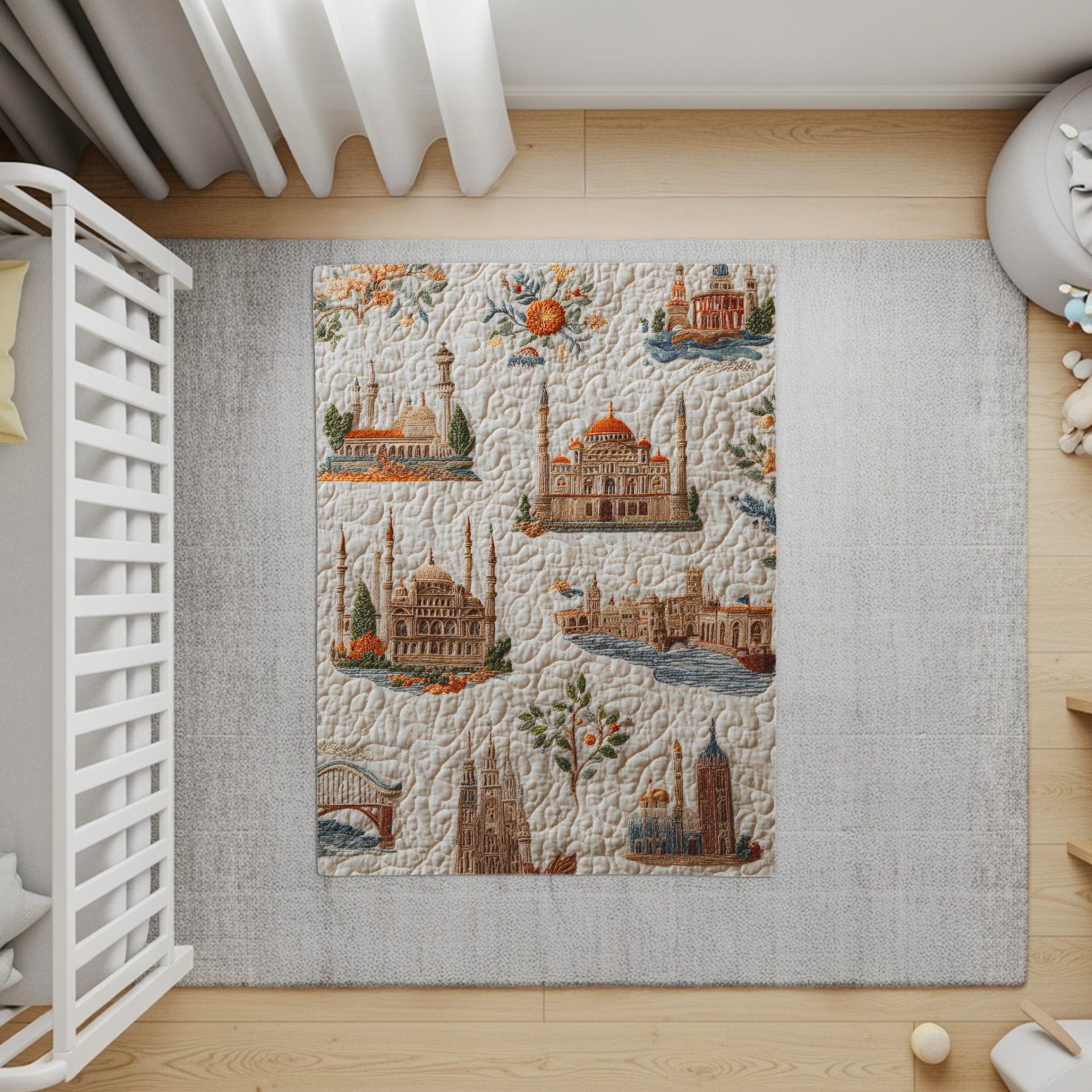 Wrap yourself in artistic elegance with this blanket. Featuring embroidered monuments and floral designs this blanket adds beauty and comfort to any space. A decorative piece.