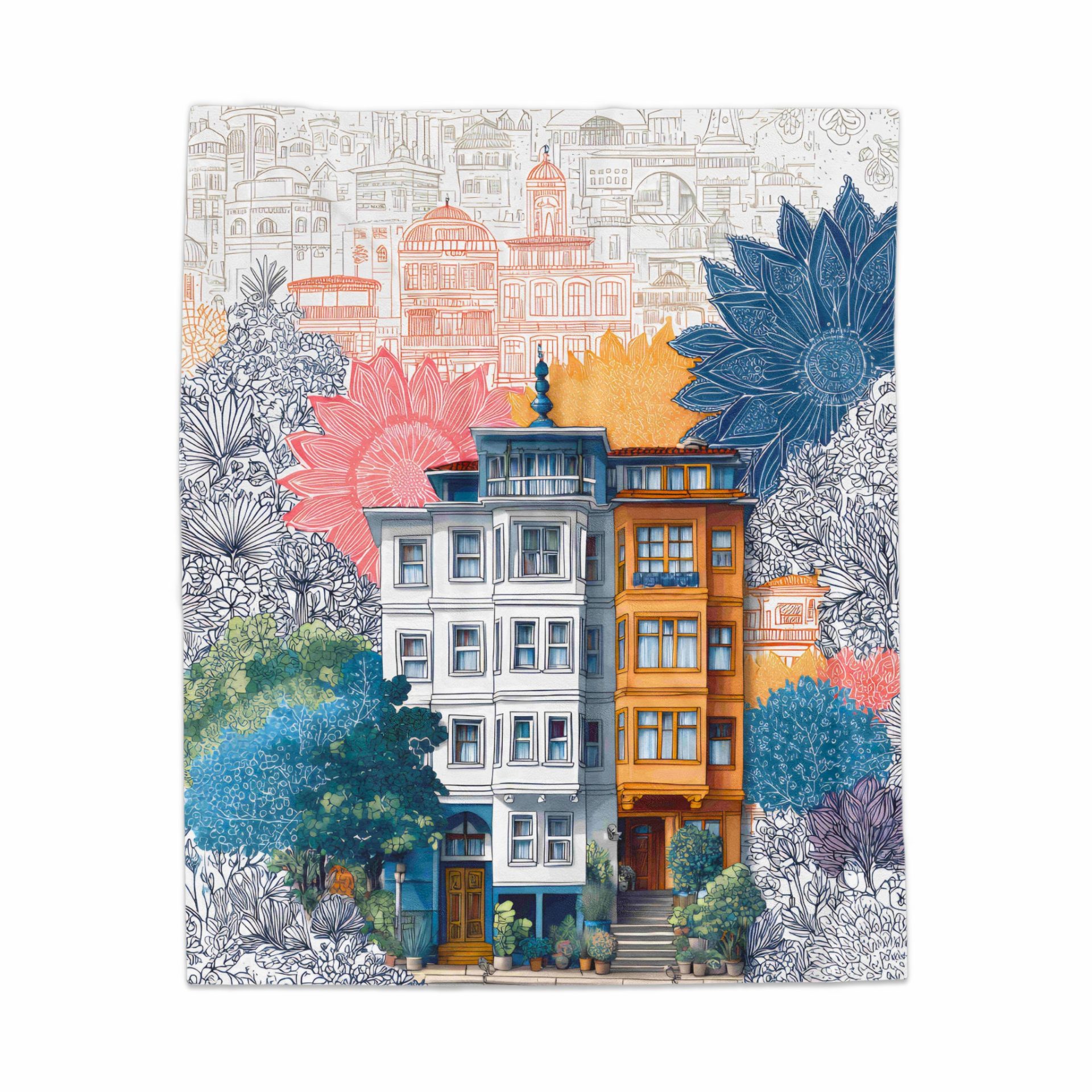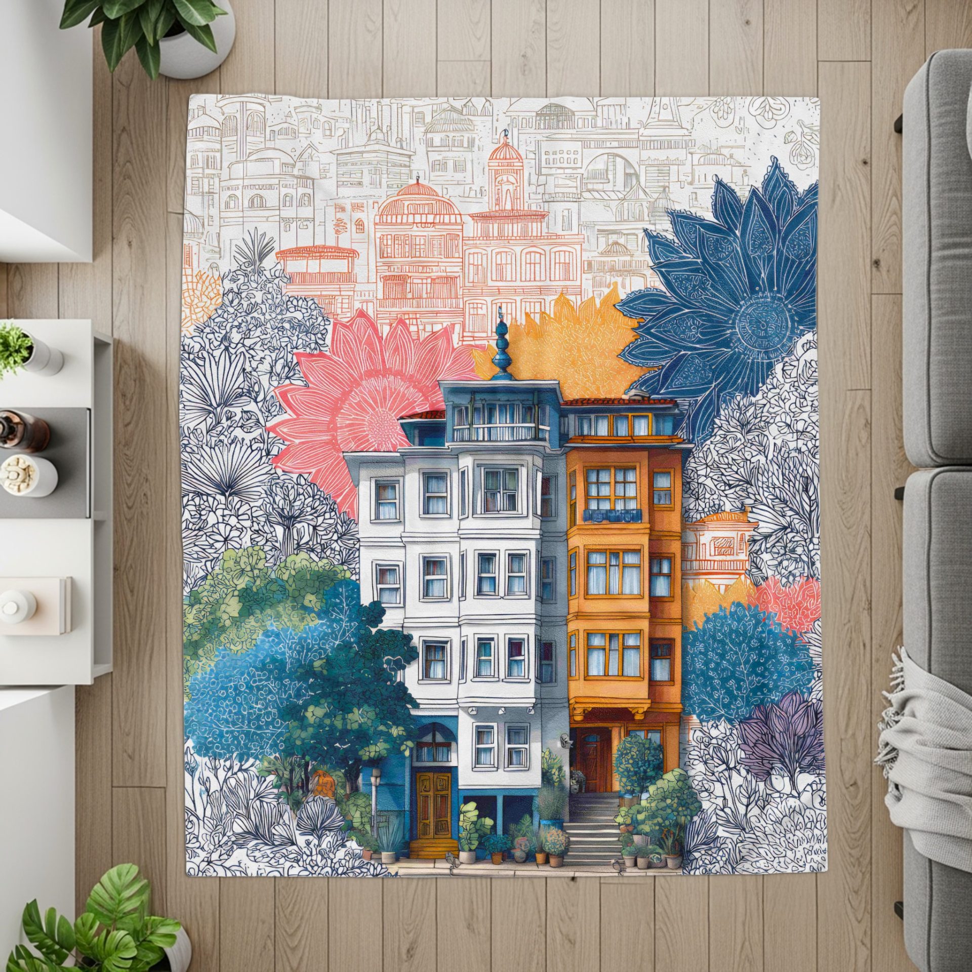 Transform your space with our unique floral building design! Featuring artistic cityscape integrated with botanical elements. Shop our vibrant blankets and add a touch of cozy style today.