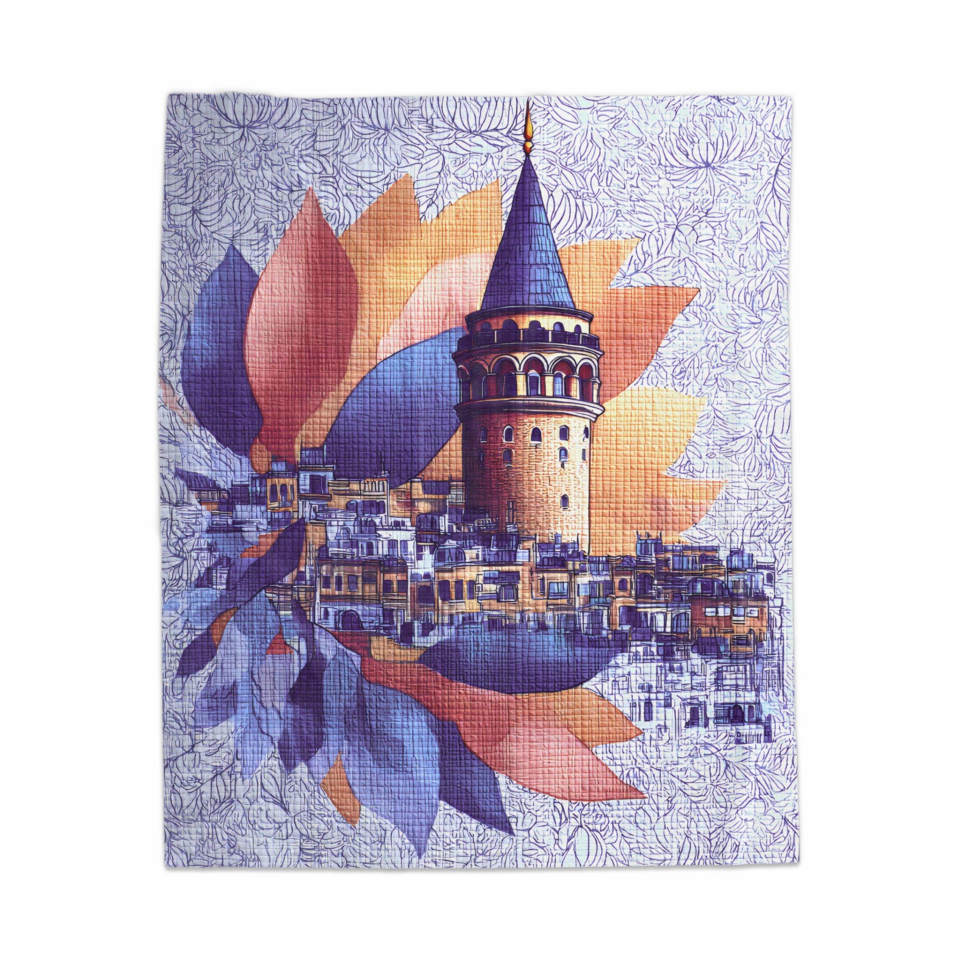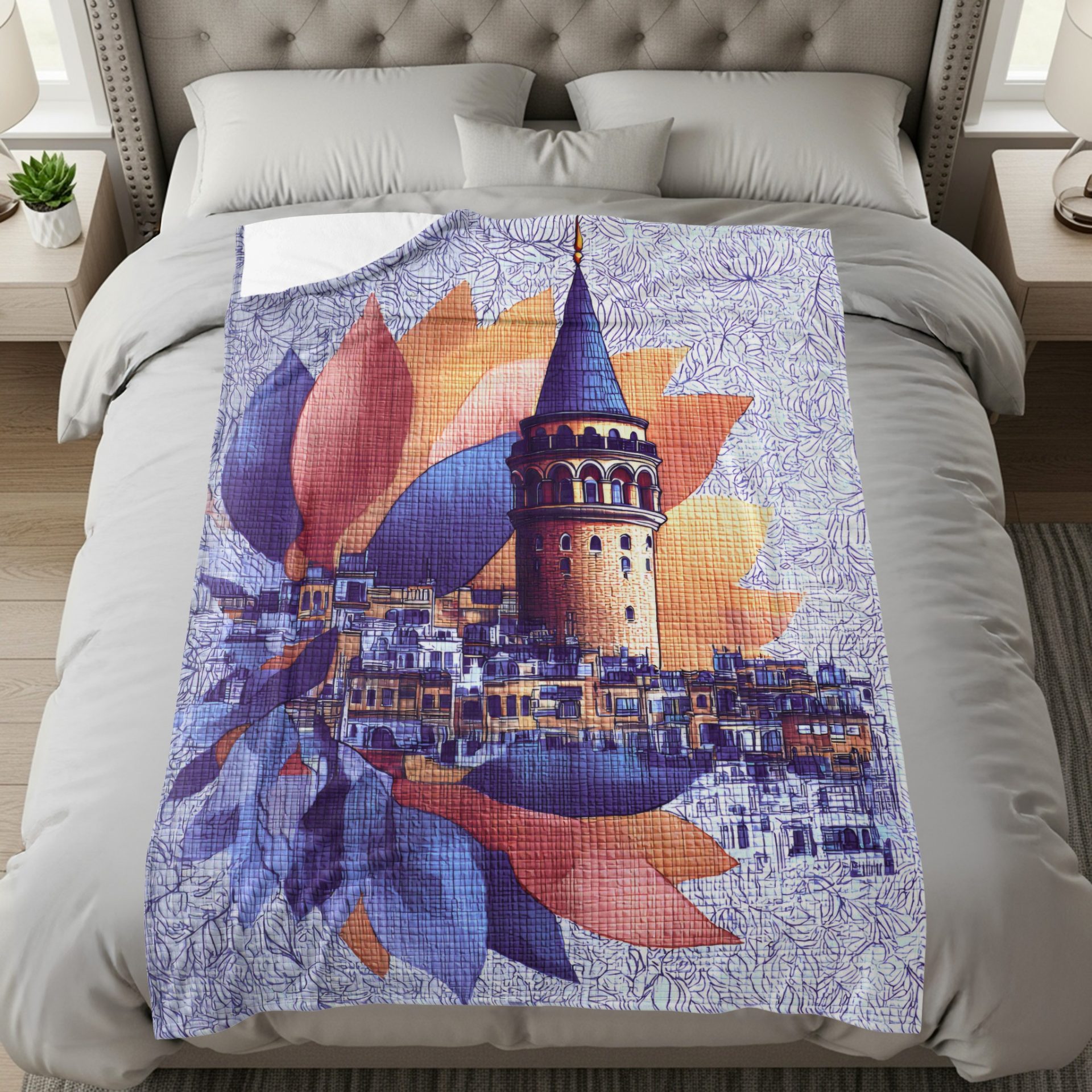 Galata Tower Artwork with Flowers and Cityscape Blankets