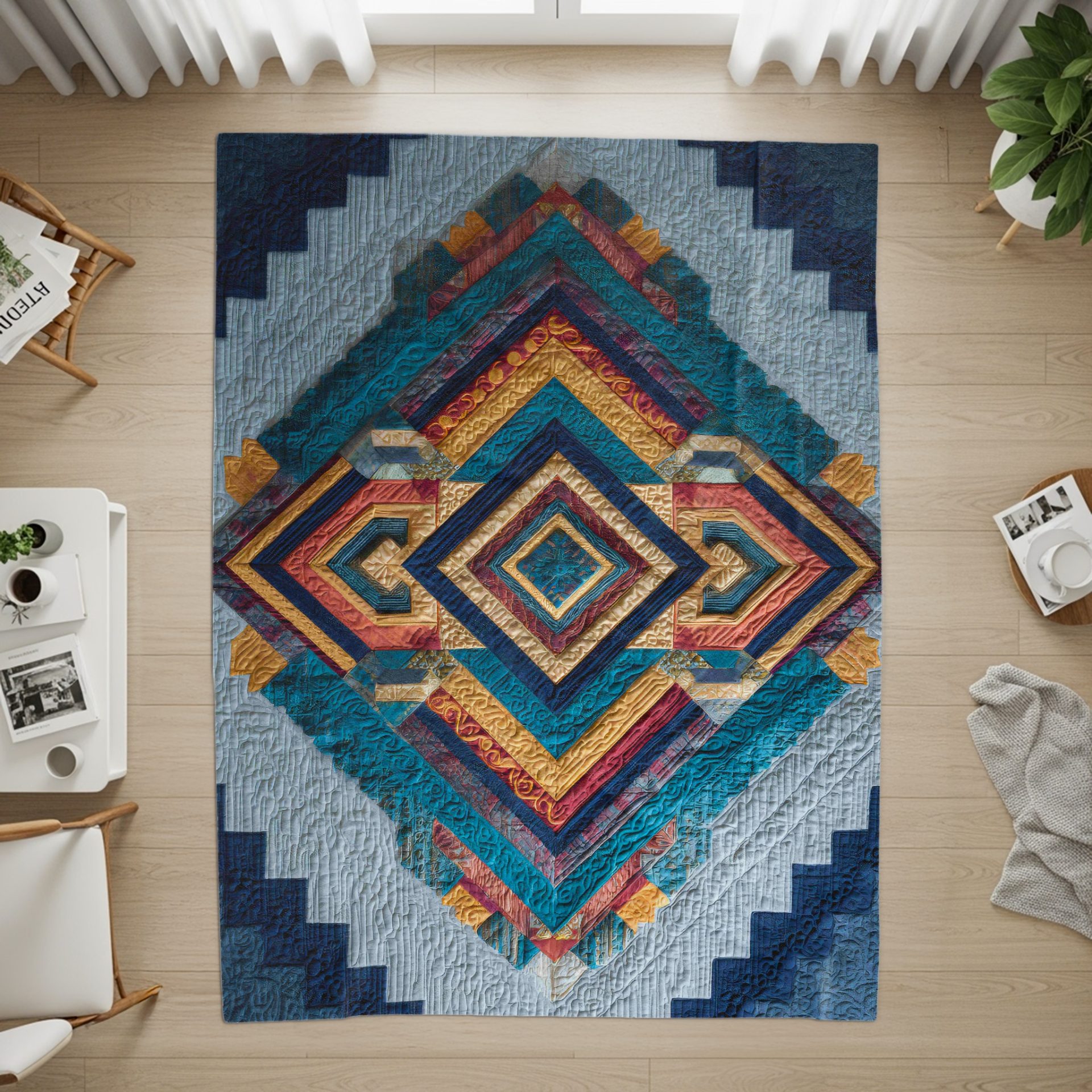 Elevate your home decor with this stunning geometric design blanket. The intricate abstract patterns and bold color palette bring a touch of modern artistry to any space. Enjoy unique comfort.