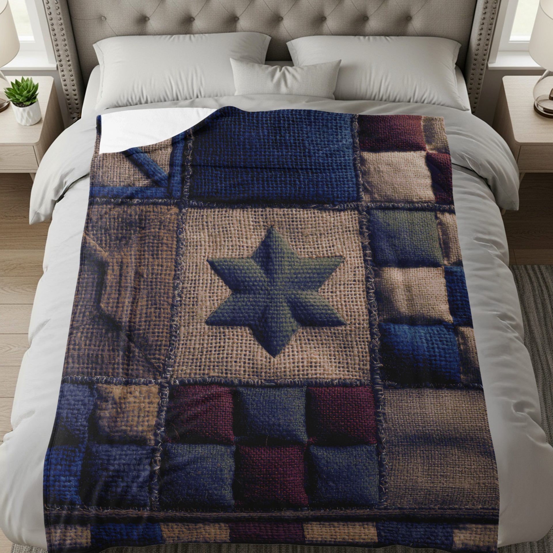 This gorgeous textured patchwork design blanket features geometric patterns and a striking star motif. Perfect for adding a touch of visual interest to your home decor or gifting.