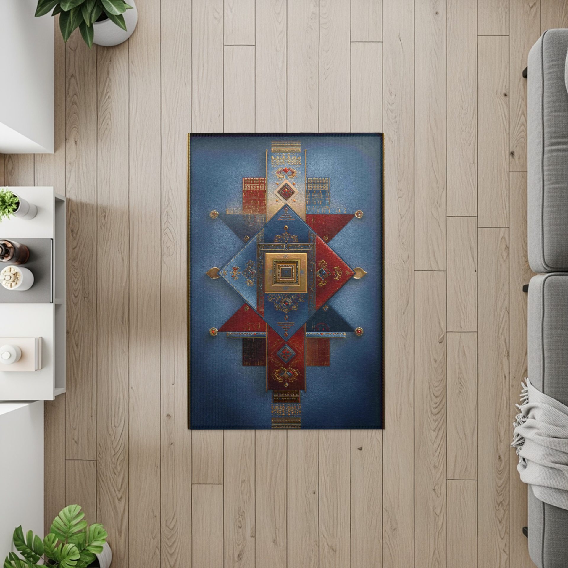 Geometric Shapes in Blue Red Gold Pattern Art Deco Rugs