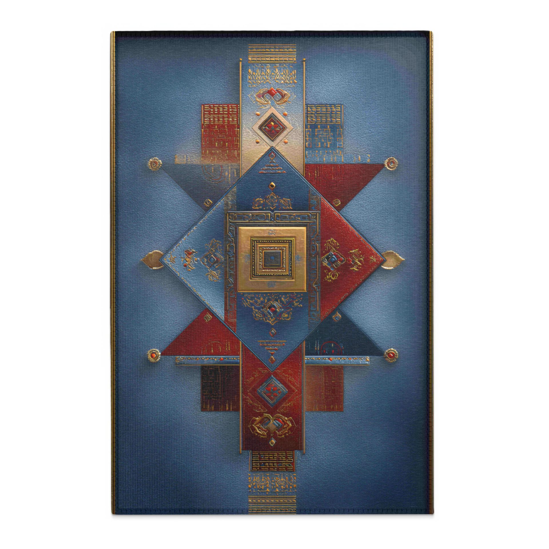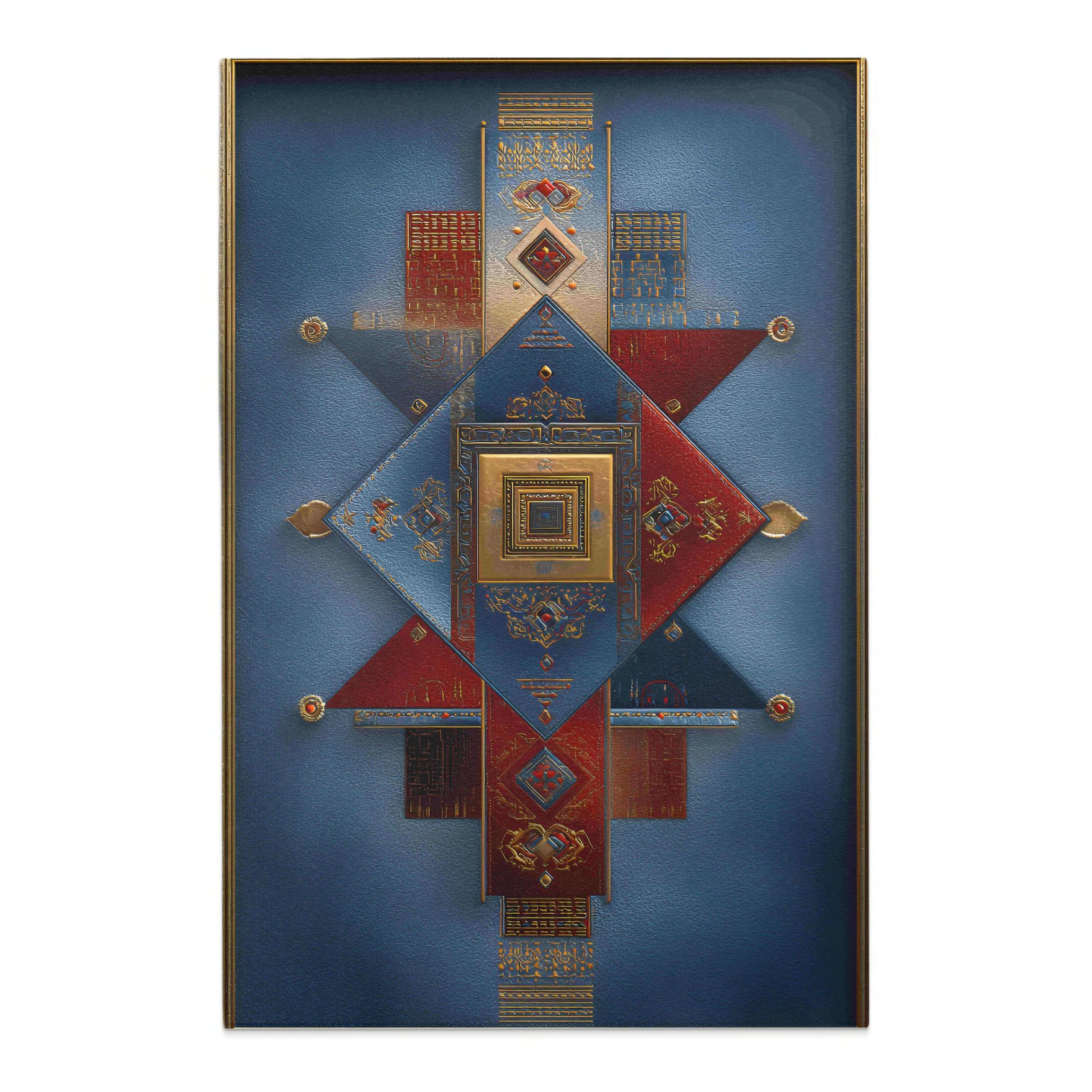 Embrace geometric beauty with this art deco inspired piece featuring geometric shapes in an arrangement of blue red and gold. This captivating design can add elegance to space.