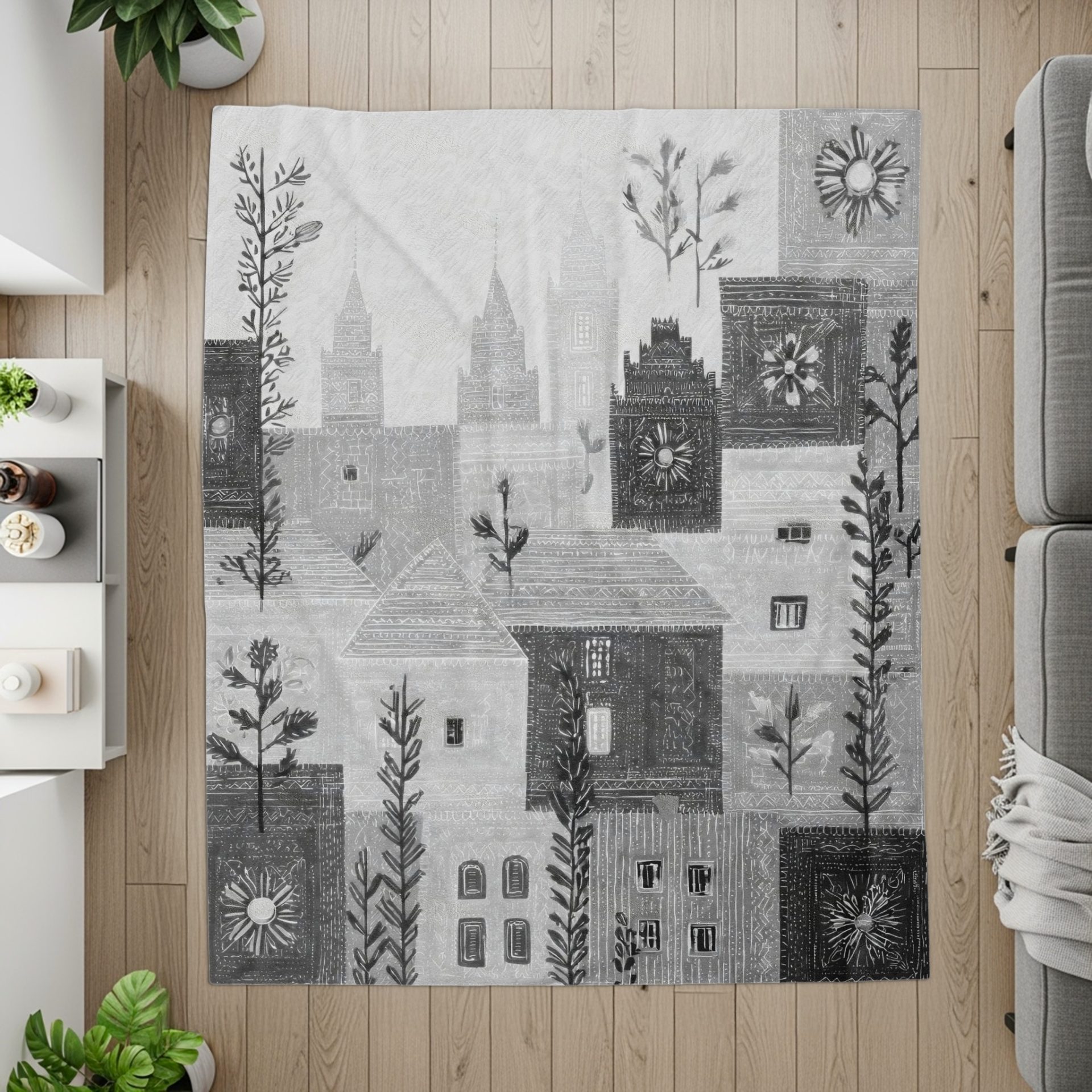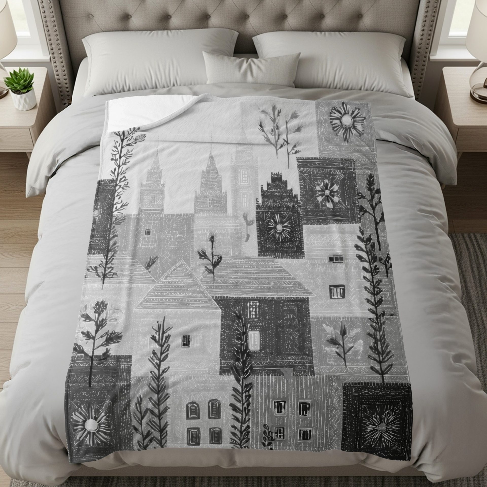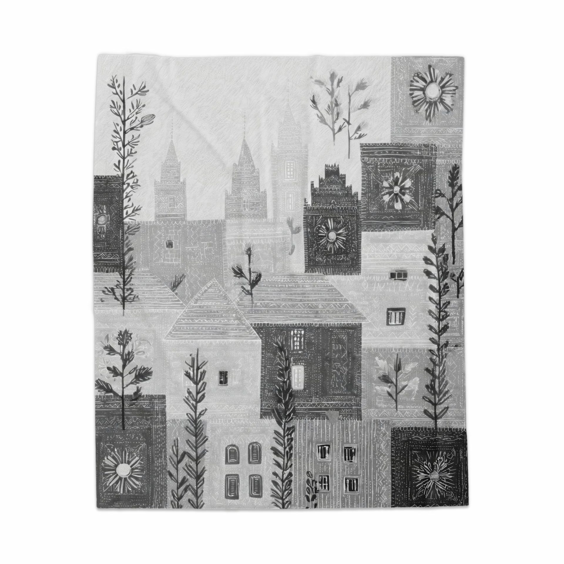Explore our gray patterned blankets featuring unique houses flowers and towers design. Perfect for adding a touch of style decor comfort. Buy our blankets now online.