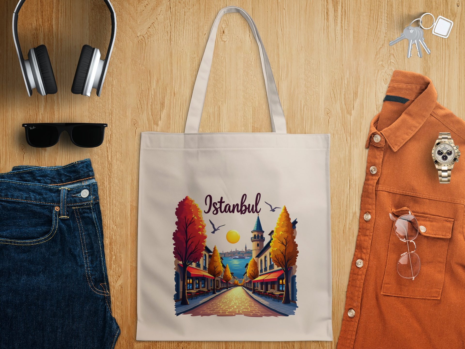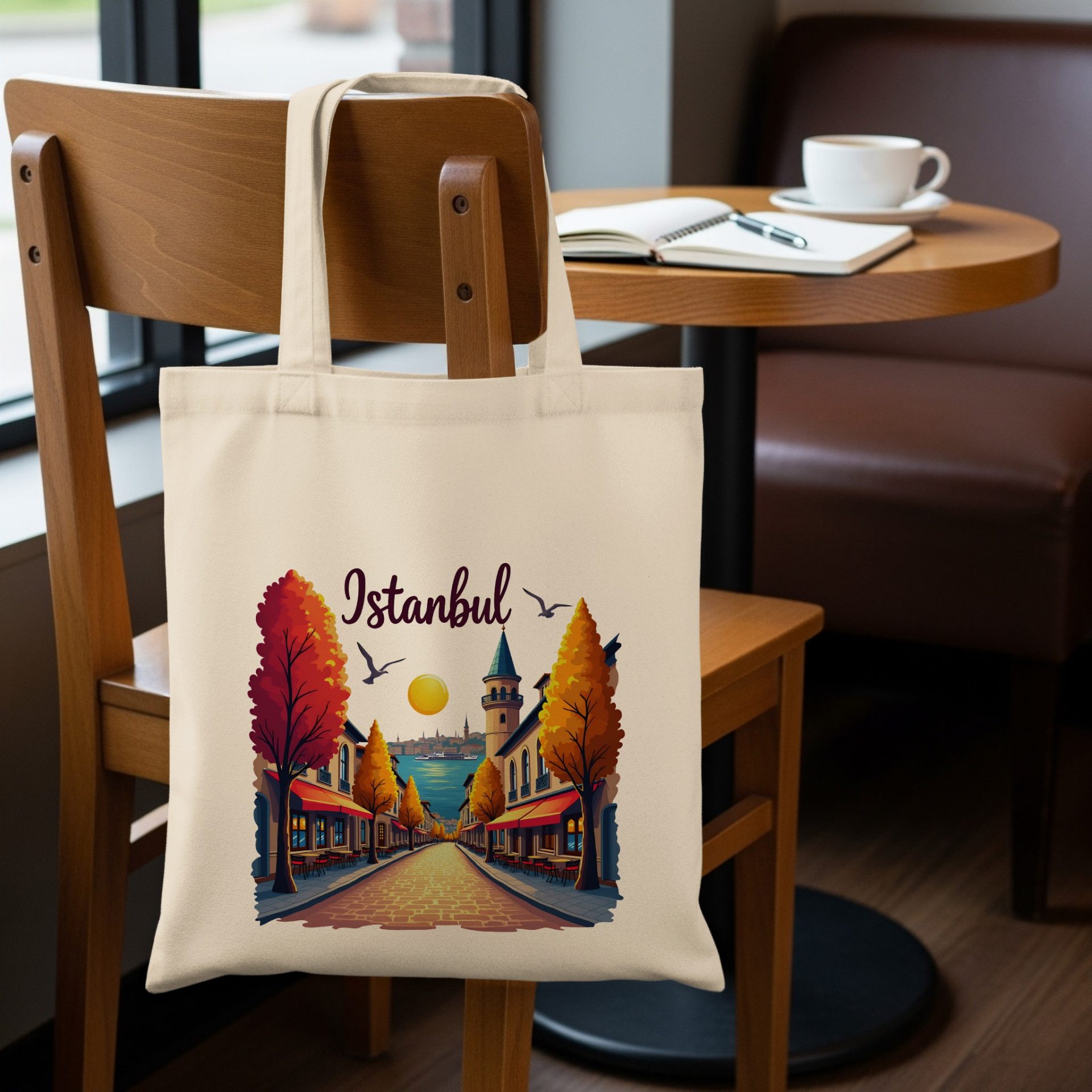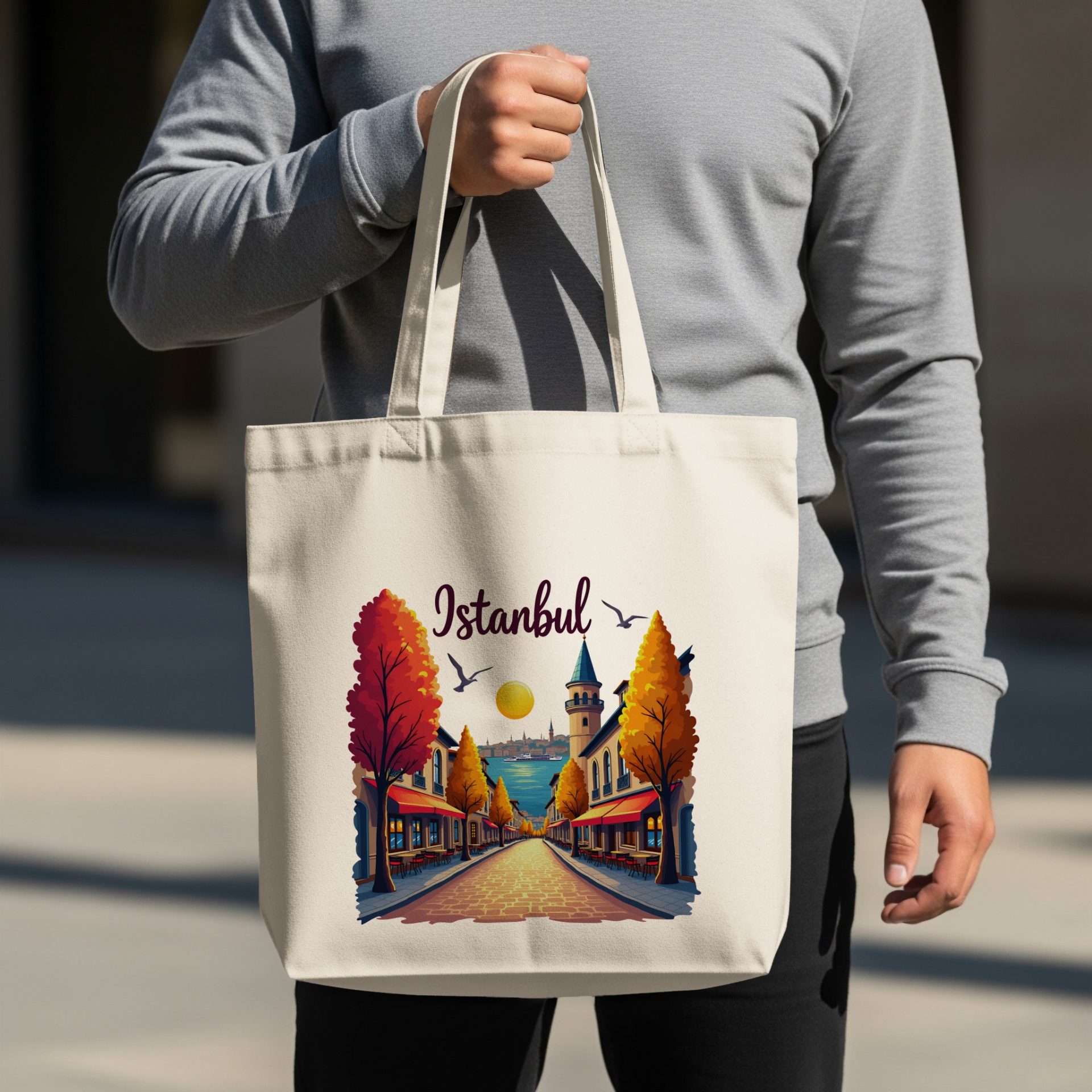 Showcase your love for Istanbul with this beautifully illustrated tote bag featuring a street scene during the autumn season. It is a perfect gift for Istanbul lovers.