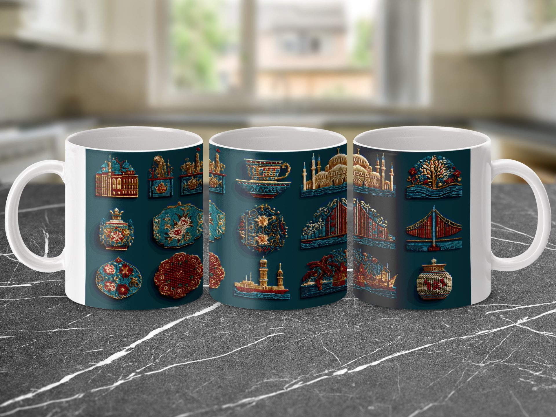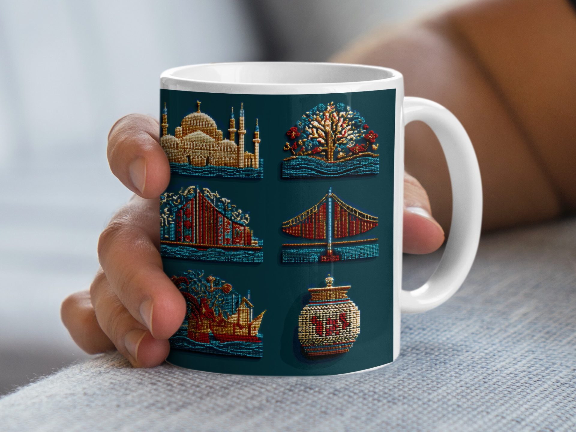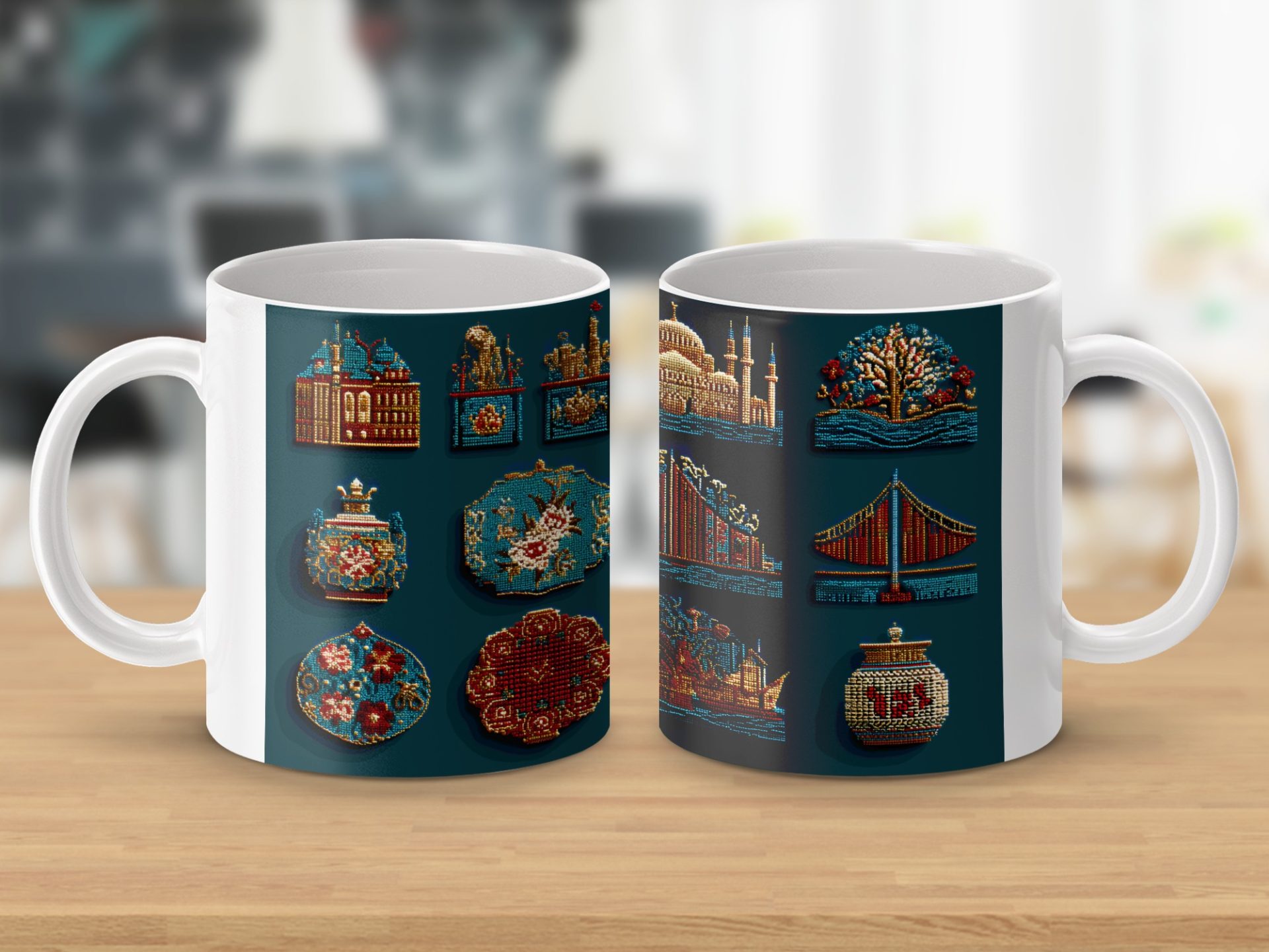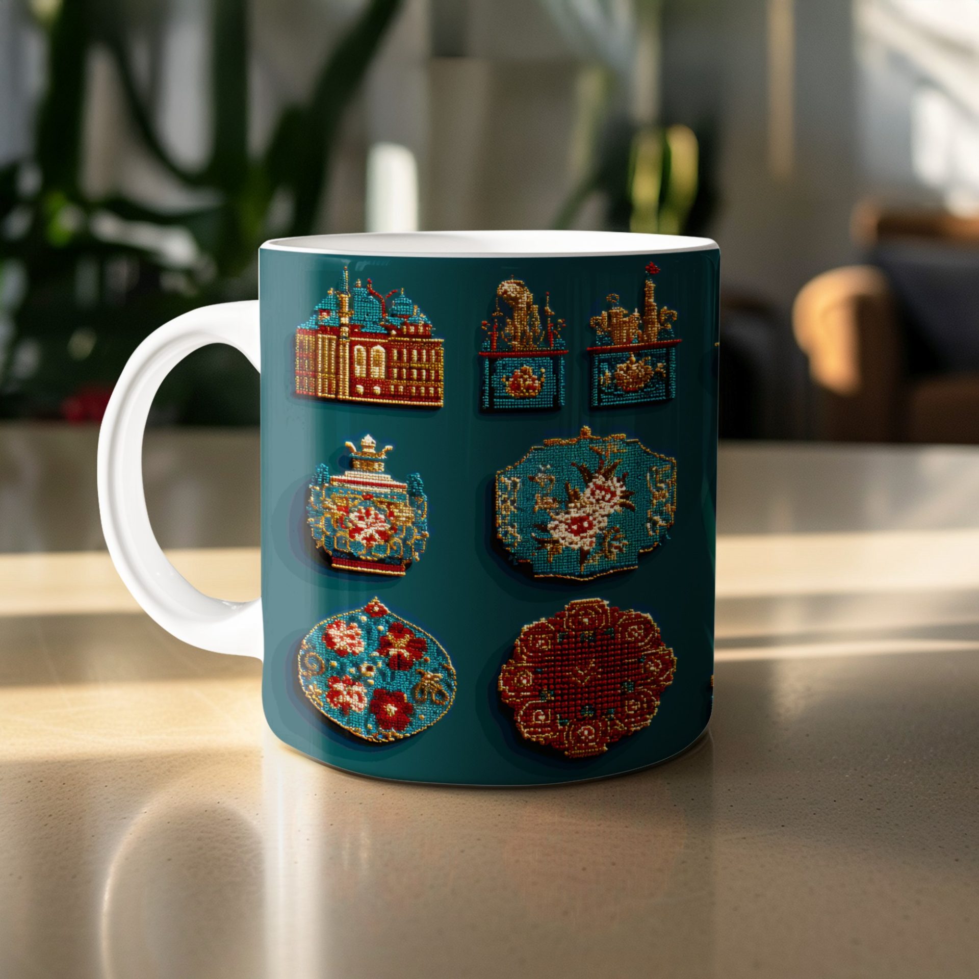 Discover unique mugs featuring vibrant beaded representations of iconic cultural landmarks and objects. Each mug captures the intricate details and artistry in a colorful design.