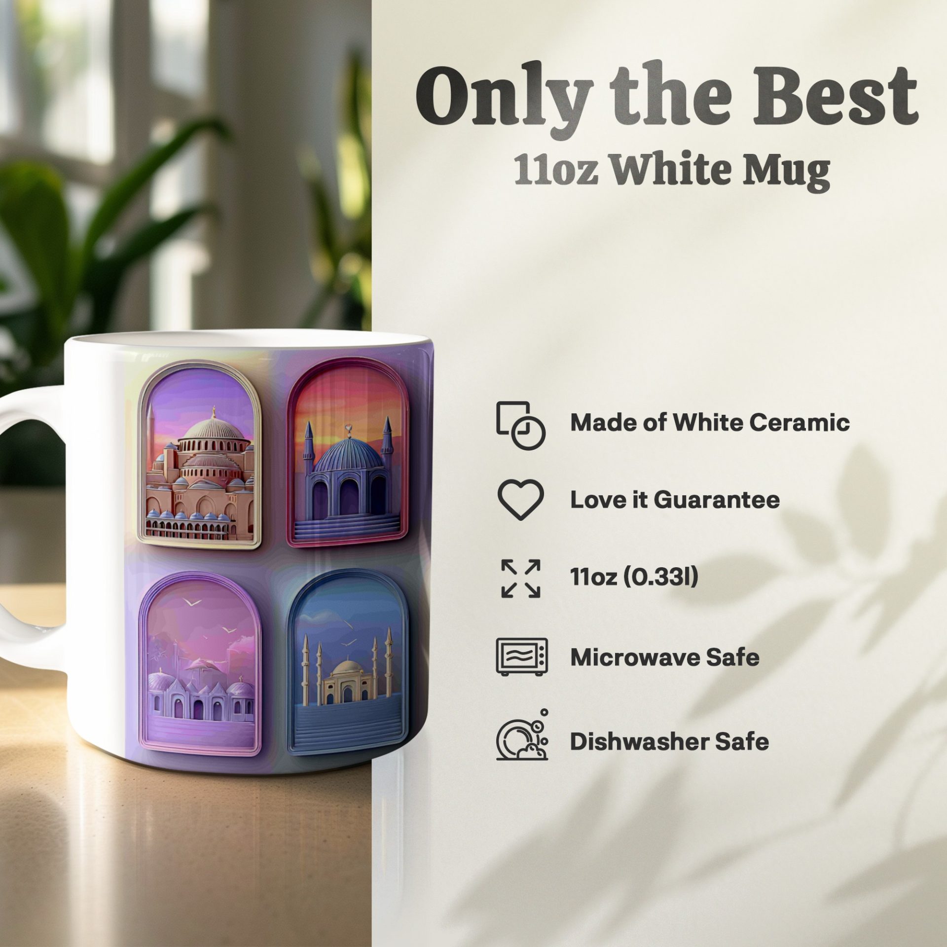 Explore the beauty world's religious landmarks with this visually striking mug. Each architectural design showcases unique elements. Enhance your coffee with culture!