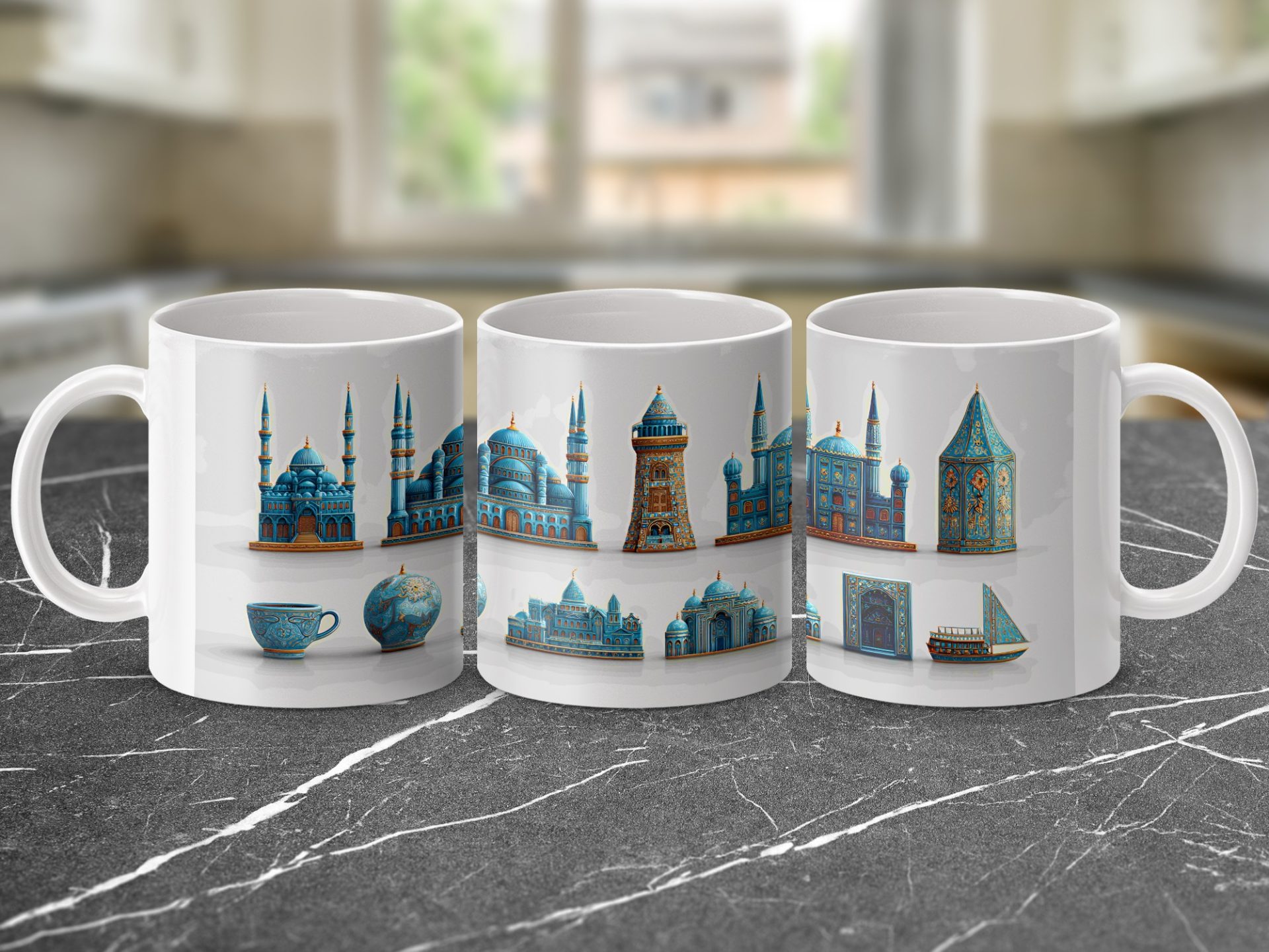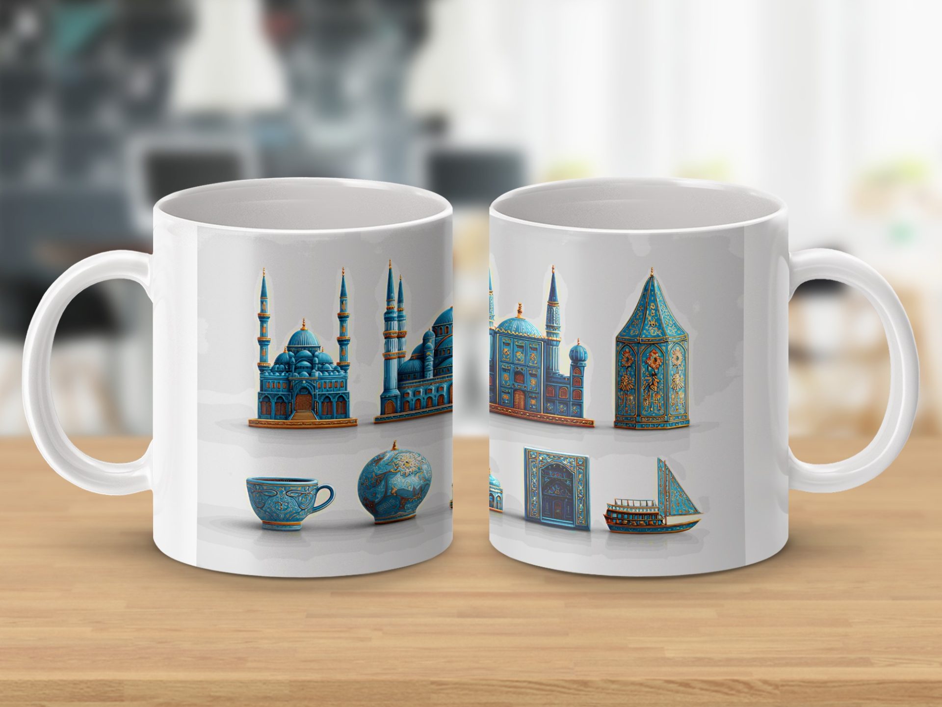 Elevate your coffee experience with our Islamic architecture inspired art mugs. This design showcases the beauty of mosques and other building structures. Get yours today!