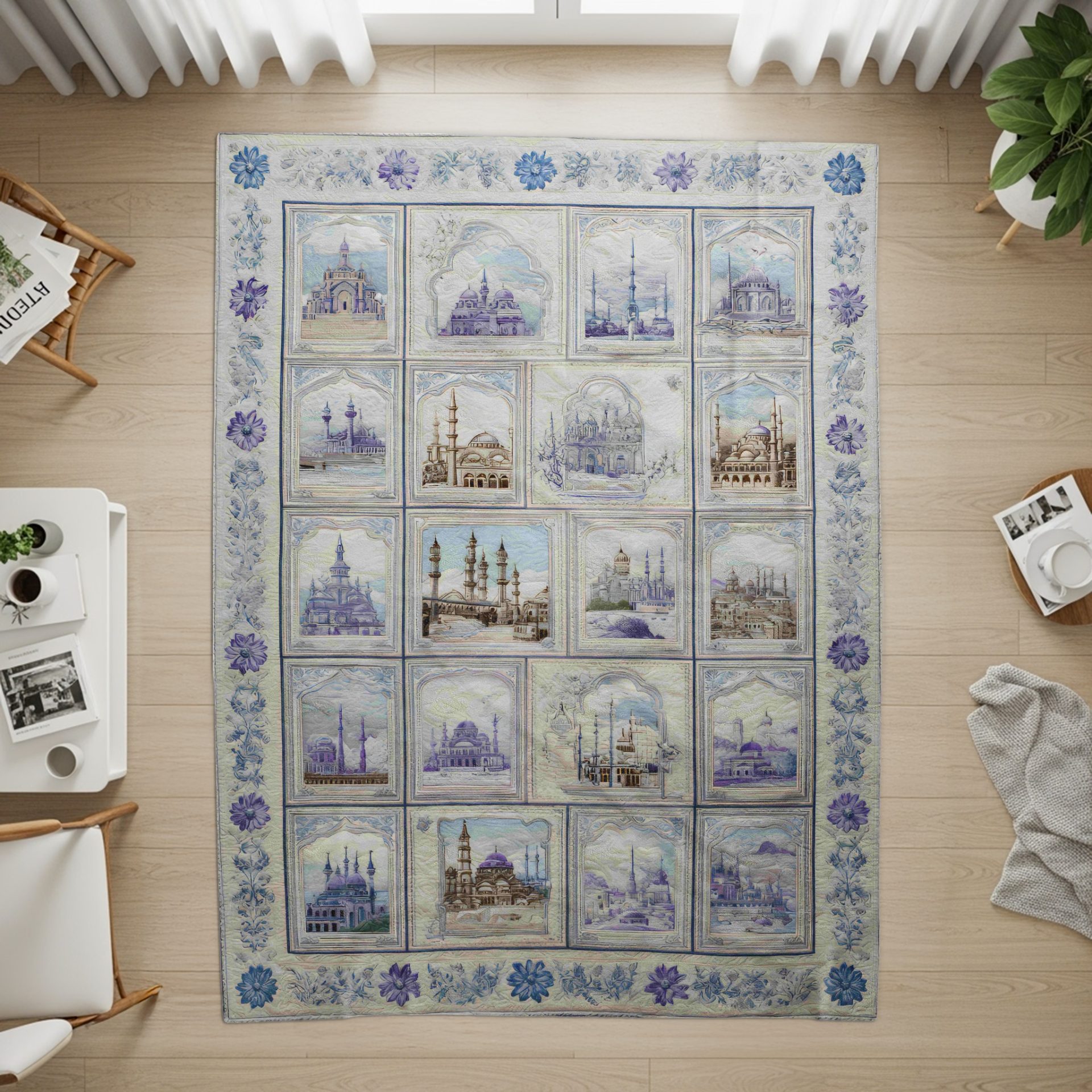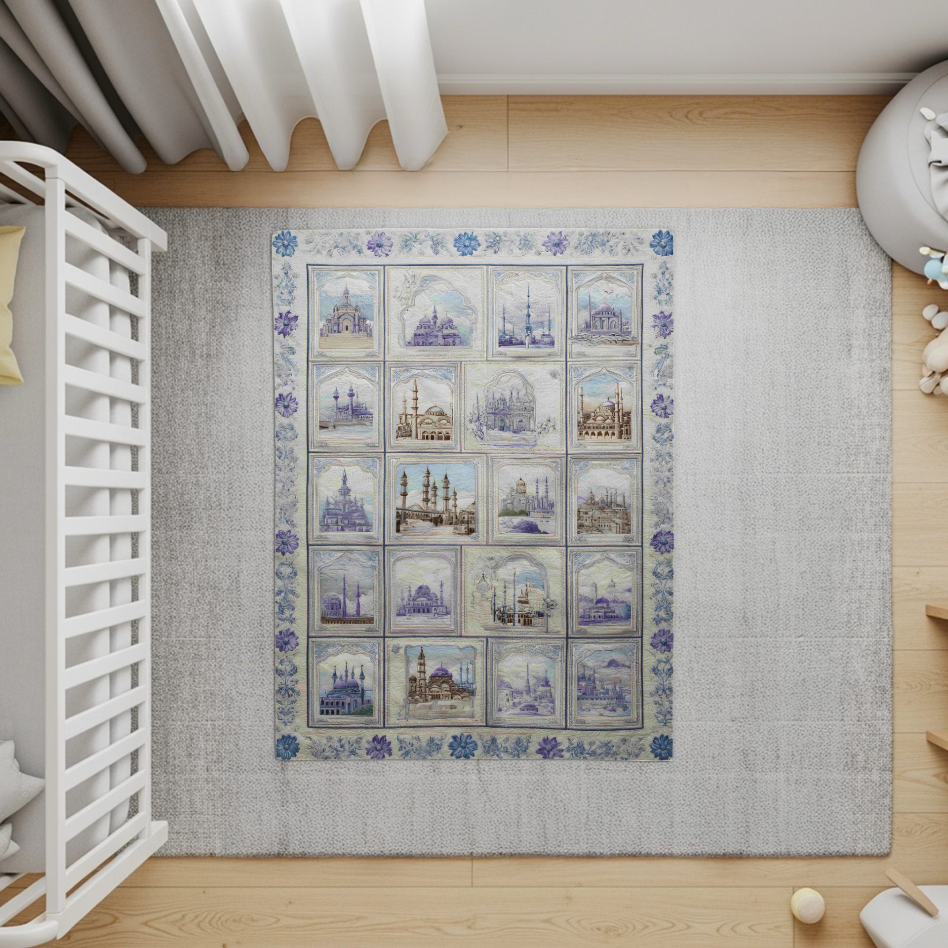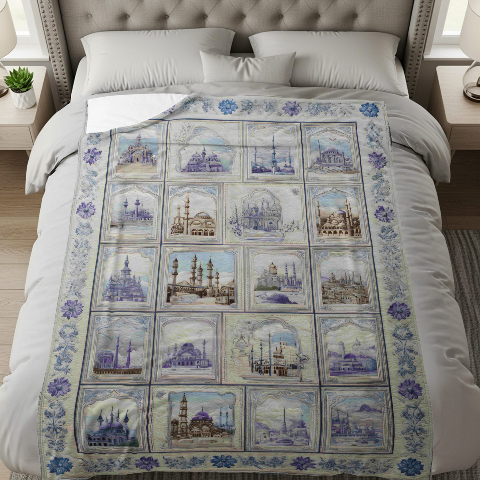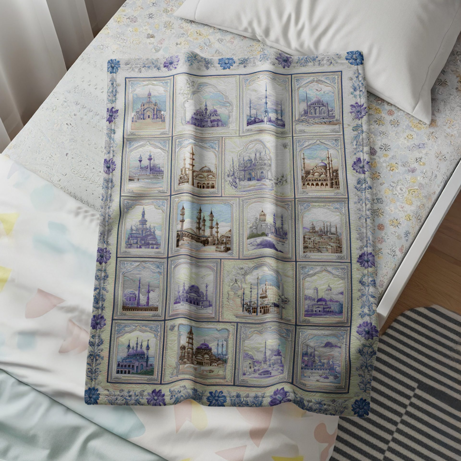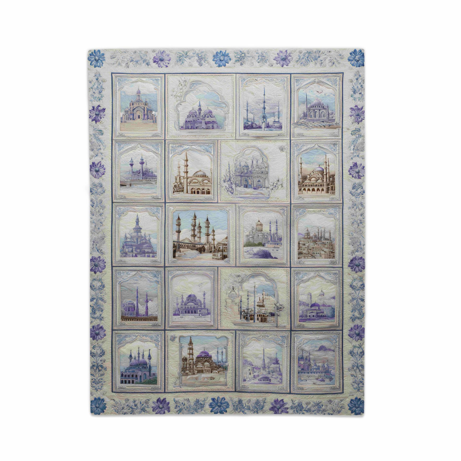 Add charm to your living space with this beautifully designed blanket. Featuring Islamic architecture in soft blue hues framed by intricate floral patterns. Perfect for any home style!