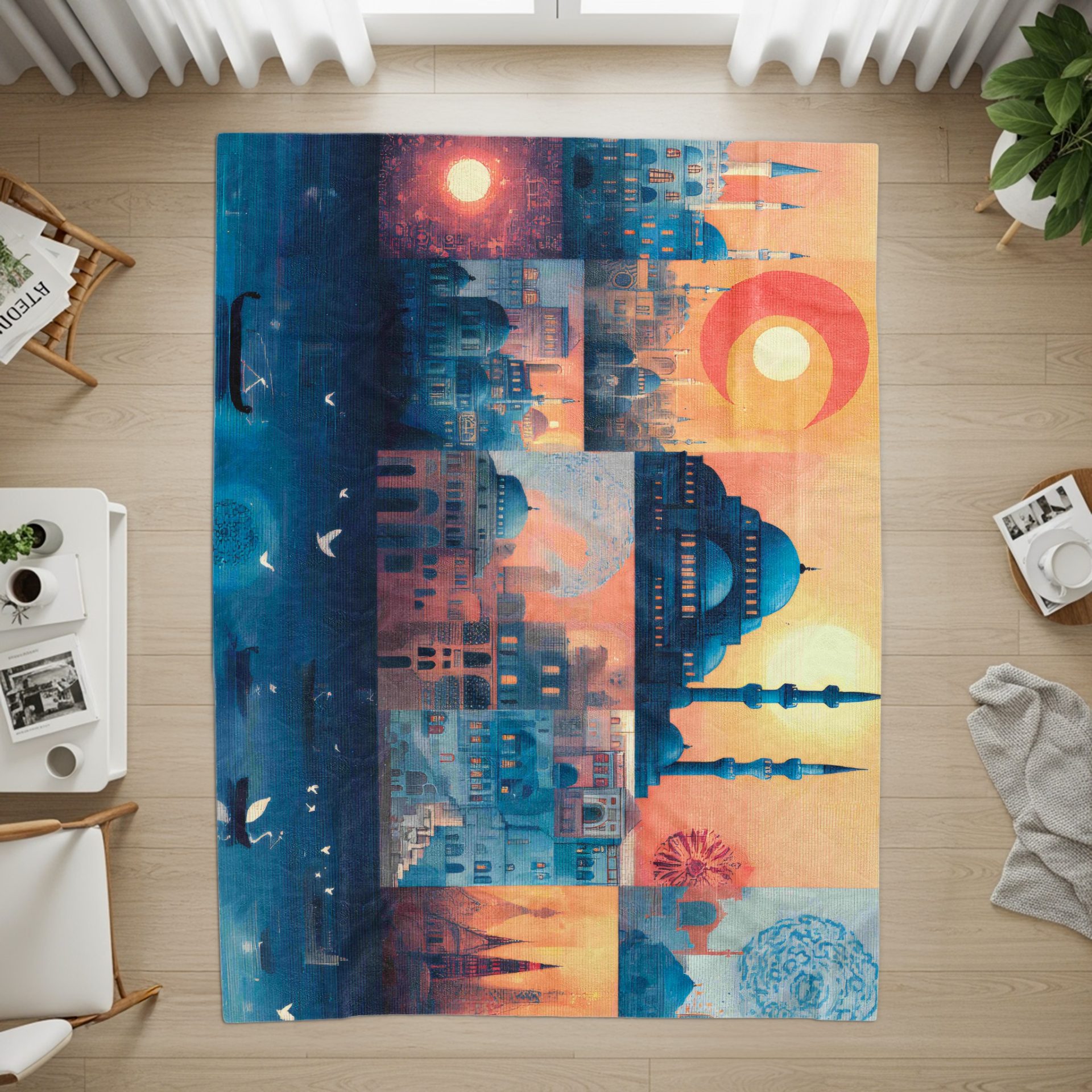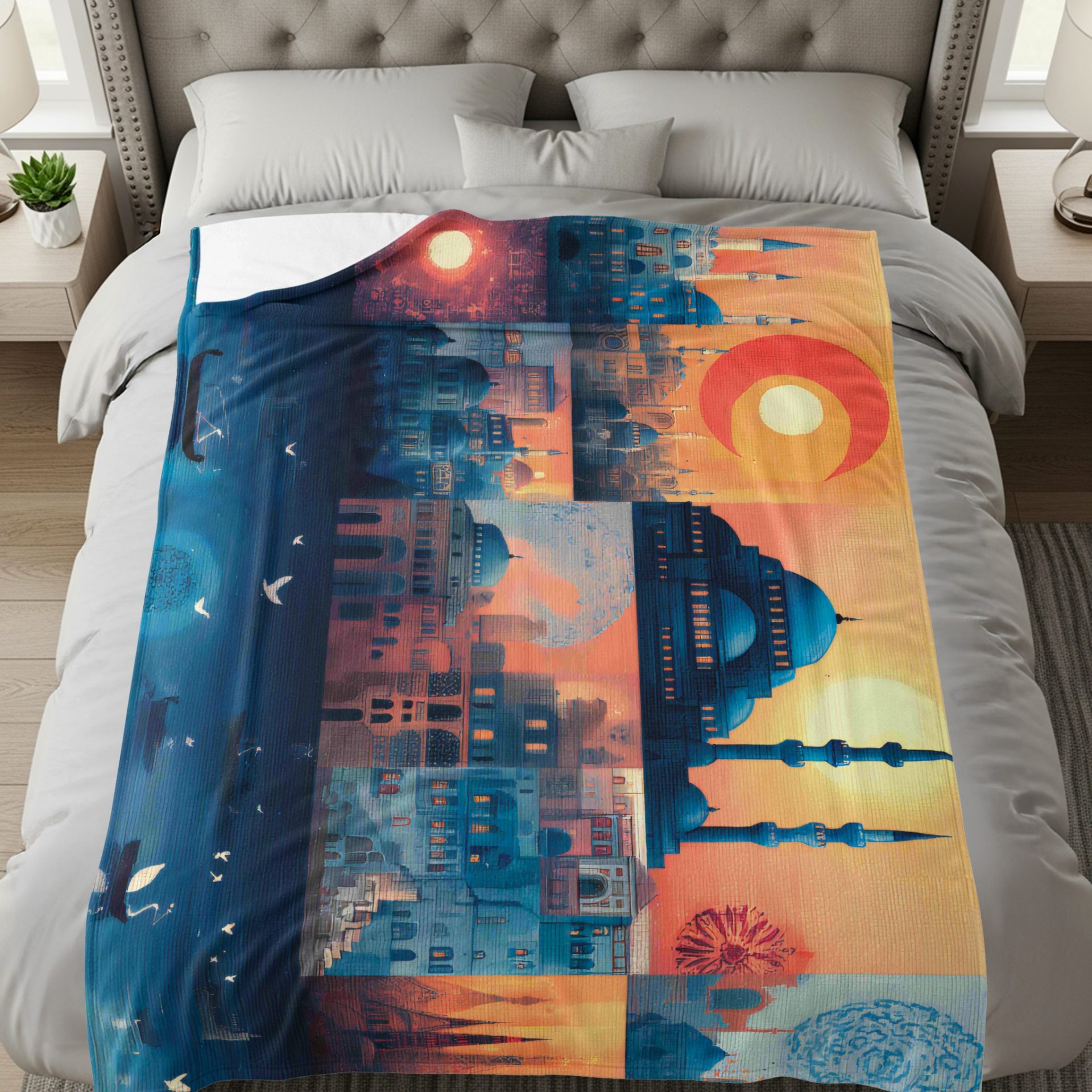Discover our Istanbul architecture design blanket. Immerse yourself in cityscape with sun and moon birds. A unique blend of urban art for your home comfort needs today.