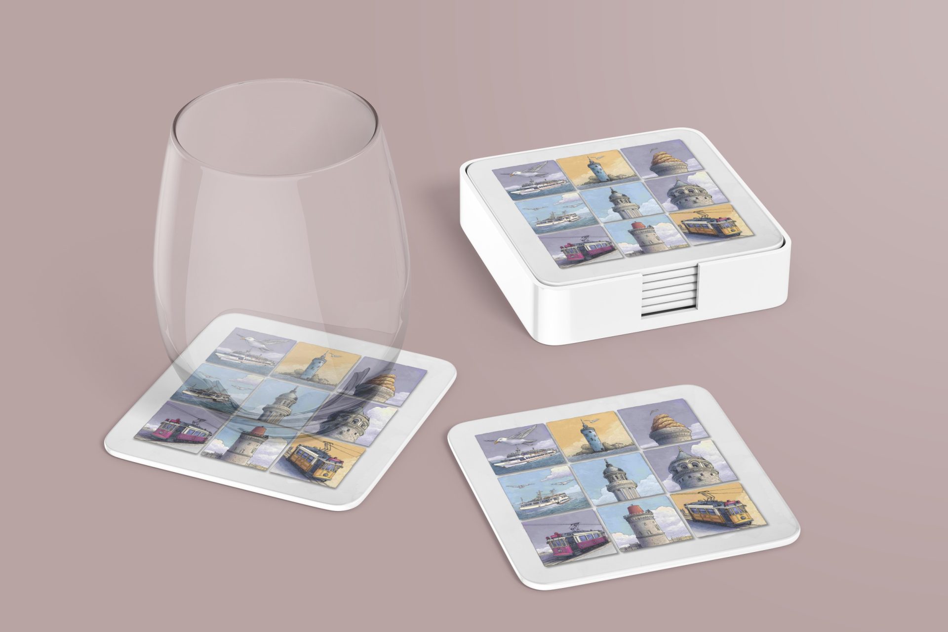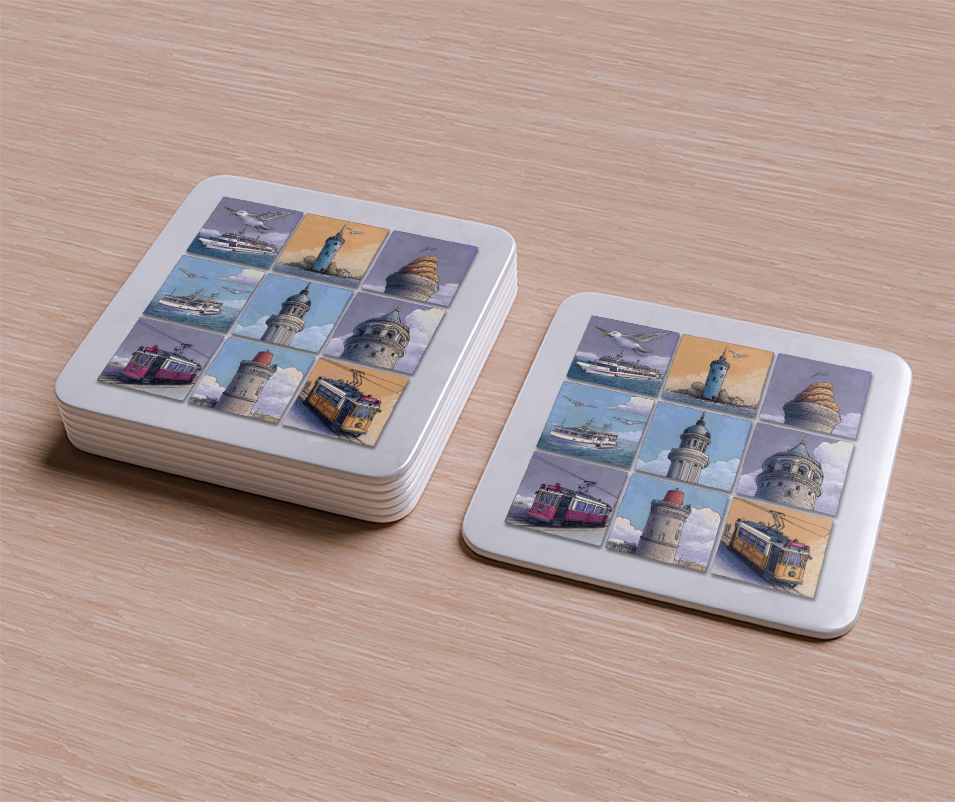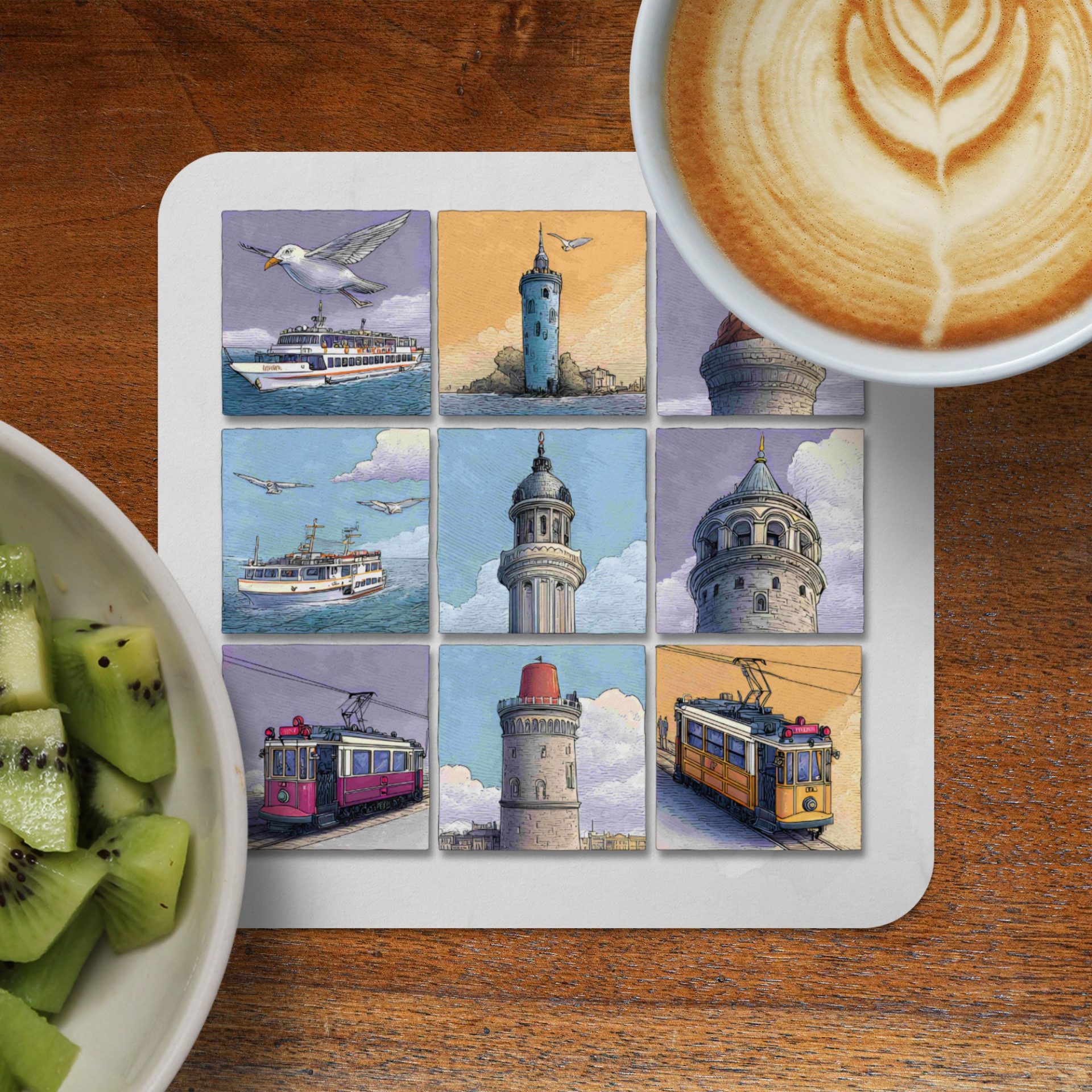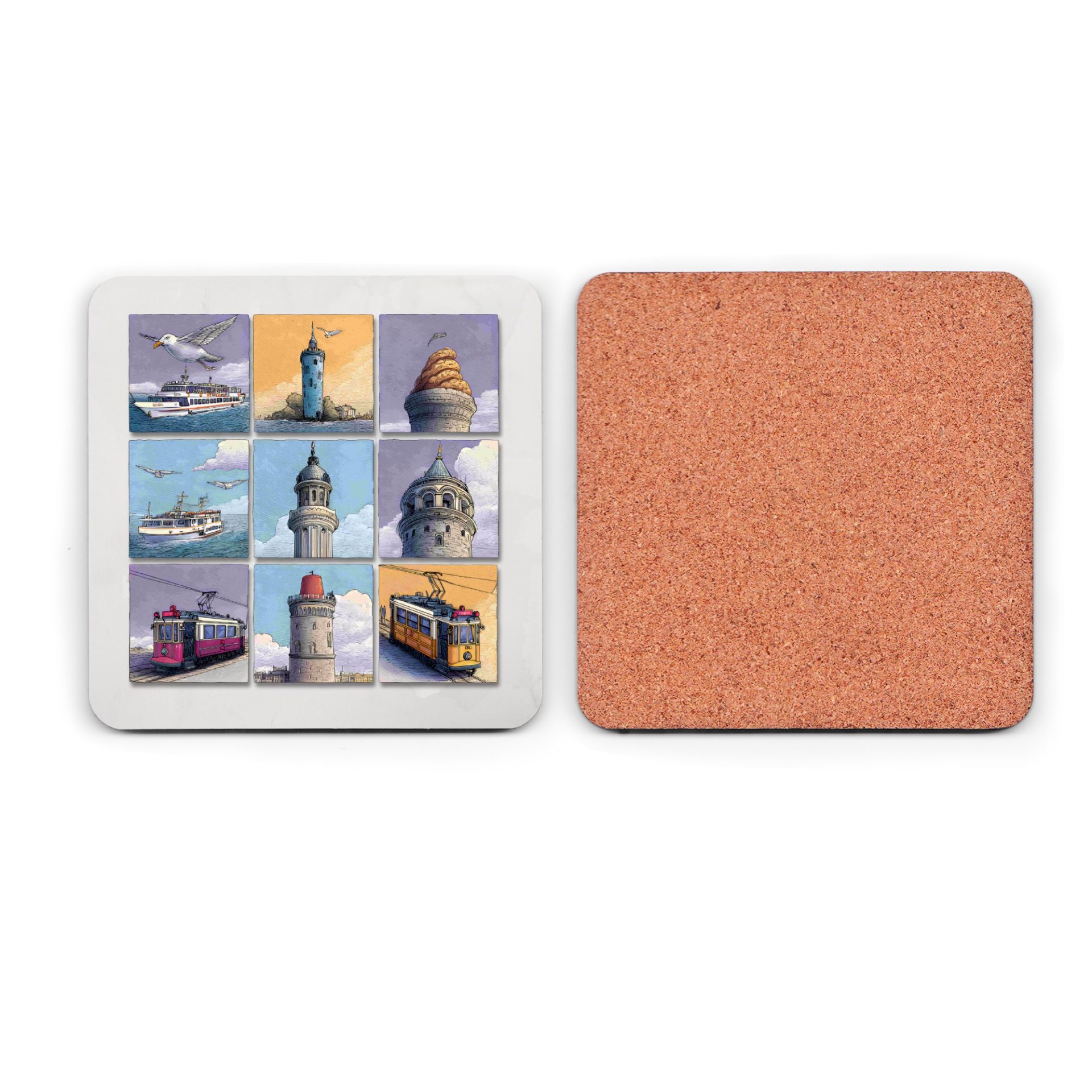 Discover Istanbul through art with these unique coasters. Featuring iconic landmarks city views and local transportation these will protect surfaces with style.