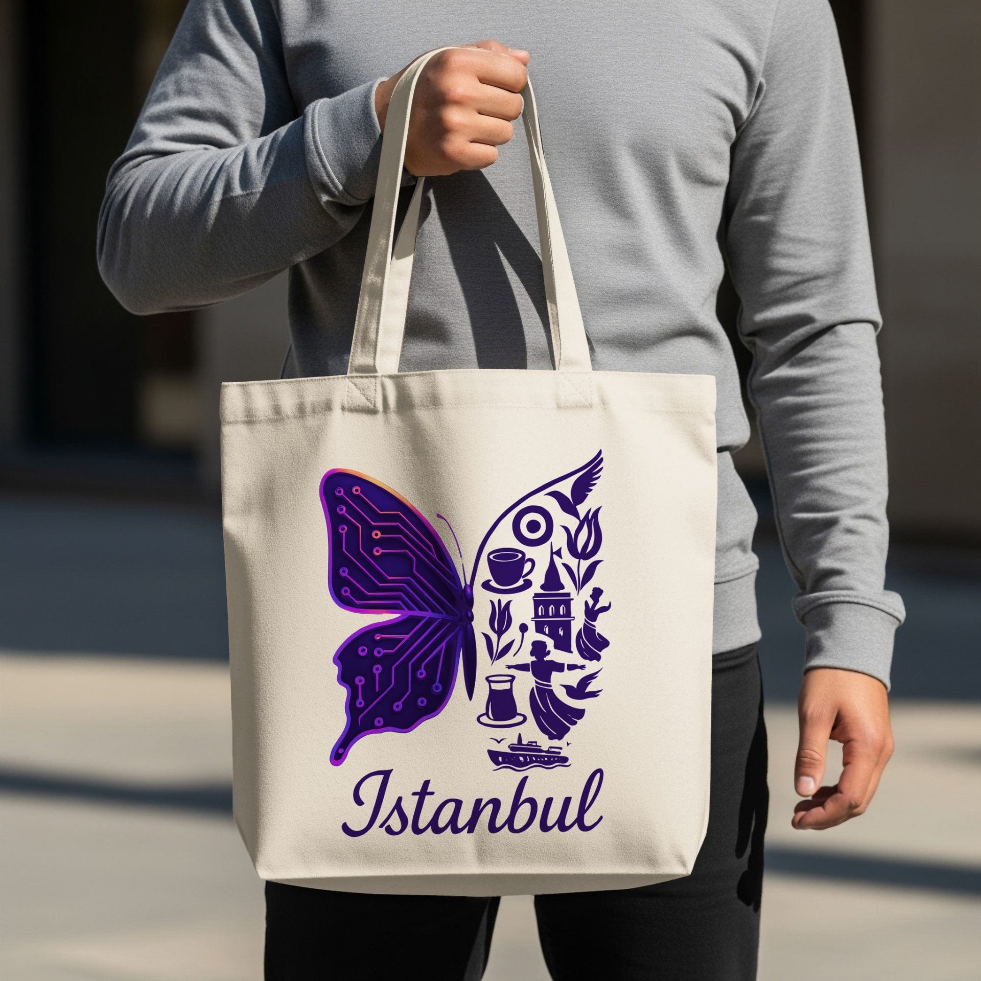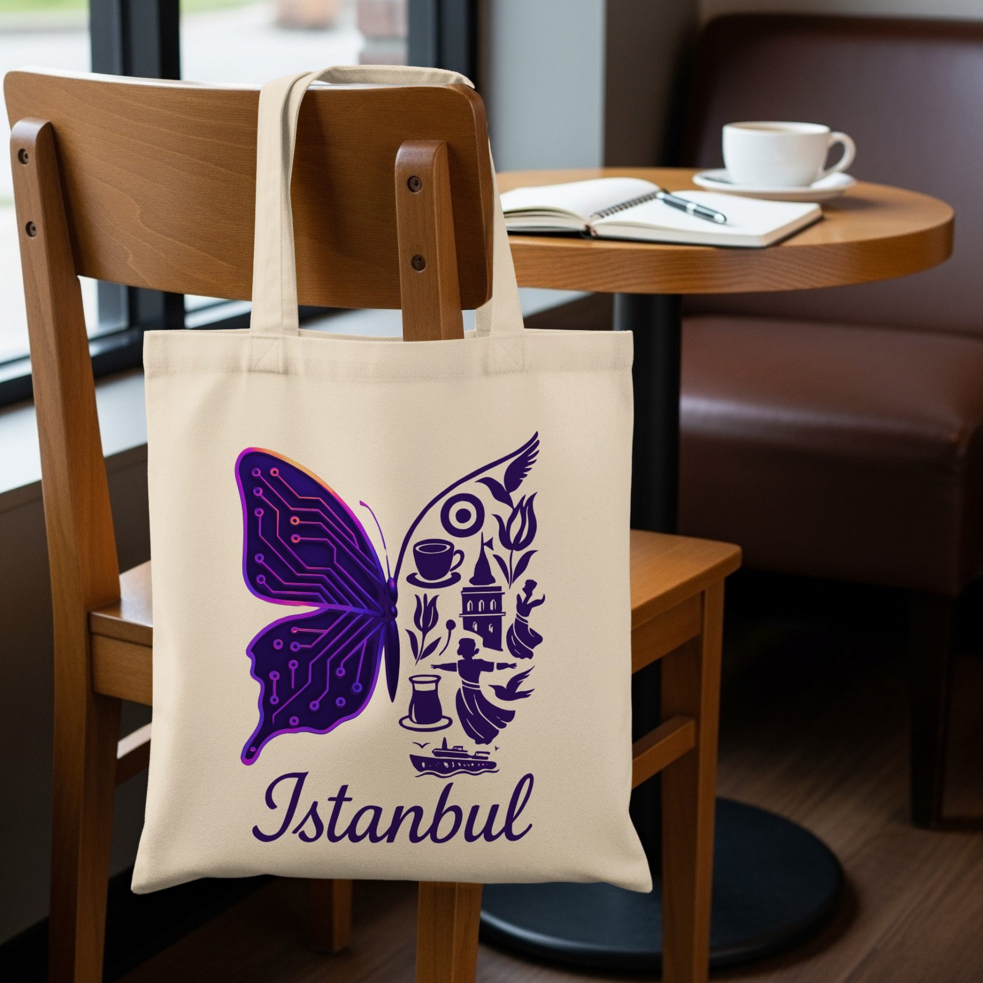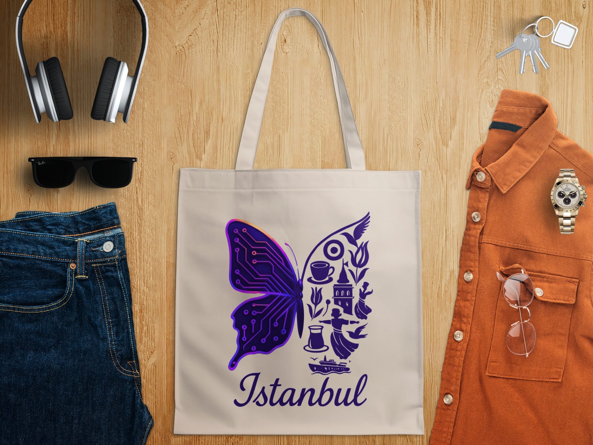 Explore Istanbul with our stunning butterfly design tote bag featuring iconic symbols on one side and circuit pattern on other wing! Show your love for Istanbul.