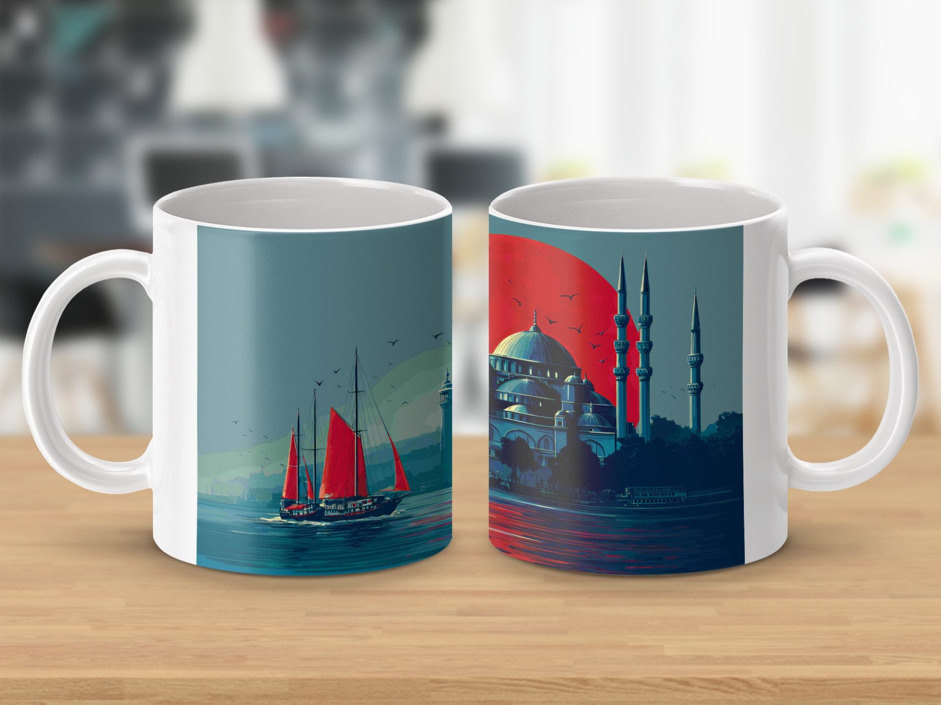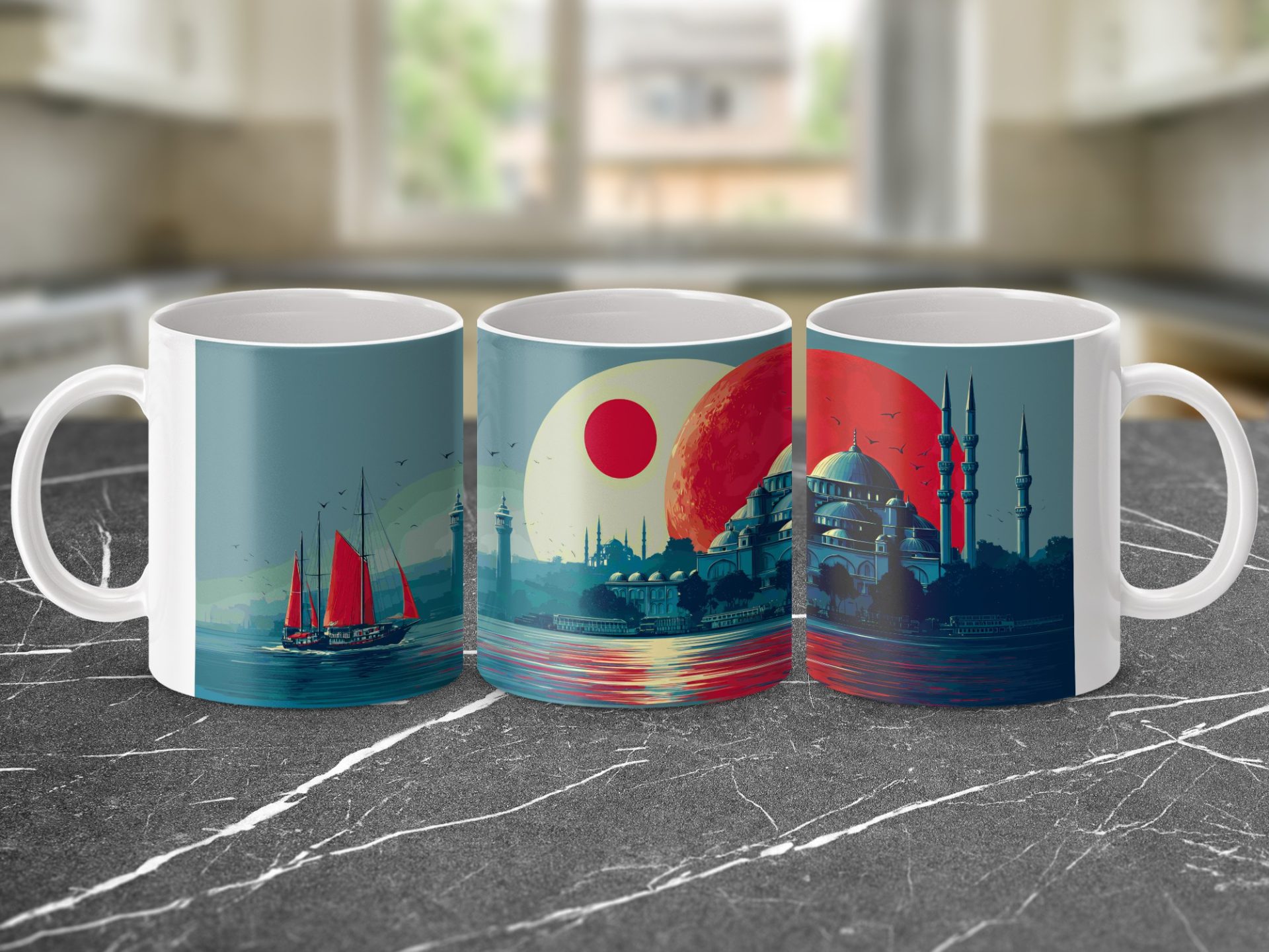 Enjoy this beautiful Istanbul city art featuring the Red Moon and a sailboat. This mug brings a scenic view to your mornings. Capture the beauty of Istanbul with every sip.