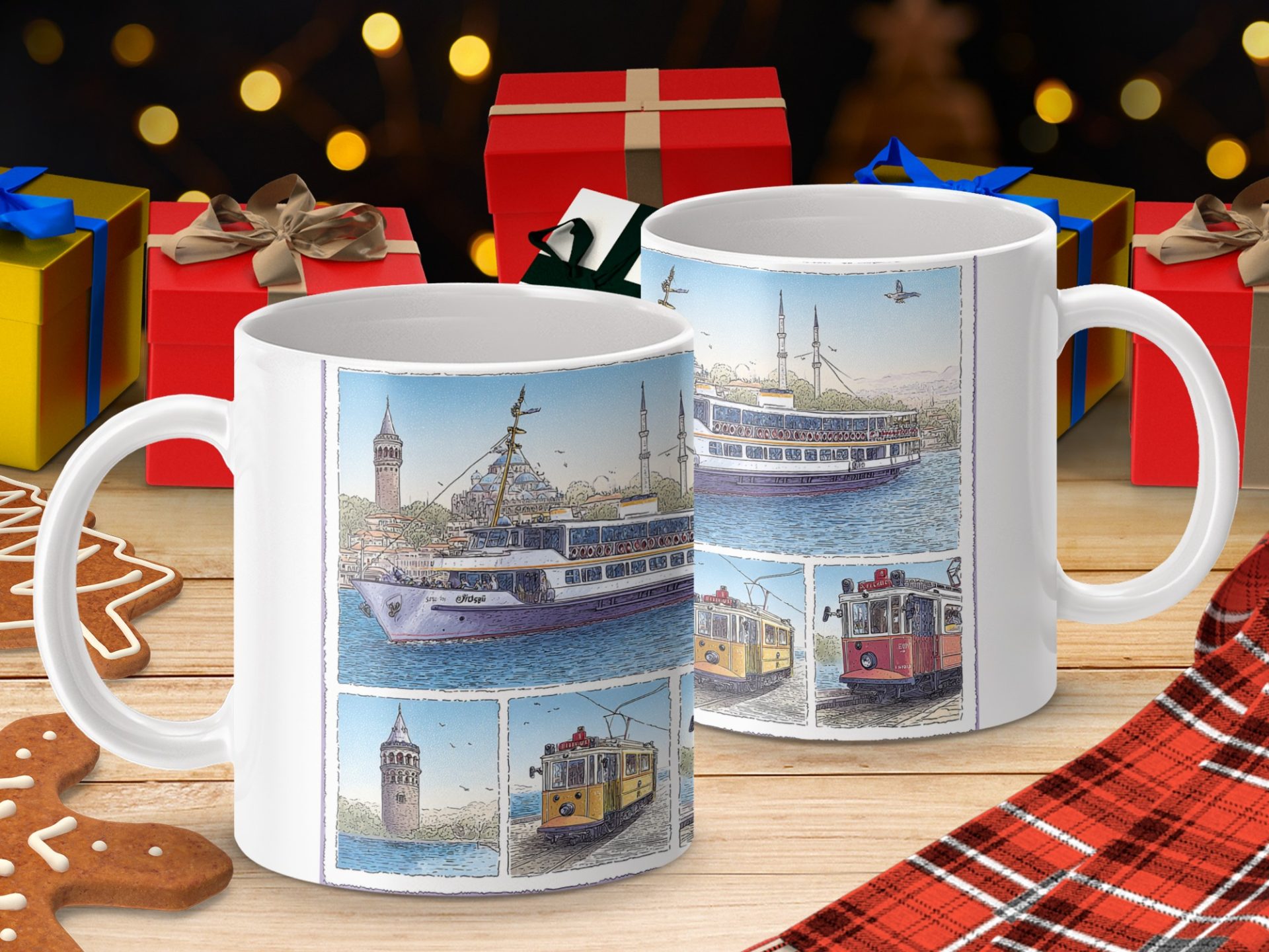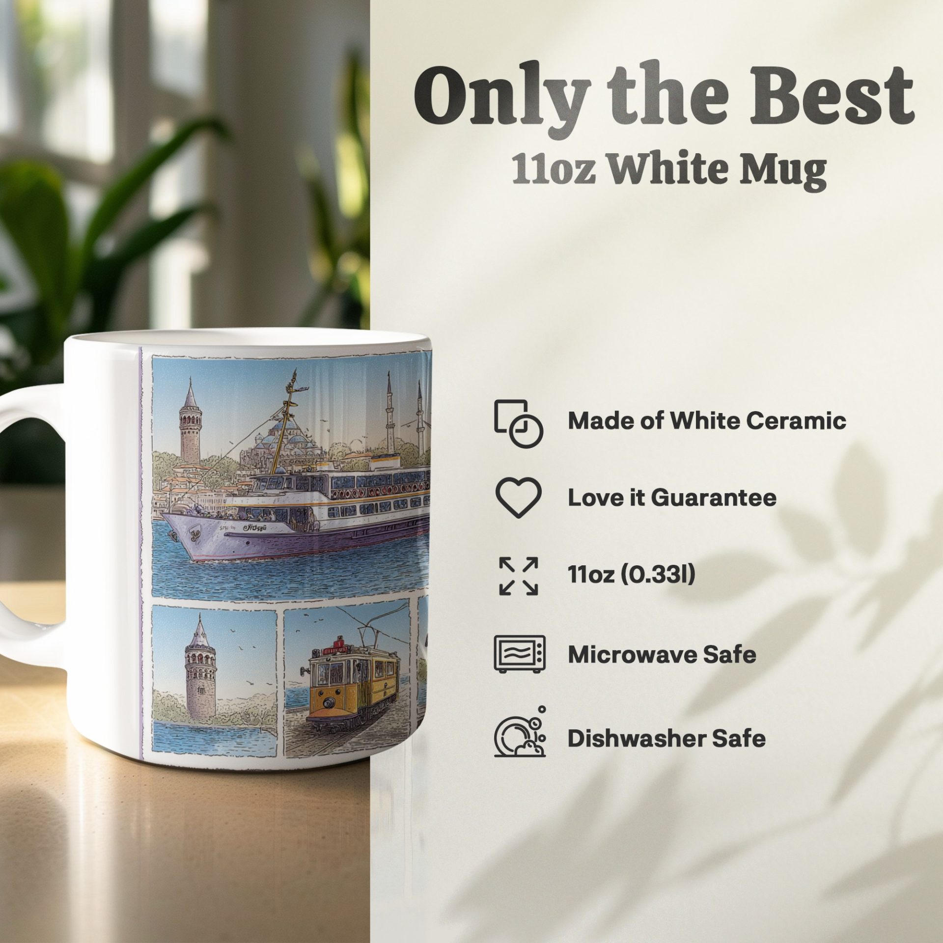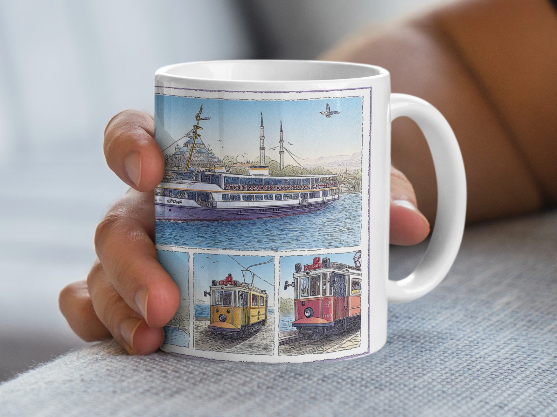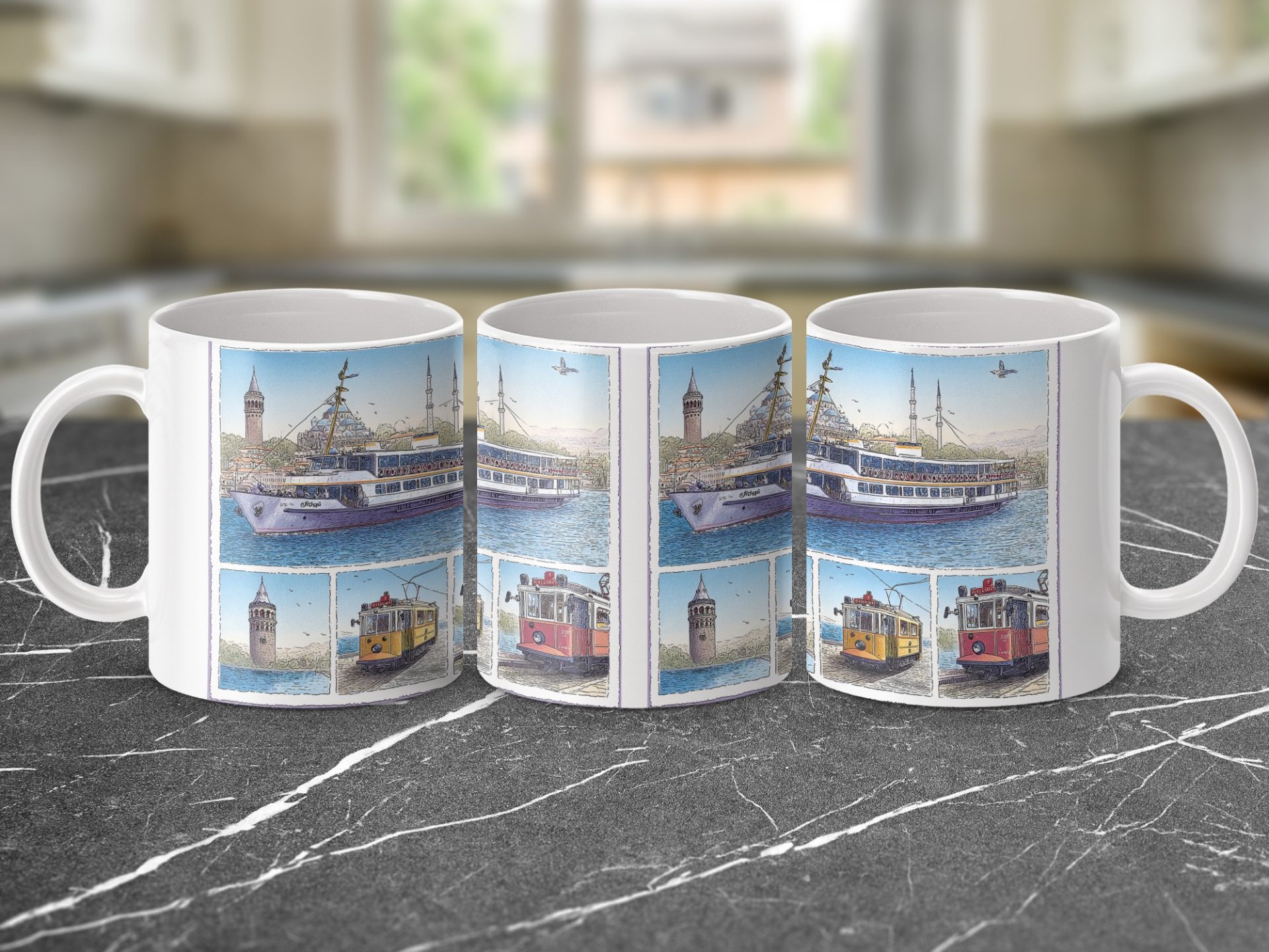 Capture the beauty of Istanbul with this scenic mug featuring a ferry on the water and classic trams. Perfect for travel enthusiasts and anyone who loves cityscapes. Enjoy your favorite beverage!