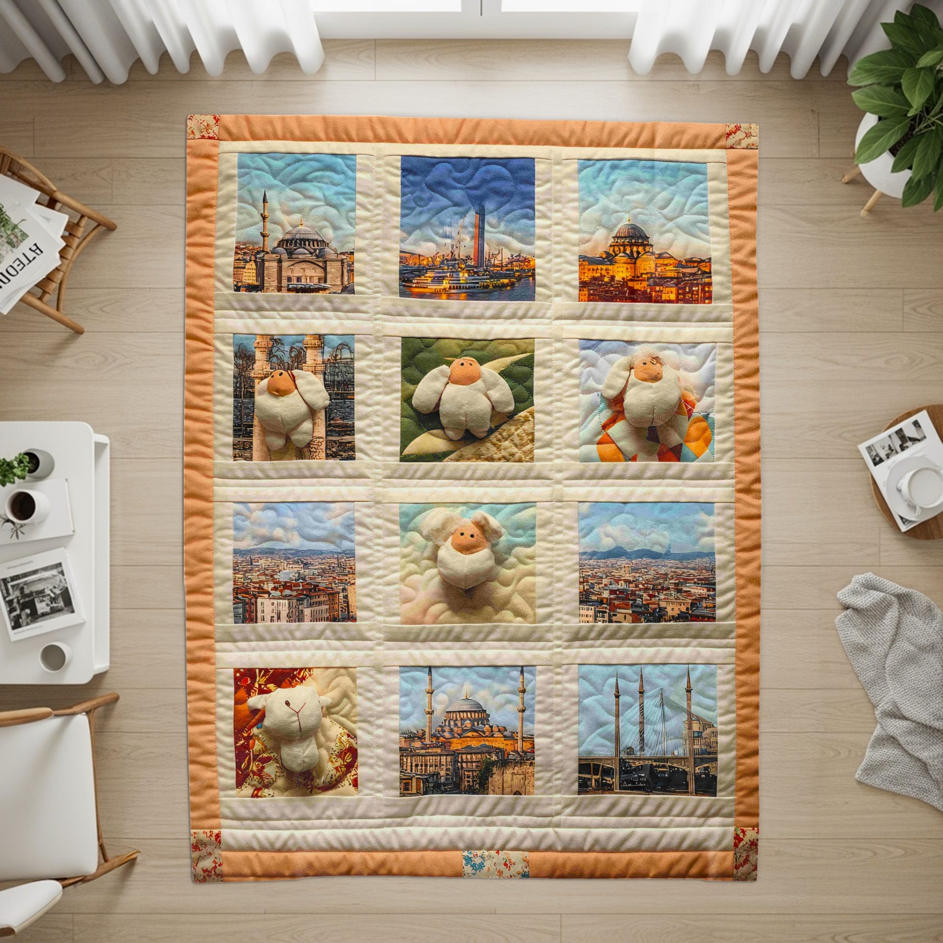 Enjoy this artistic collage blanket featuring Istanbul landmarks alongside whimsical sheep designs. It's a unique addition to any home adding warmth style and character.
