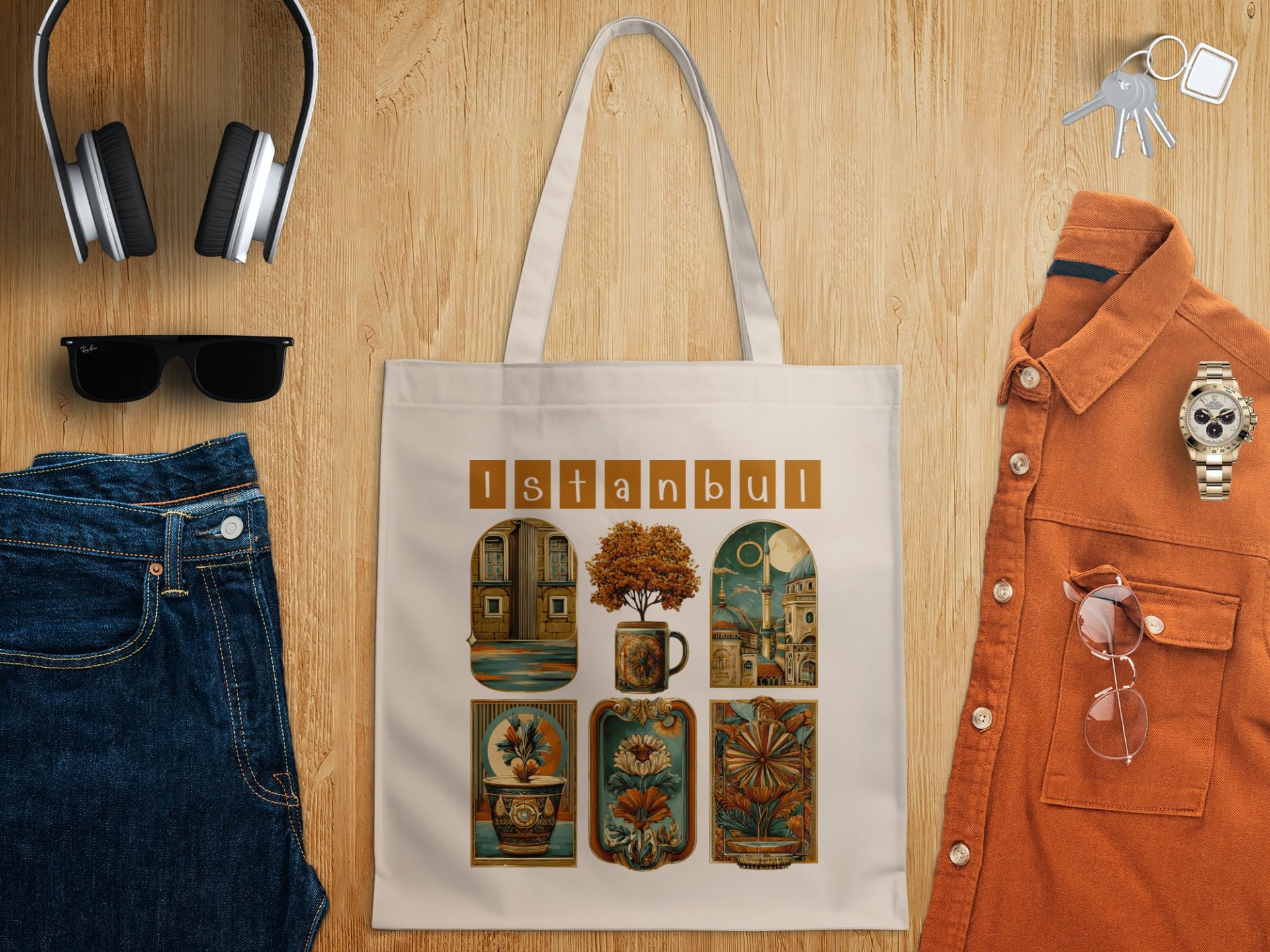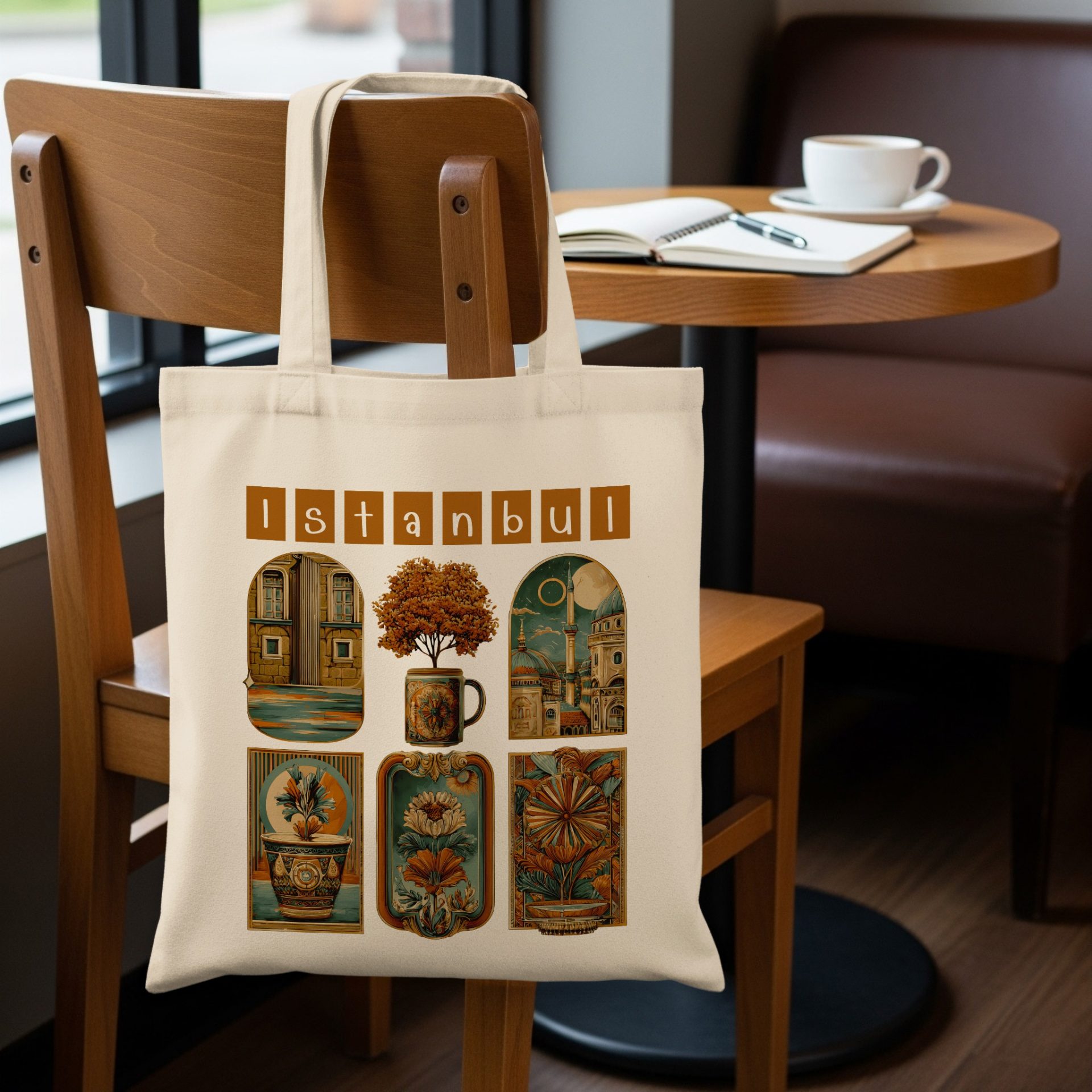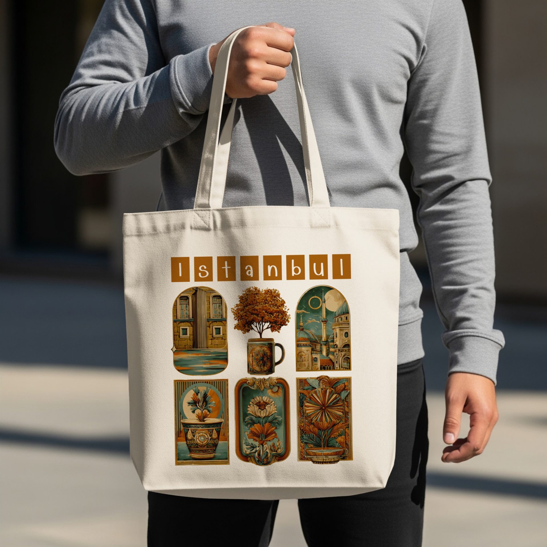 Explore the fusion of Istanbul's architectural charm and floral elegance. This unique design marries cityscapes with delicate flower artwork for a stylish and artistic accessory.