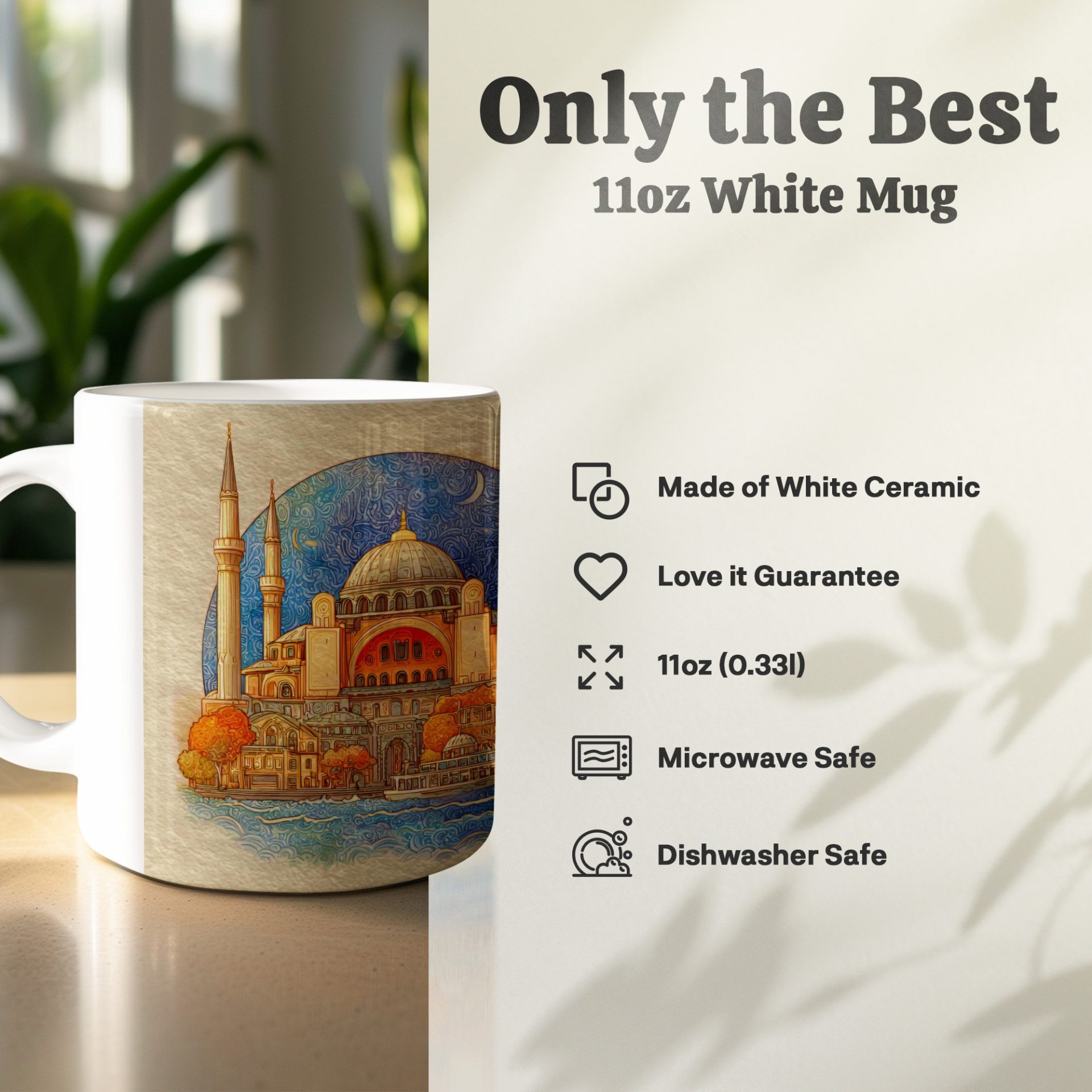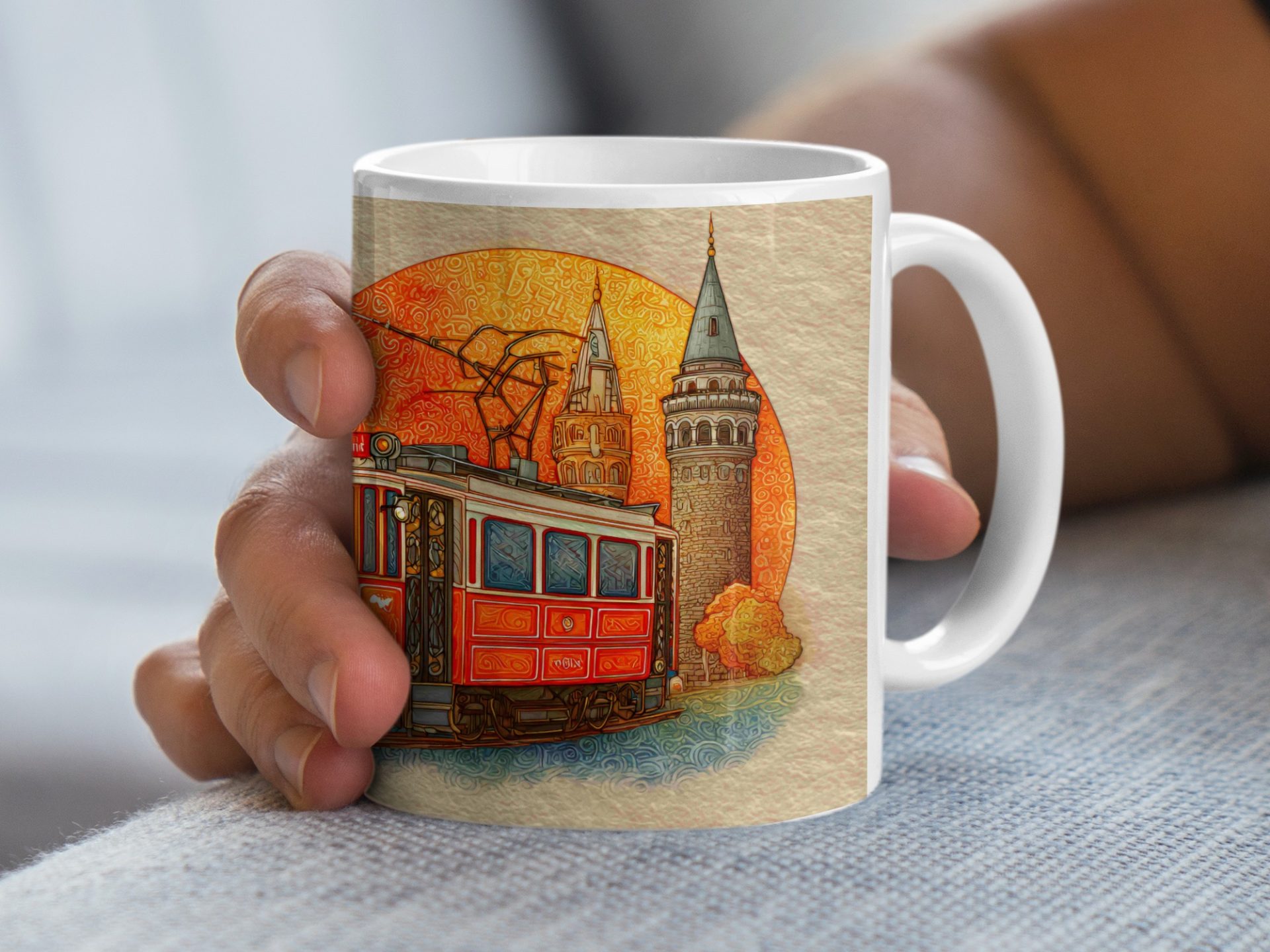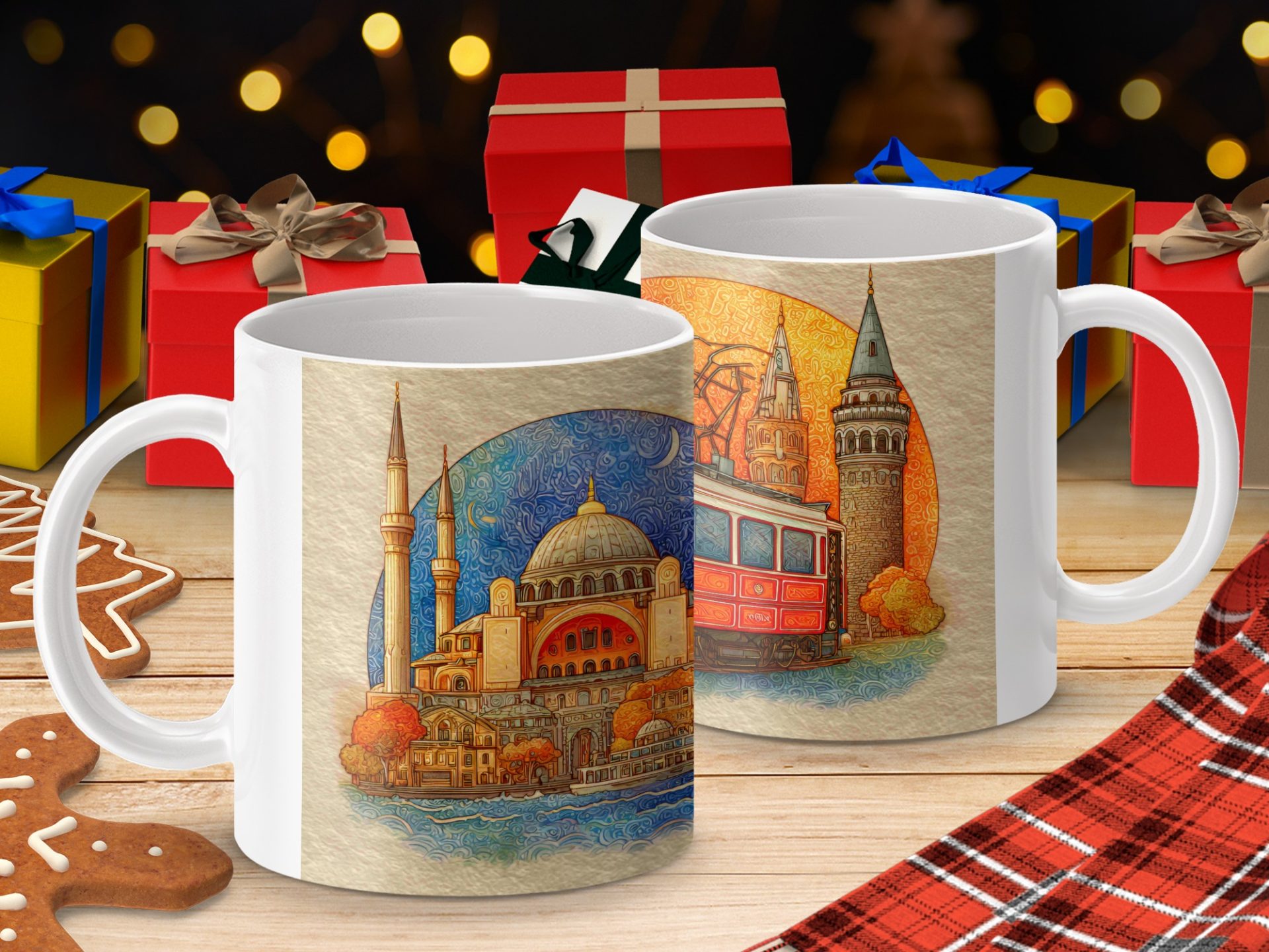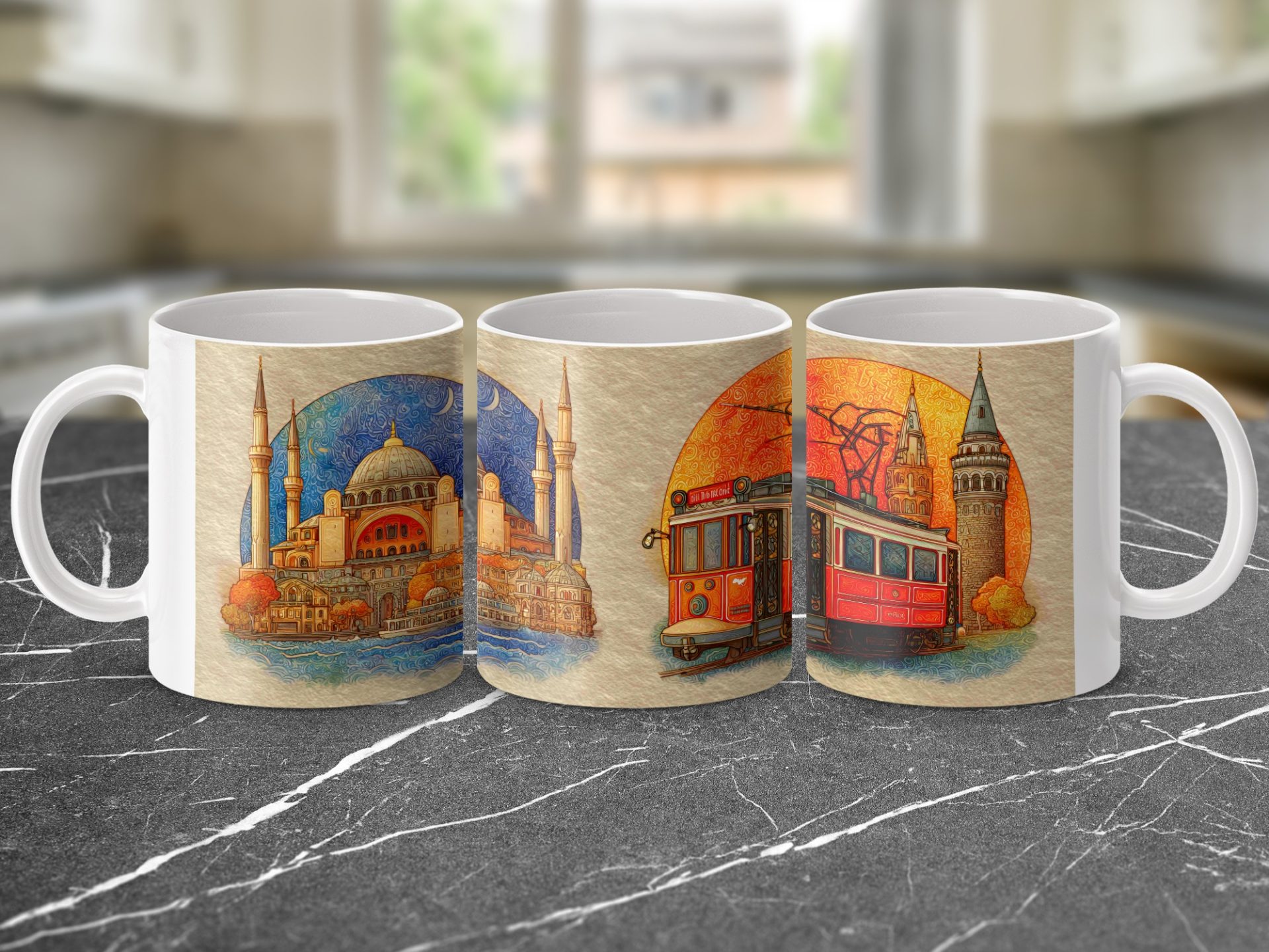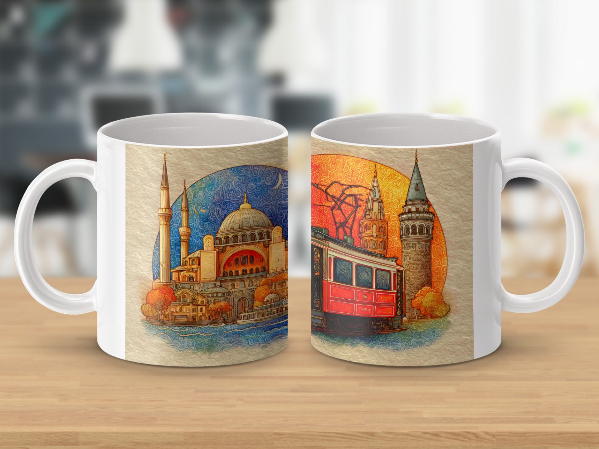 Get your hands on this unique Mugs featuring iconic Istanbul landmarks. This vibrant artwork depicts the Hagia Sophia and a classic Istanbul tram bringing the city's charm to your everyday.
