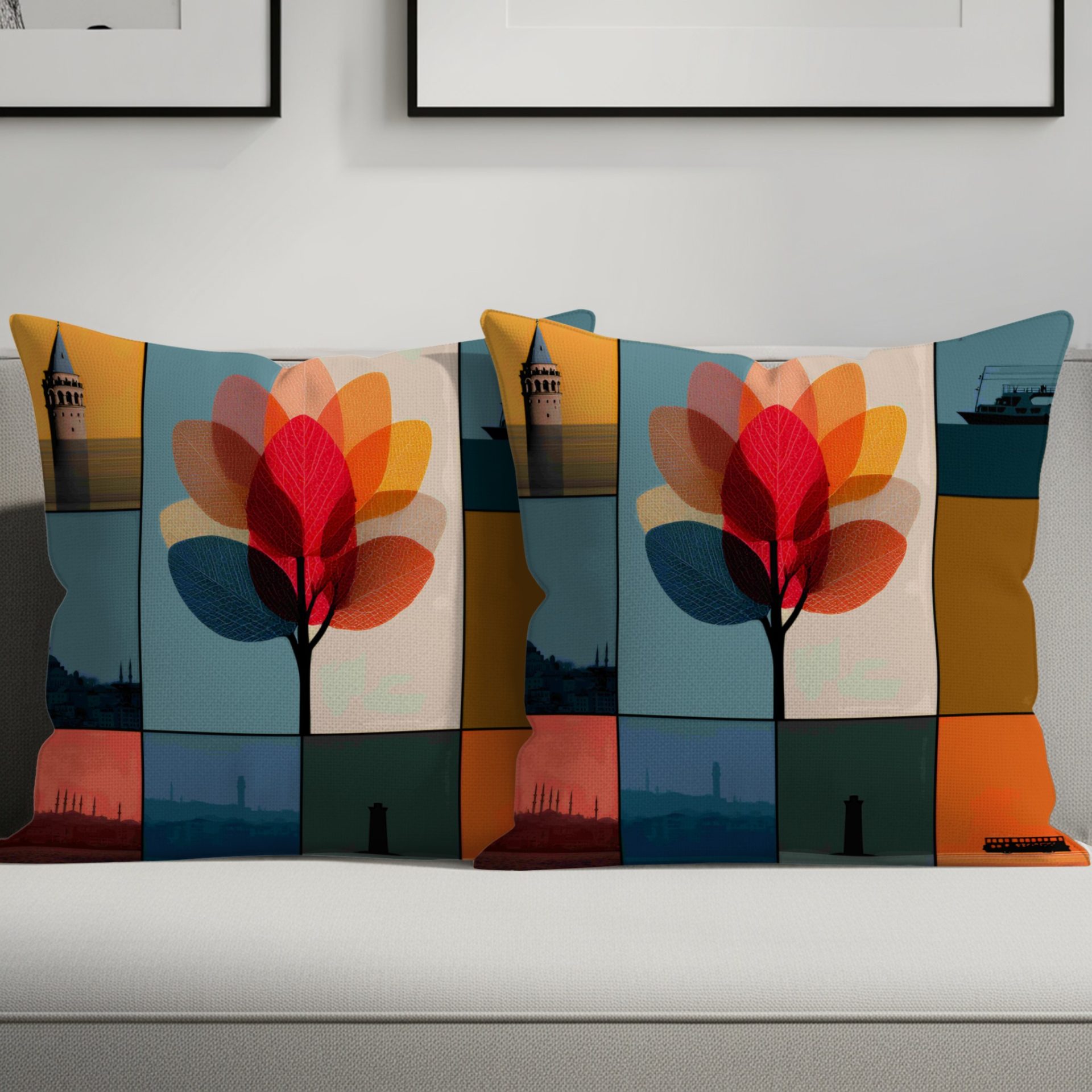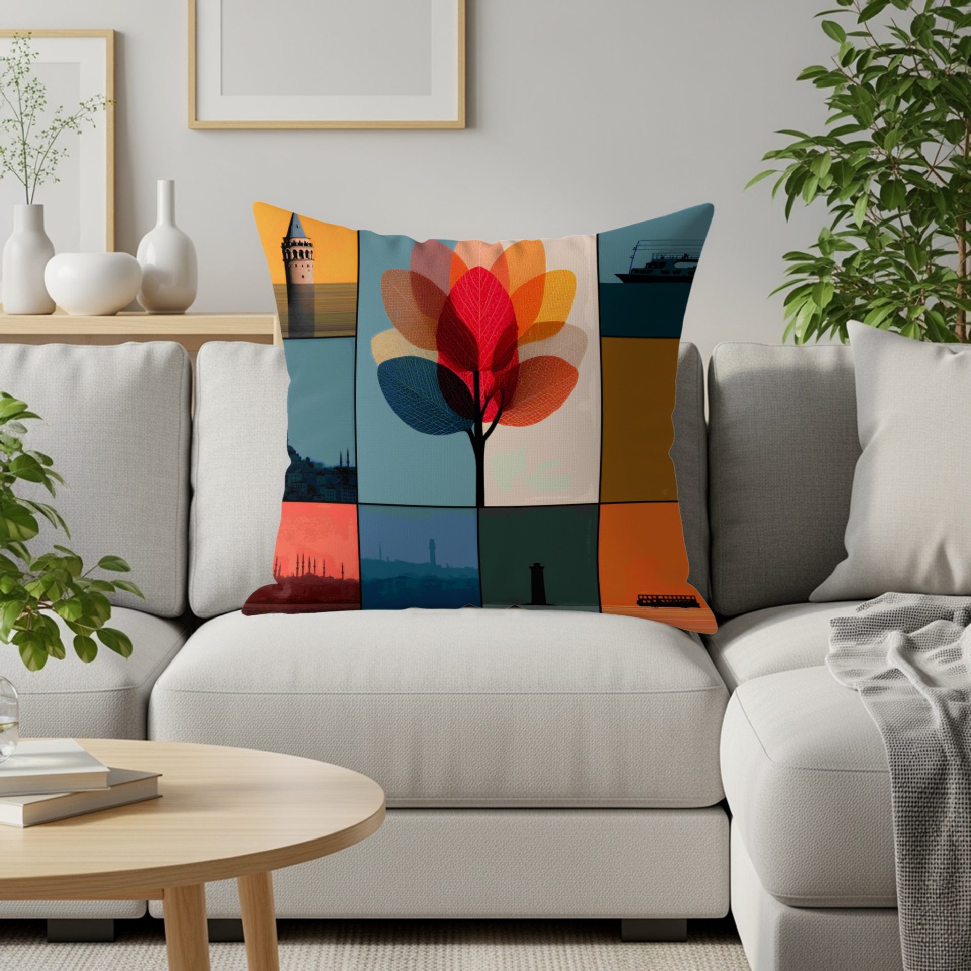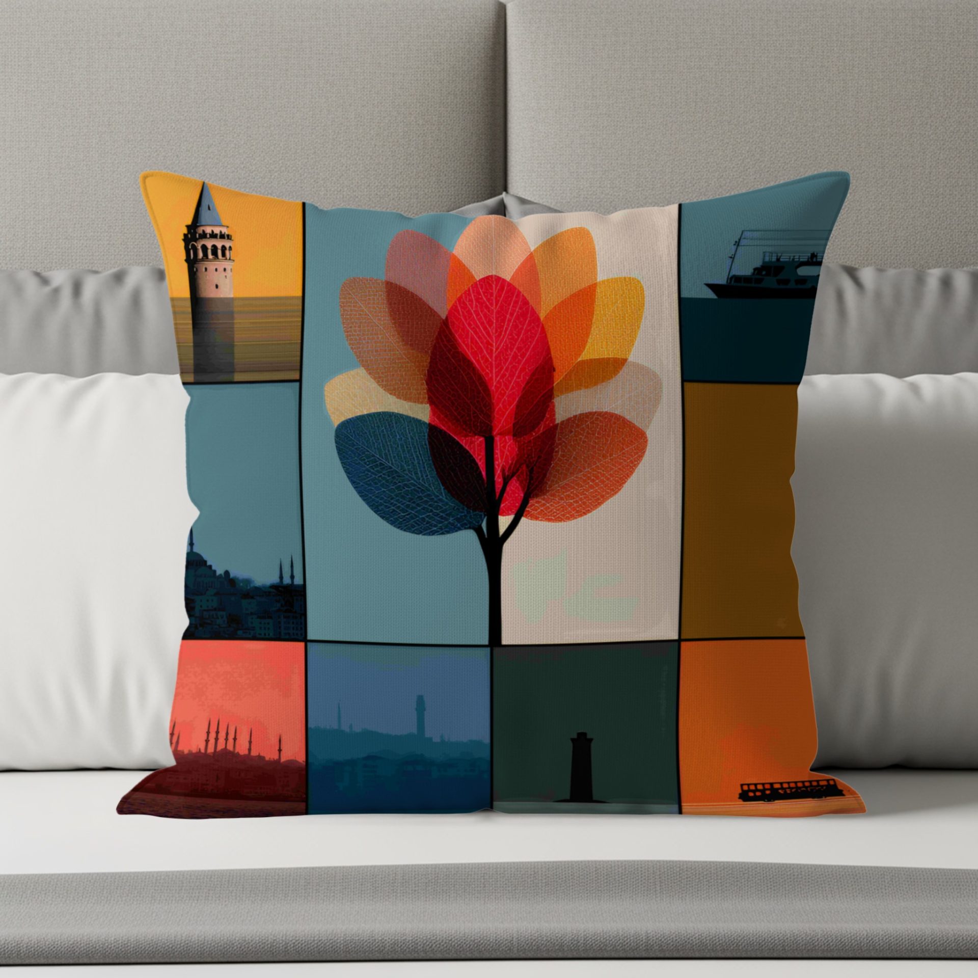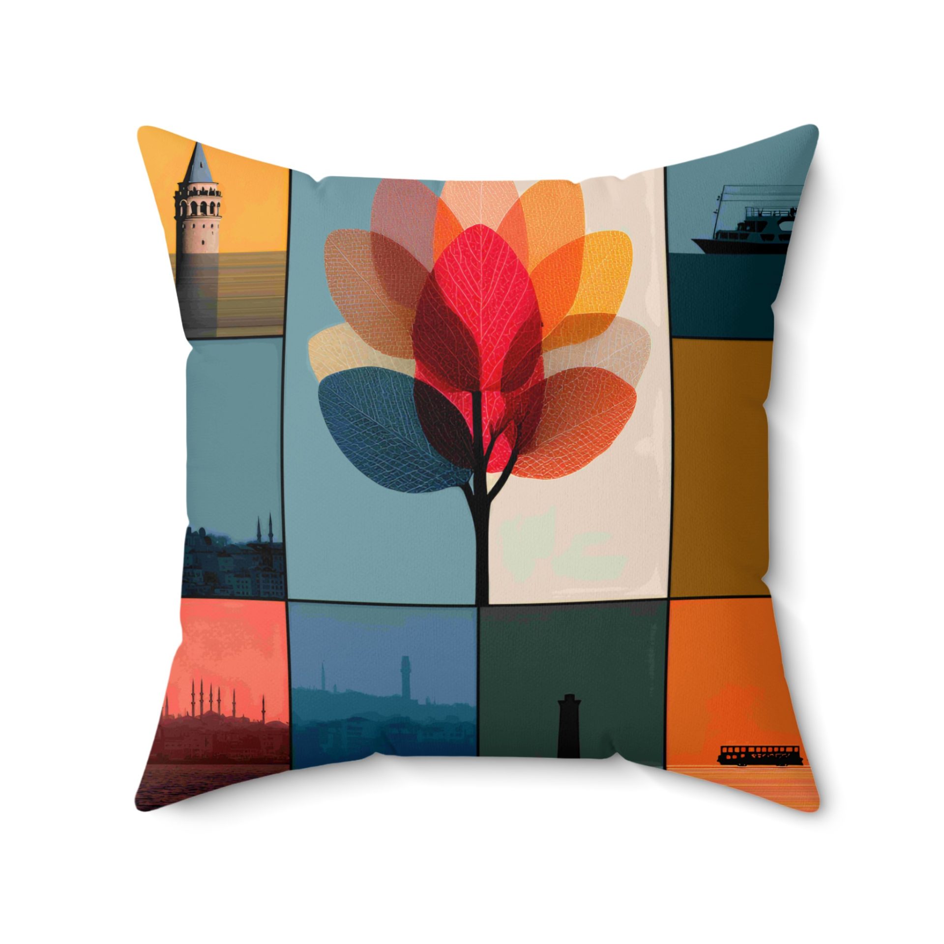 Elevate your home with our artistic pillows! Featuring a stunning composition of Istanbul landmarks and abstract leaf designs. A colorful way to add culture and modern flair to your decor.