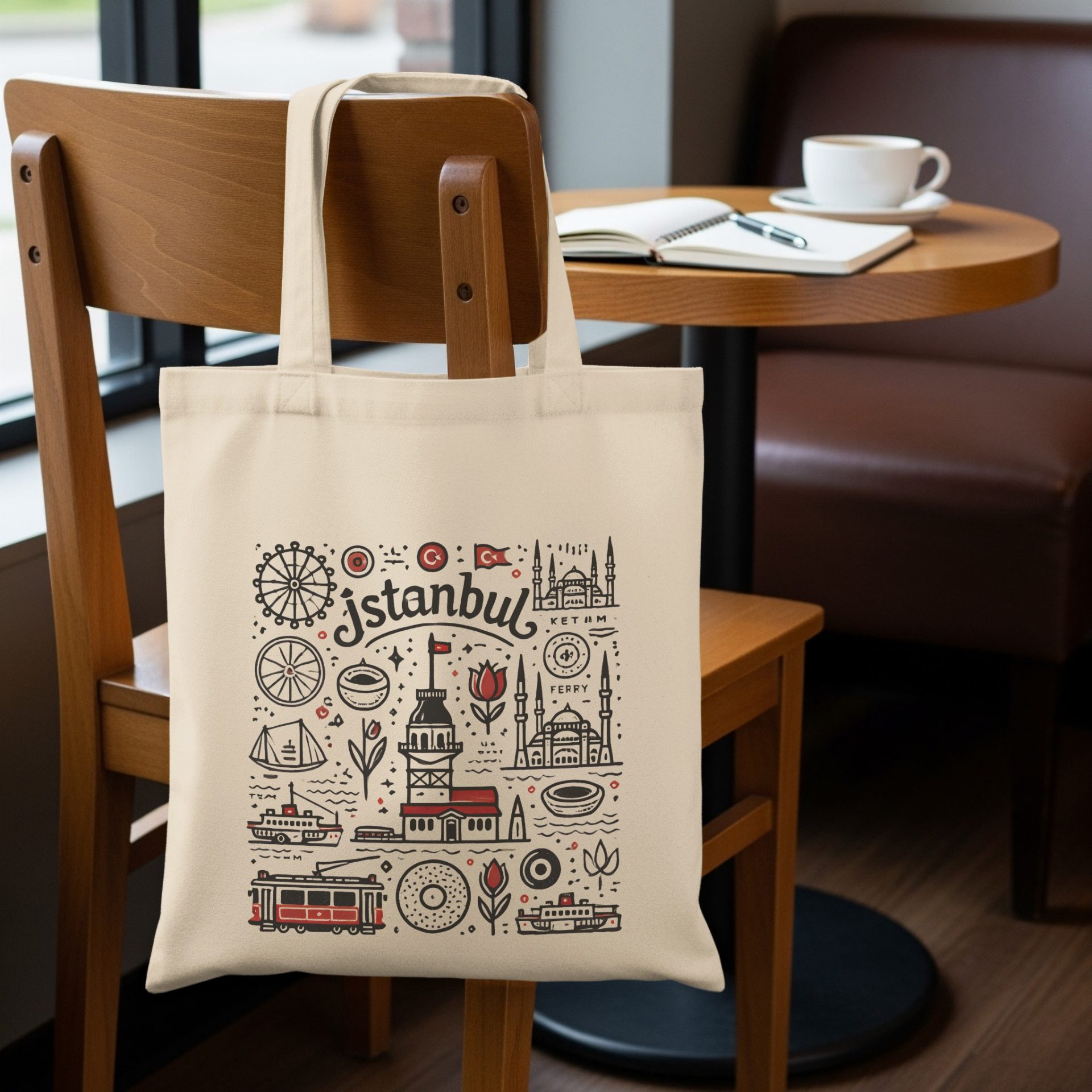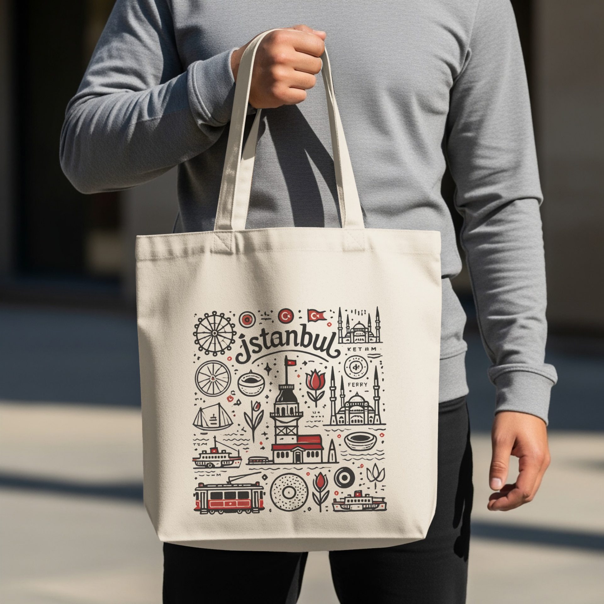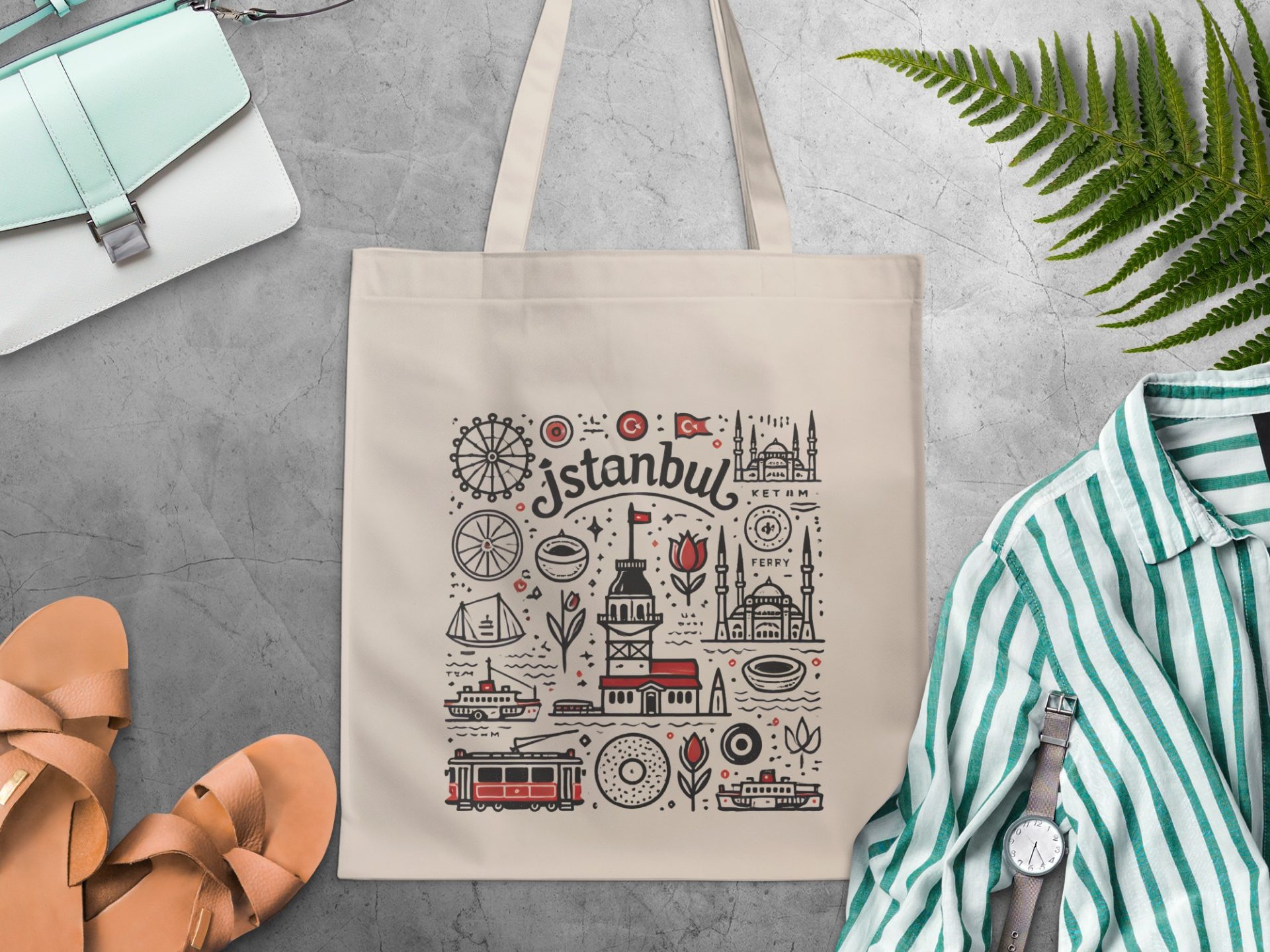 Showcase your love for Istanbul with this unique tote bag. Featuring iconic landmarks such as the Maiden's Tower and mosques this design is a perfect souvenir for travel enthusiasts.