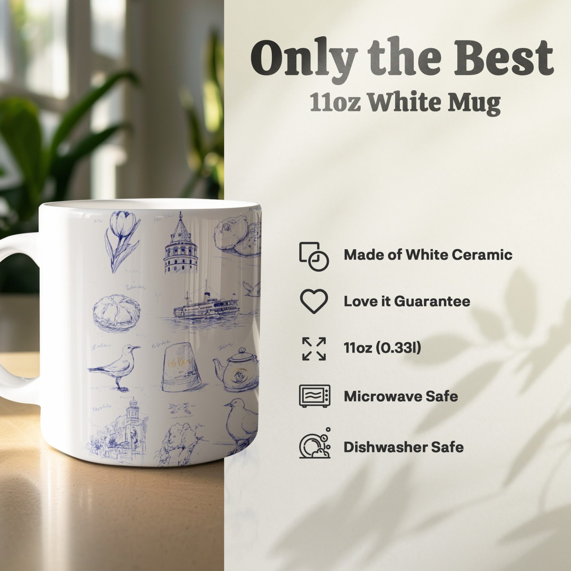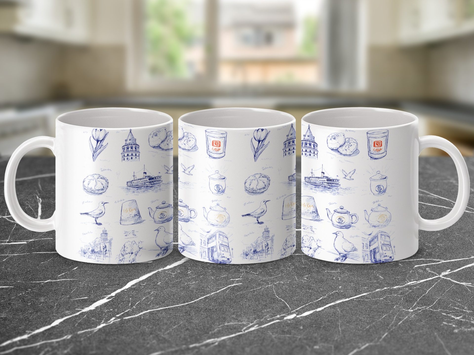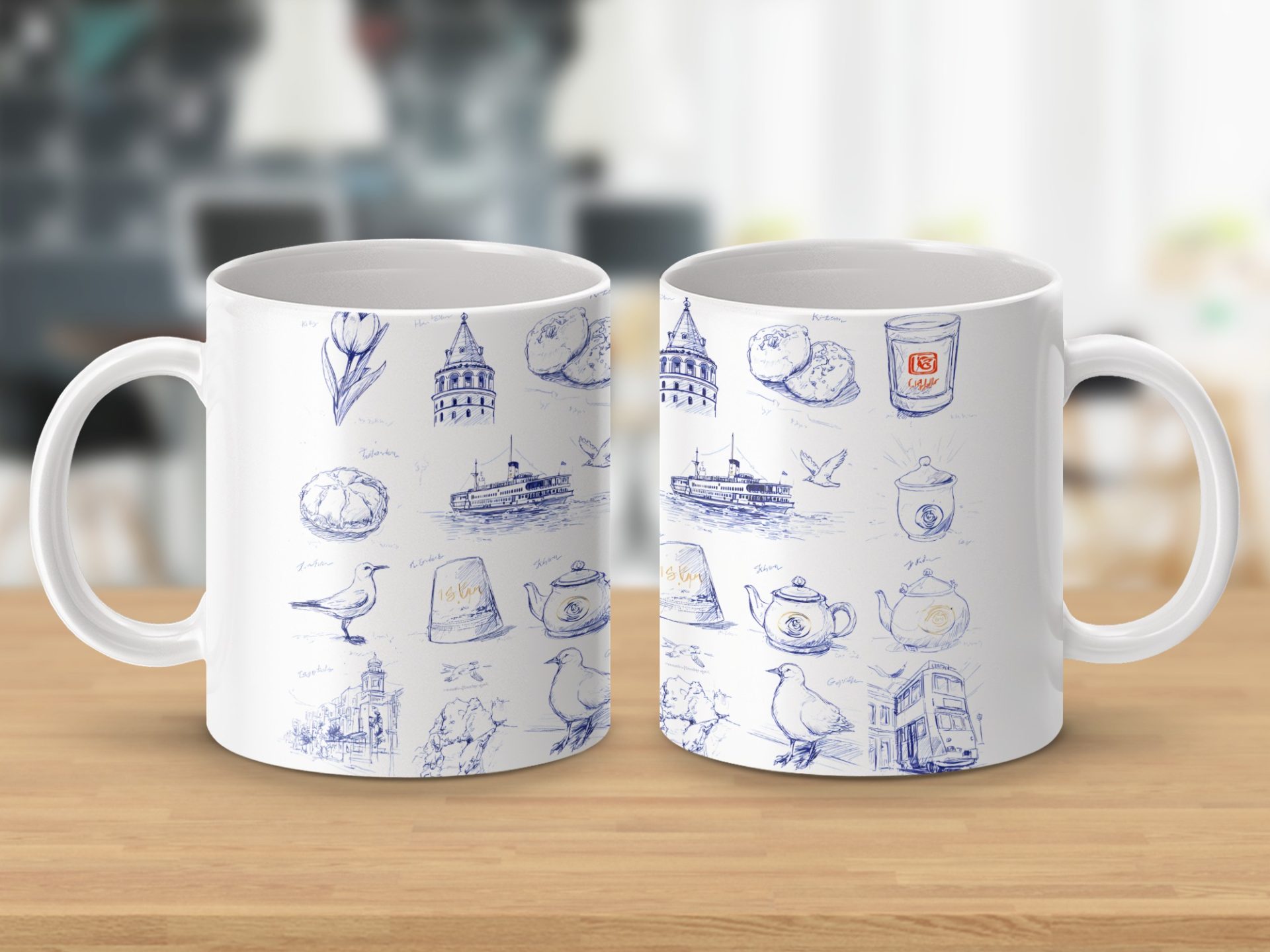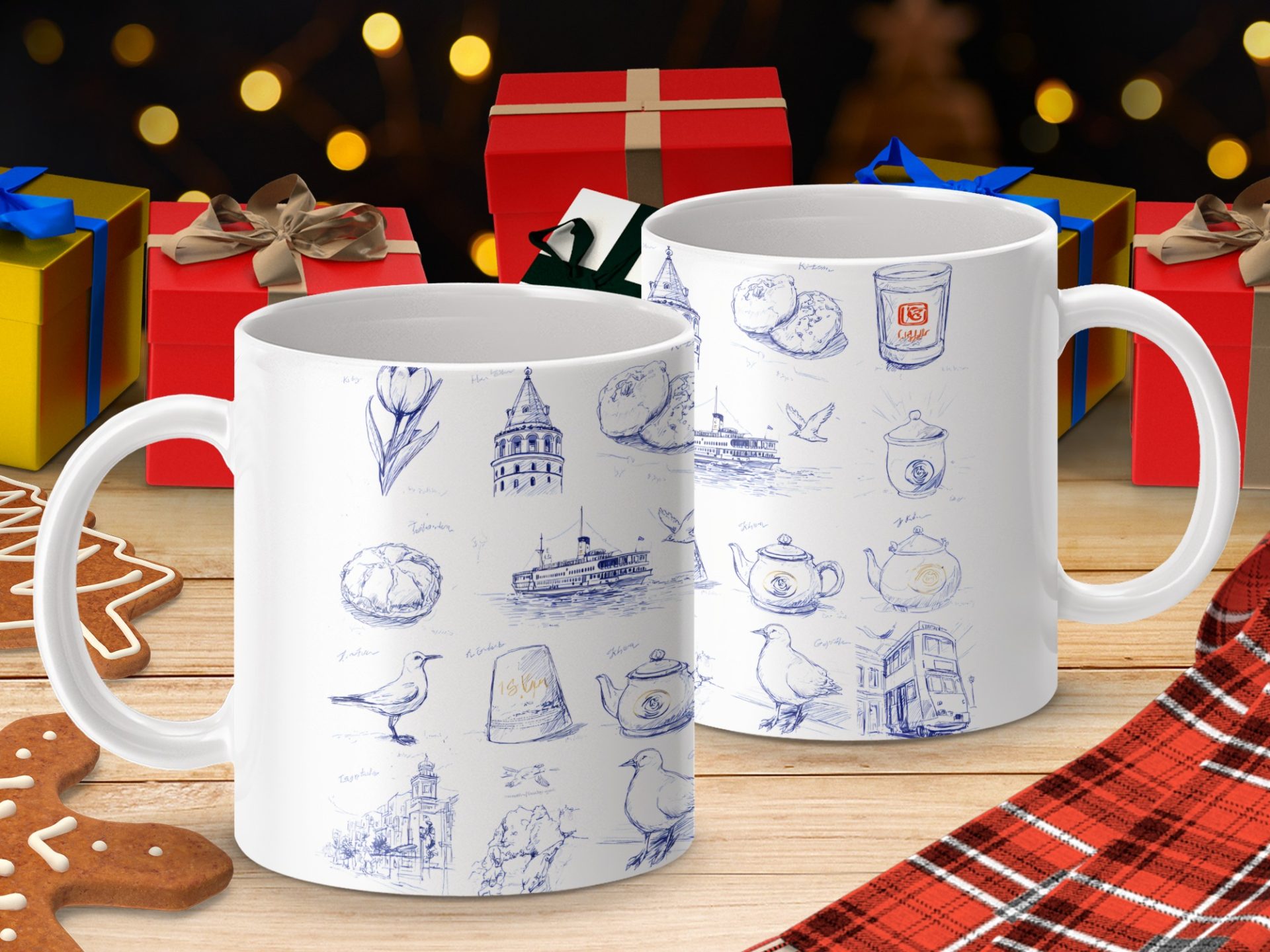 Discover this beautiful mugs featuring Istanbul sketches including tulip teapot seagull bus and more. Ideal souvenir for anyone who loves Istanbul drawings.