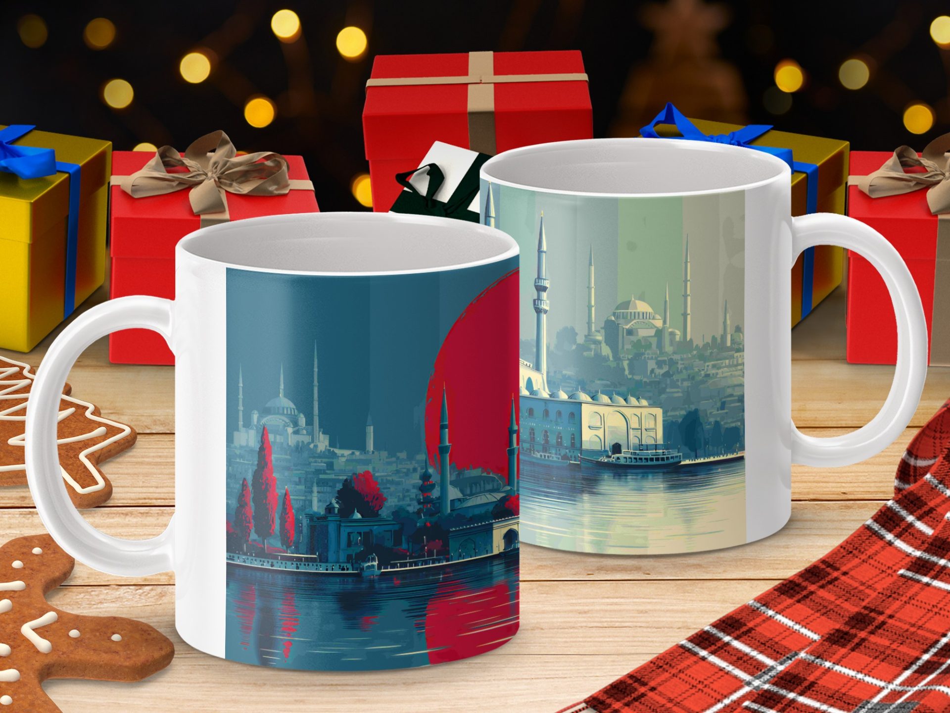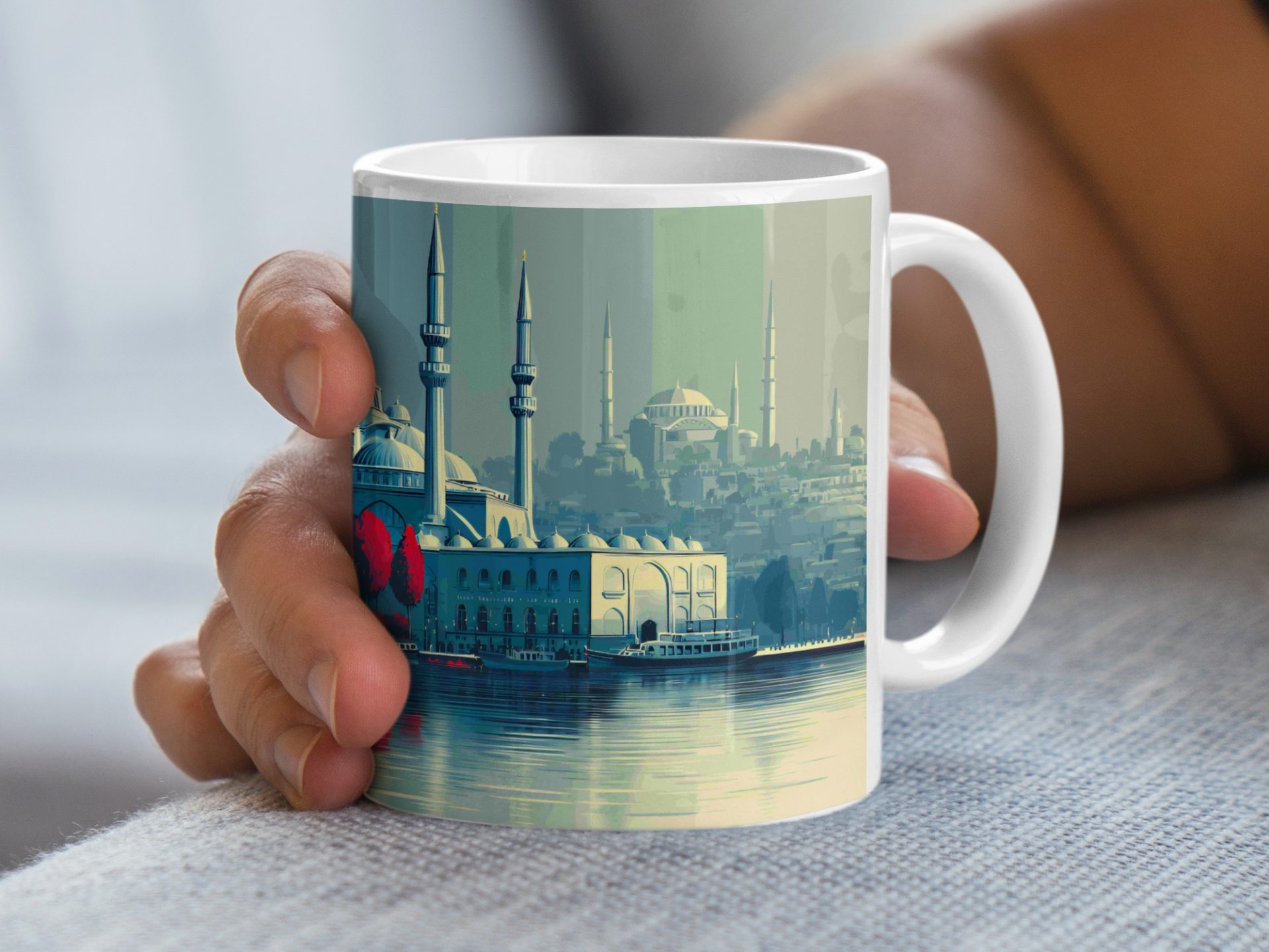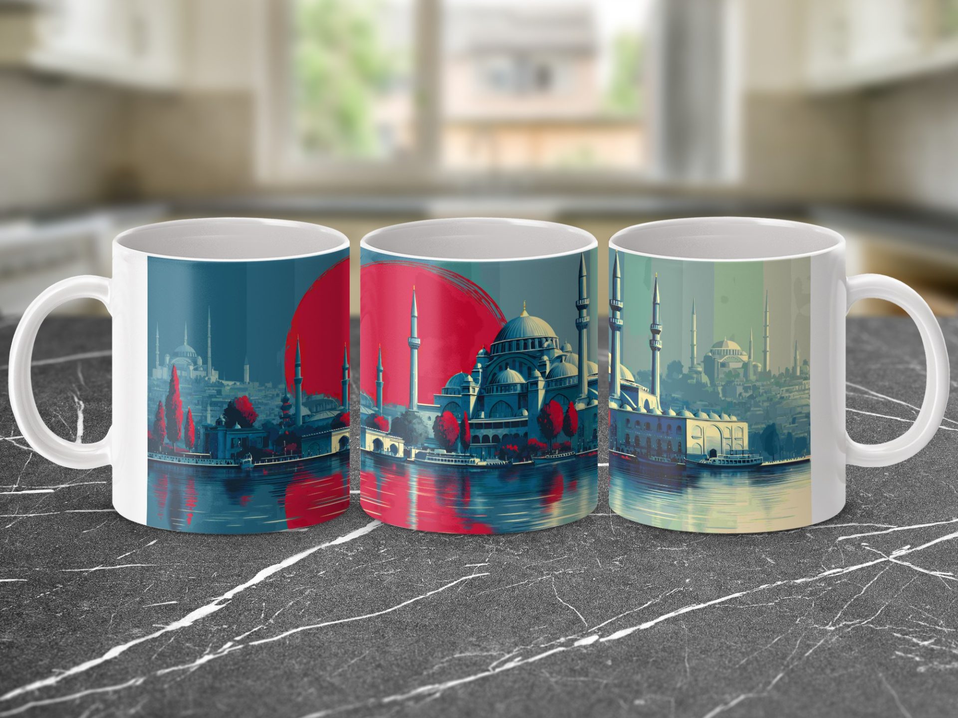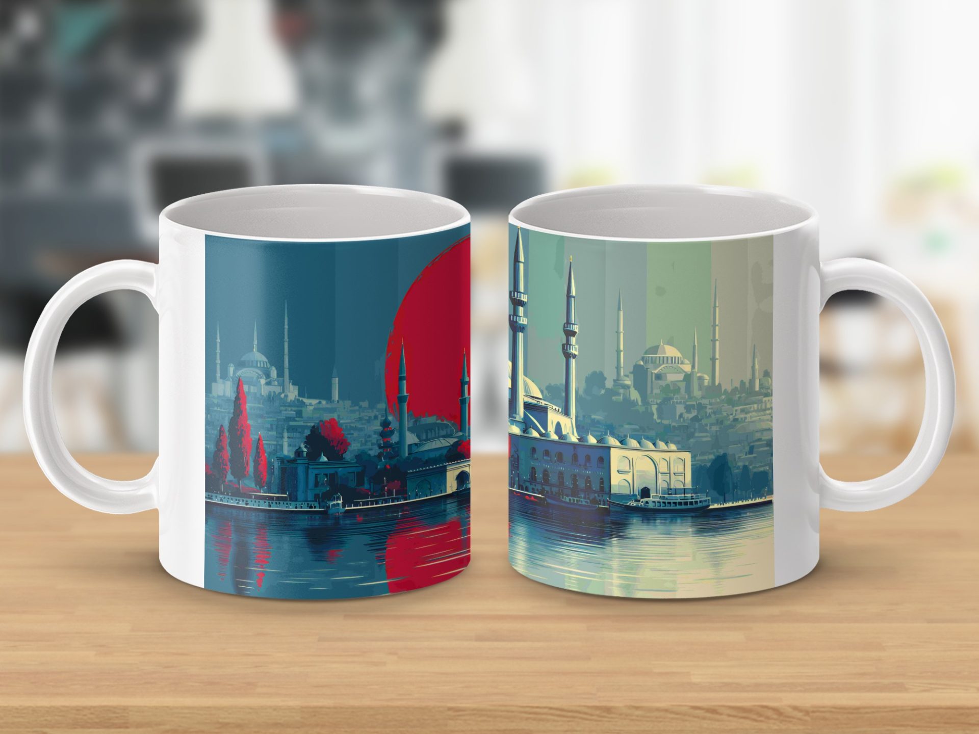 This mug shows a captivating Istanbul sunset reflecting off of the water with the iconic Blue Mosque and Hagia Sophia in the background. Order now for a perfect gift.